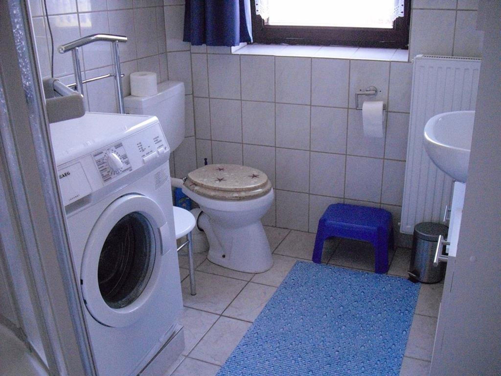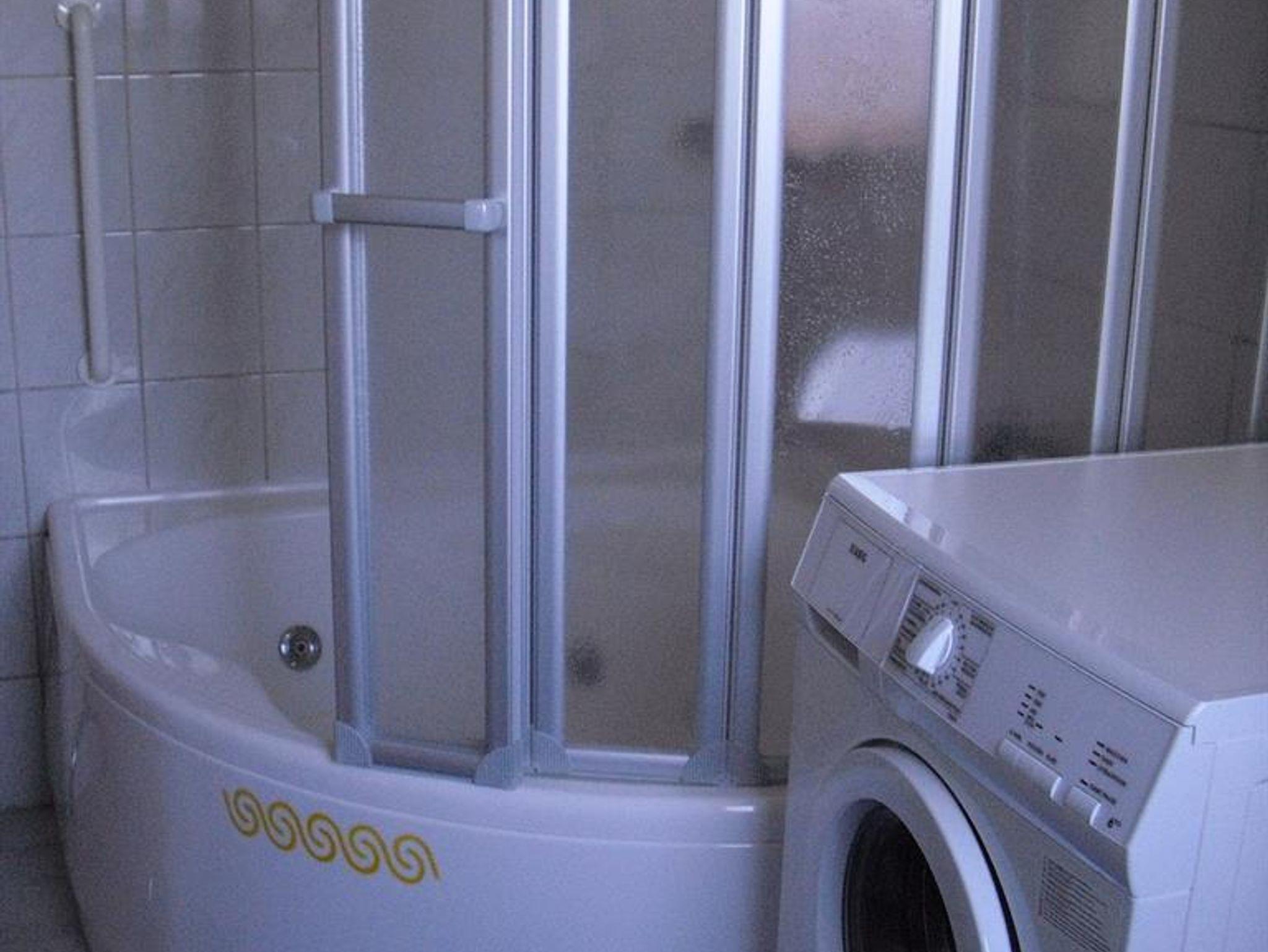 1x Badezimmer mit Duschwanne, WC und Waschmaschine