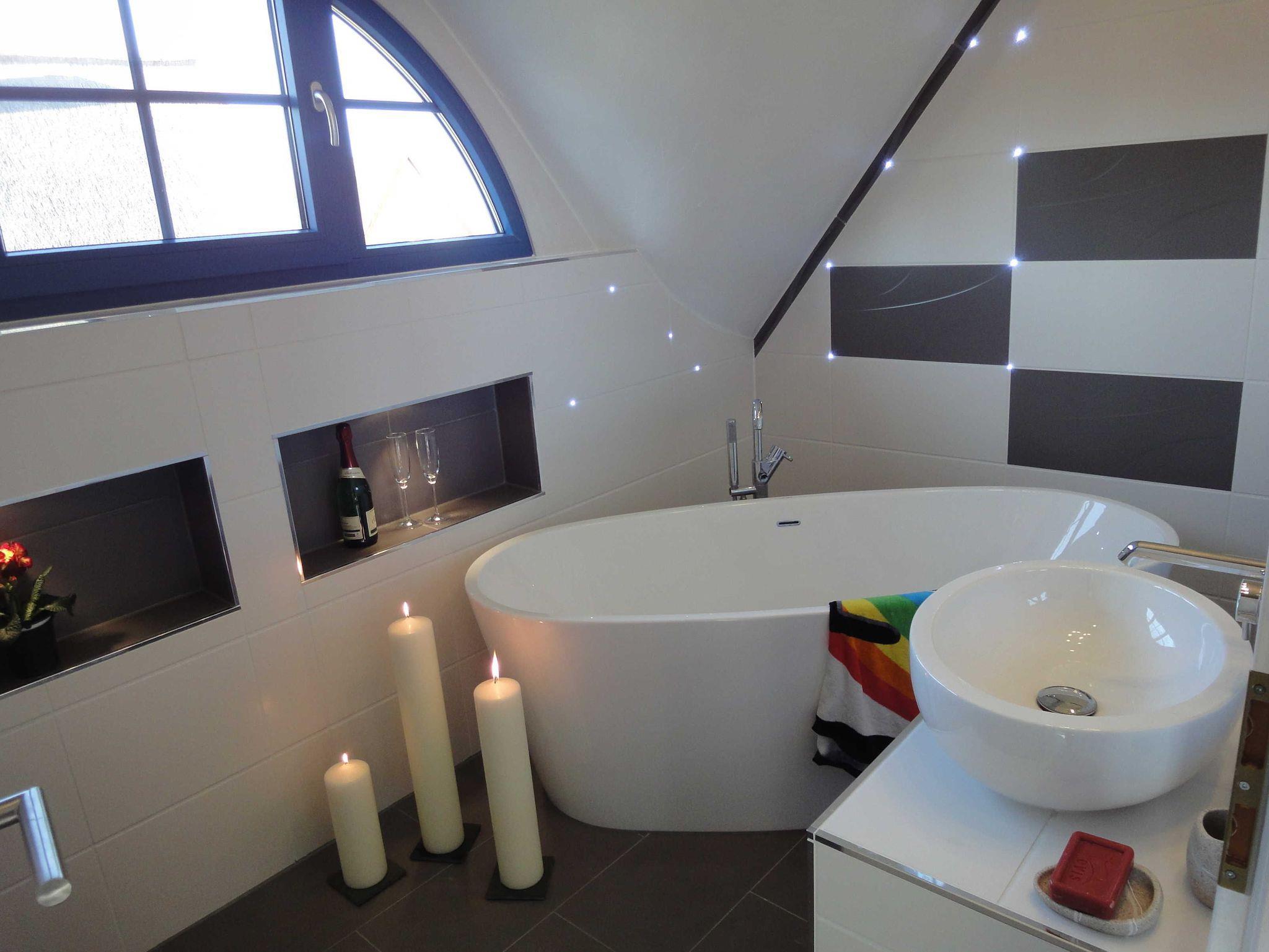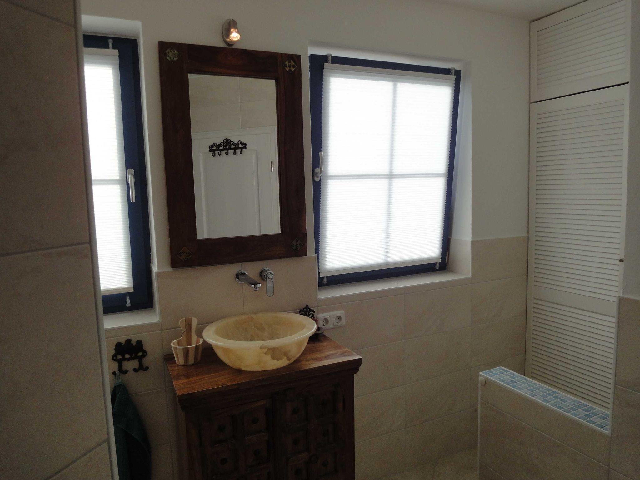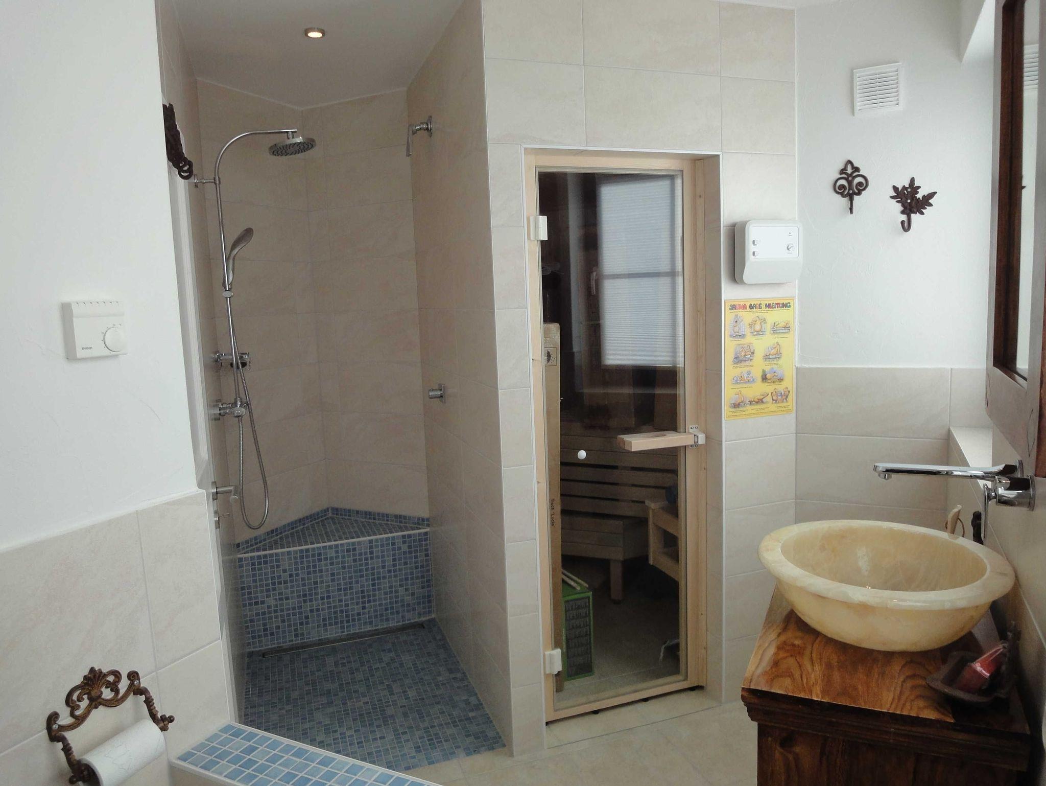 Zu romantischen Abenden lädt auch die freistehende Badewanne im Kerzenschein in einem der Bäder ein, oder lassen Sie sich vom eiskalten Brauseschwall nach der Sauna im unteren Bad erfrischen.