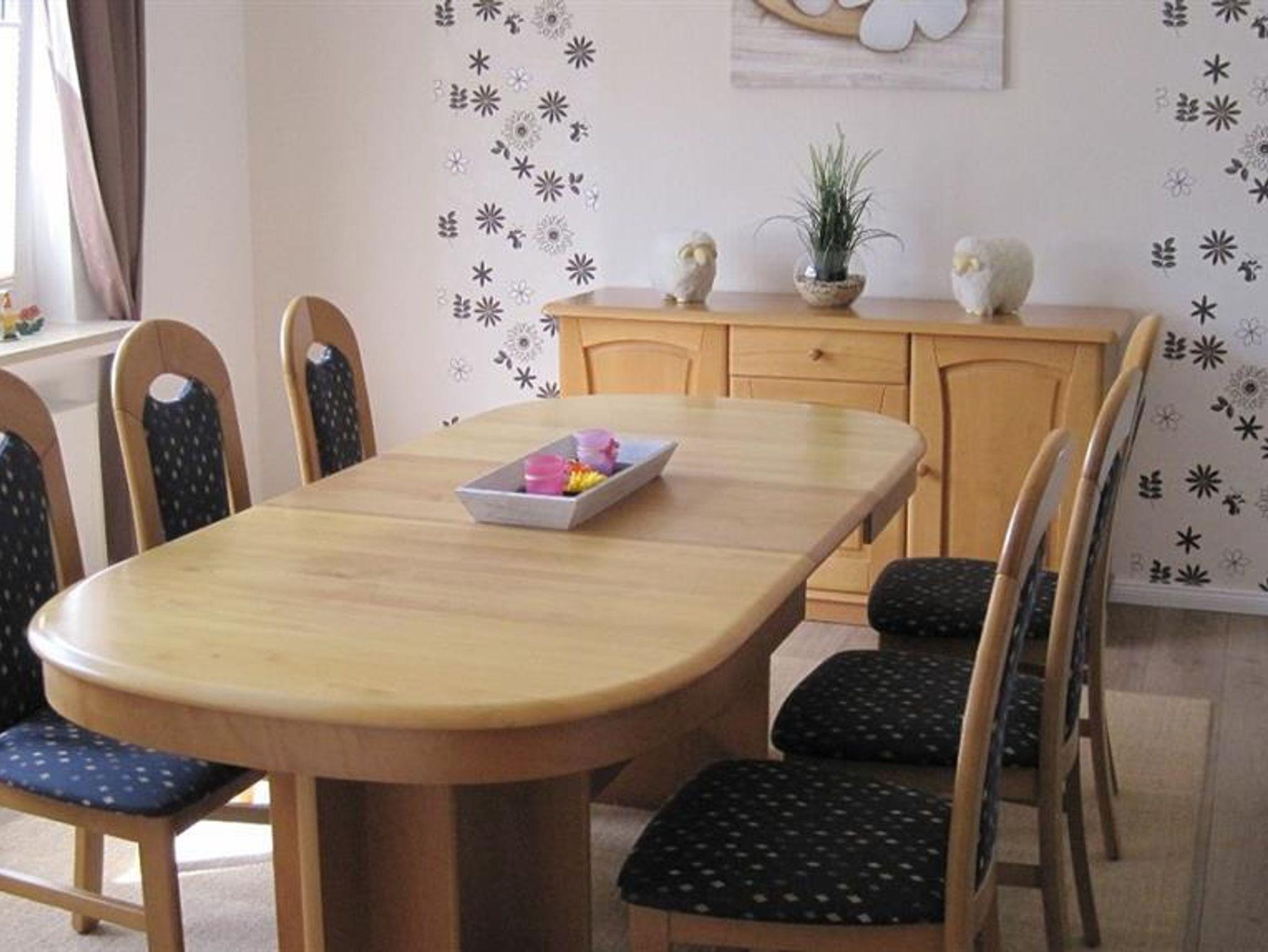 Das geräumige Wohnzimmer ist mit SAT-TV und Radio ausgestattet. Am Esszimmertisch finden alle Personen Platz.