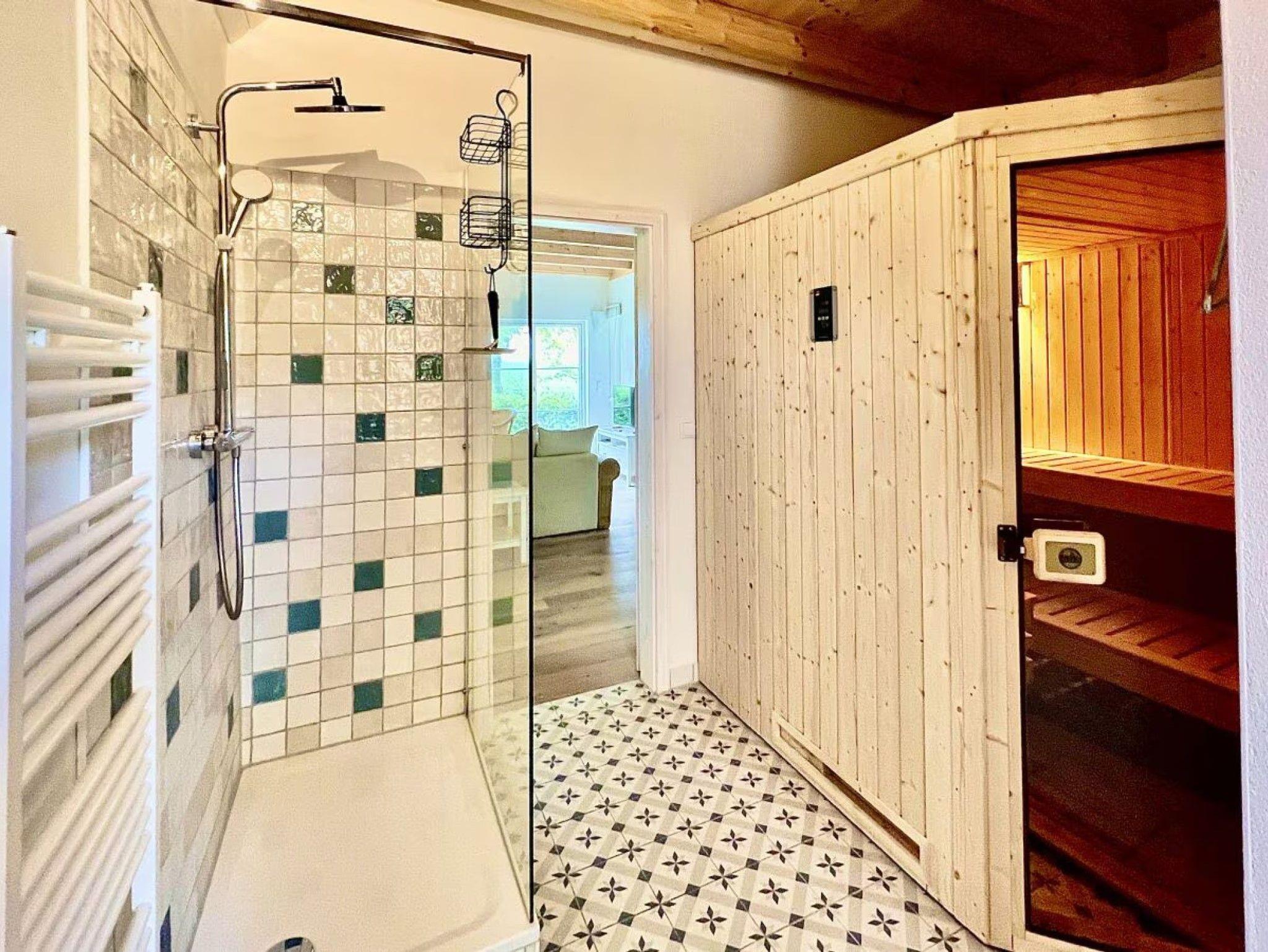 Das Haus ist von einem weitläufigen Garten umgeben, der mit einer großen Wiese und zahlreichen Bäumen ausgestattet ist. In diesem schönen Garten wachsen Obst- und Nussbäume. Direkt an den Garten schließt sich eine etwa 7.000 qm große Wiese an, die bis kurz vor den Bodden reicht. Der Garten wird von zwei imposanten Pappeln sowie Linden, Eschen und Fichten gesäumt, ergänzt durch Buschrosen und Obststräucher. An den Terrassen blühen verschiedene Blumen, die je nach Jahreszeit ihre Farbenpracht entfalten. An heißen Tagen bieten die Bäume, darunter der Walnussbaum, angenehmen Schatten, während die Sonnen-Pavillons zum Verweilen einladen. Auf dem Grundstück befindet sich zudem ein alter Brunnen. Im Sommer erfreuen sich die Besucher an der Vielzahl von Singvögeln, während Greifvögel und in der Dämmerung auch Waldkäuze und Fledermäuse um das Haus kreisen.