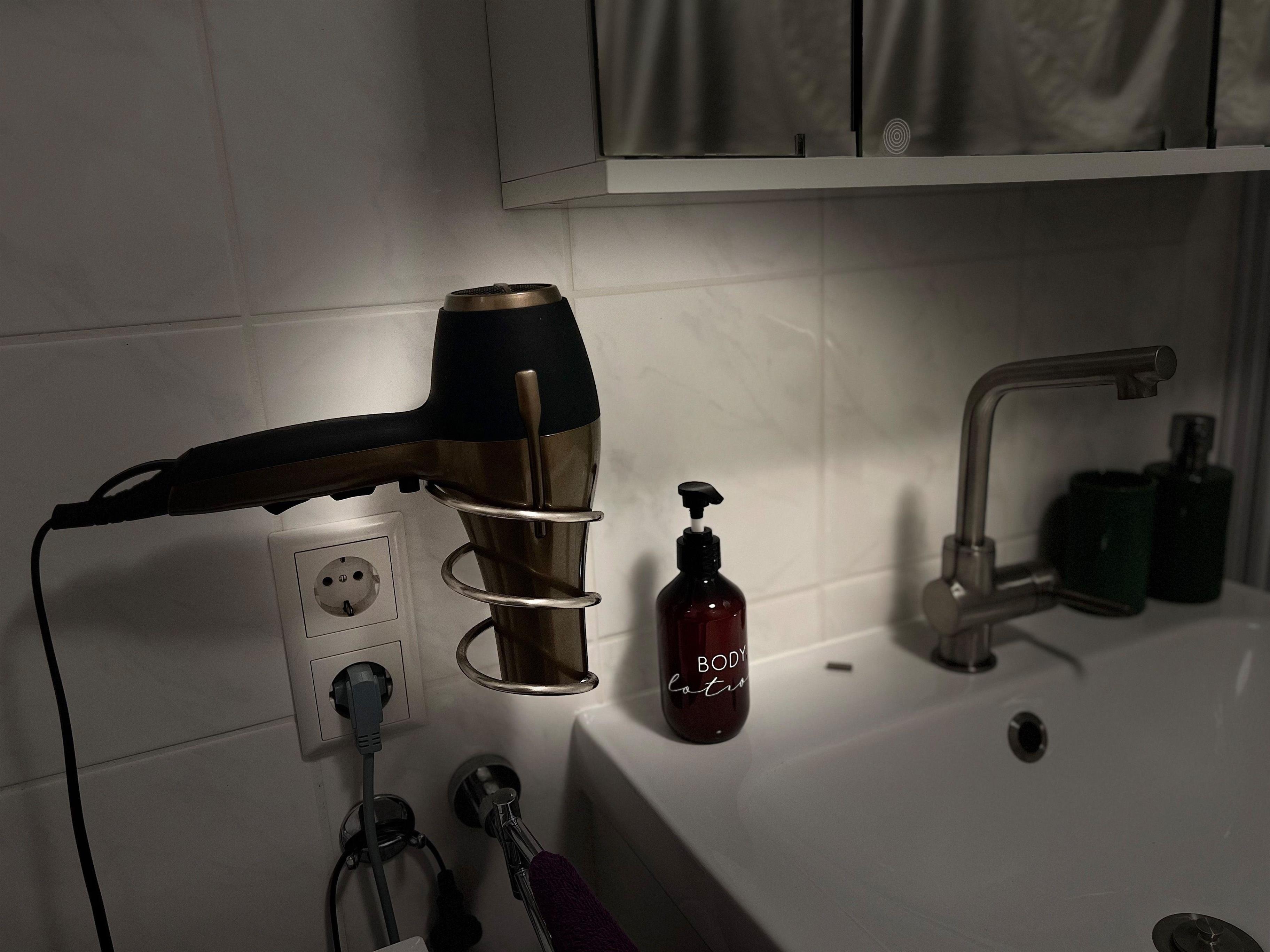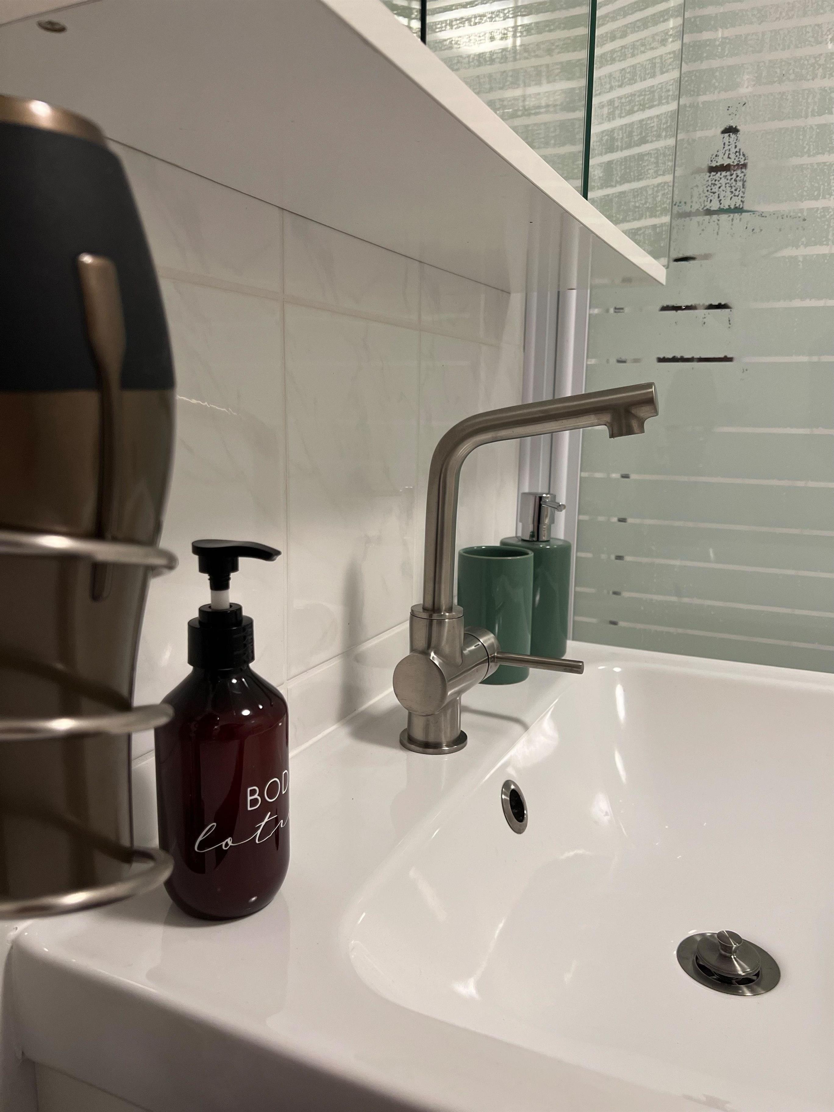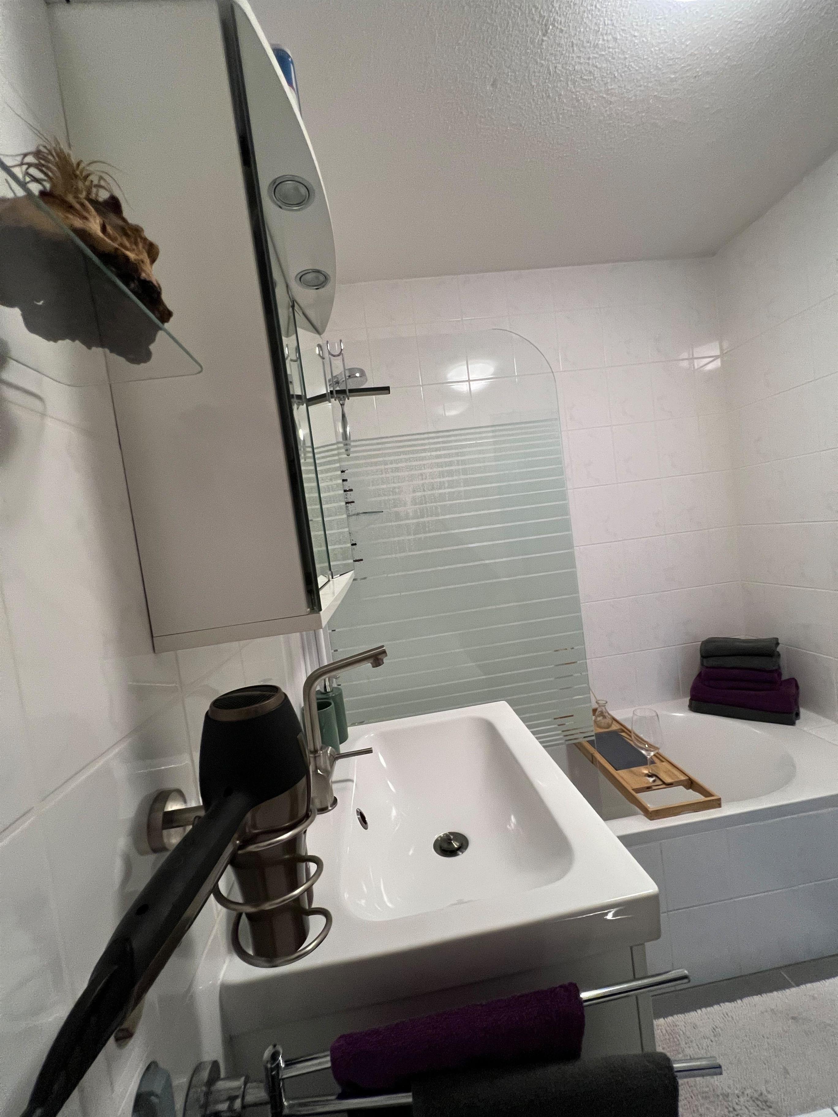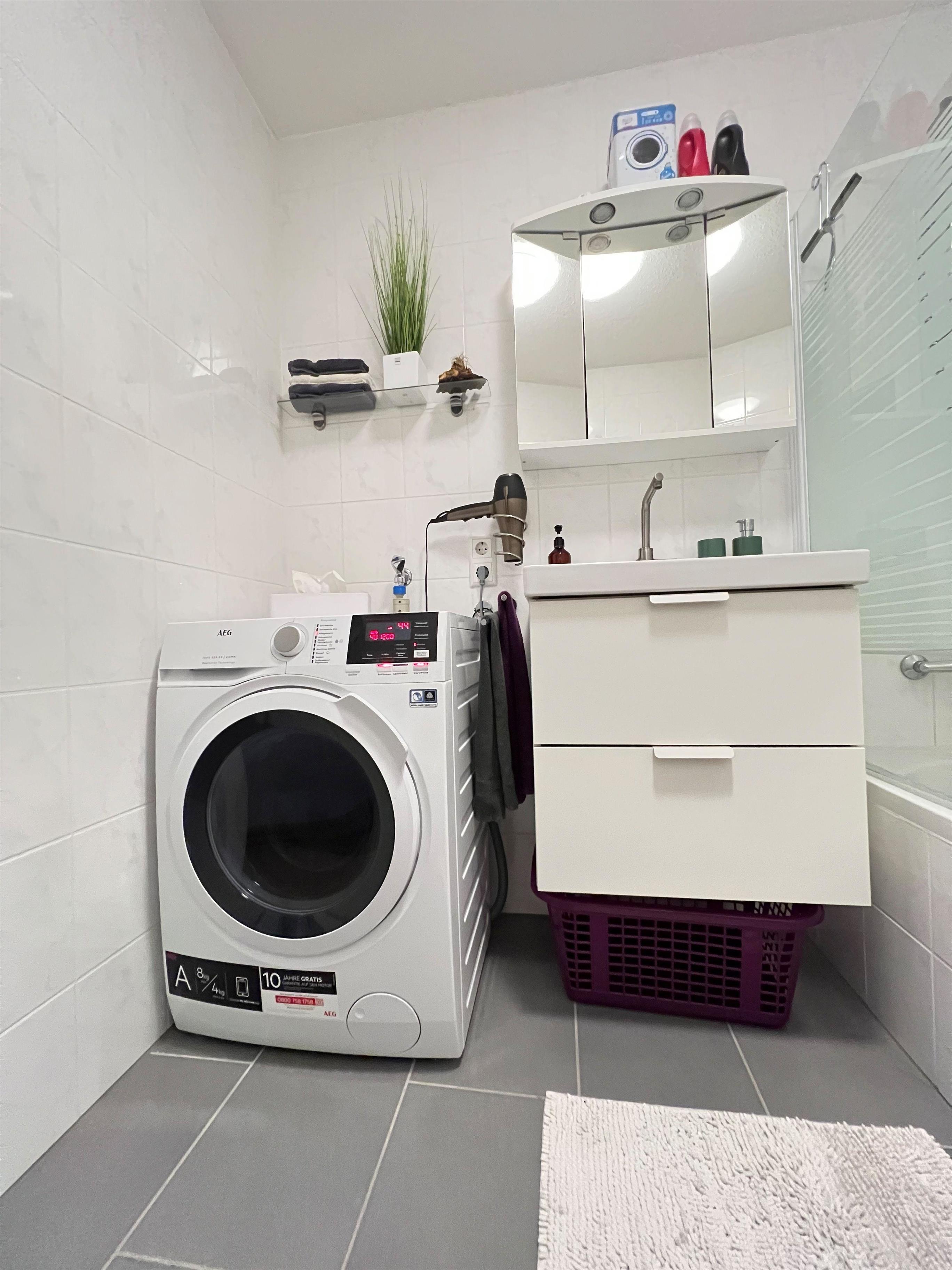 Das Badezimmer verfügt über eine Duschwanne, ein Waschbecken mit Spiegelschrank und einem Waschtrockner. Das WC befindet sich separat. Außerdem stehen Ihnen noch ein Bügelbrett, Bügeleisen und Wäscheständer zur Verfügung.