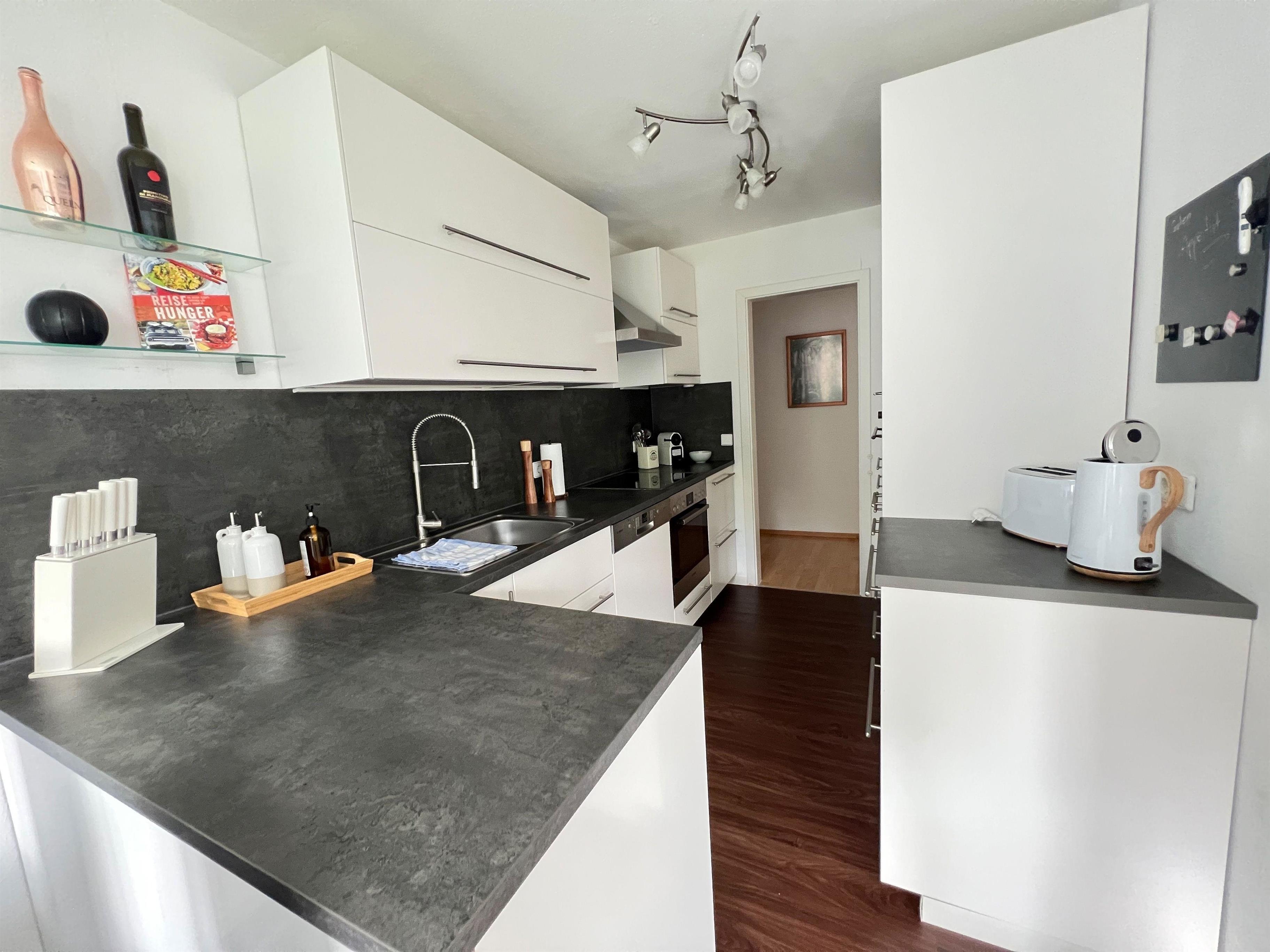 Die große Küche mit angrenzendem Essbereich ist vollausgestattet mit allem was Sie für die Zubereitung von leckeren Gerichten benötigen: