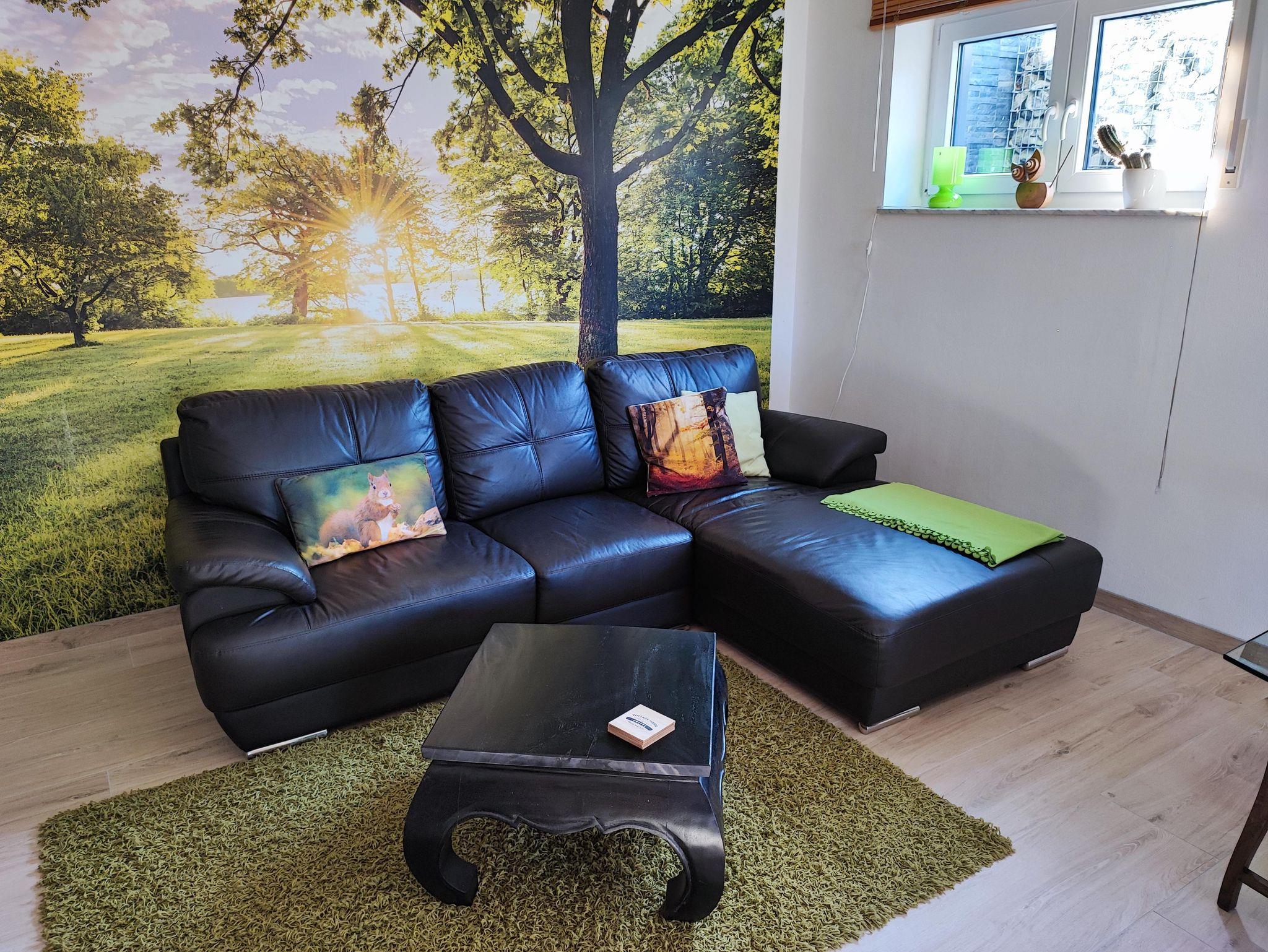 Auf einem Wohnraum mit 50m² finden Sie alles was Sie für einen angenehmen Aufenthalt benötigen. Unsere Nichtraucherwohnung ist mit einer hochwertigen Küche (Mikrowelle, Backofen, Wasserkocher, Eierkocher, Handmixer, Gewürzen, Kühlschrank, Gefrierschrank, Kaffeemaschine, Staubsauger usw.), einem Schlafzimmer, einem Bad mit Dusche und sogar mit einem Kamin im Wohnzimmer (incl. 1 Korb Brennholz gratis) ausgestattet. Das Doppelbett hat eine Größe von 1,6 x 2,00 Meter. Freies WLAN und Sat-TV sind natürlich ebenso vorhanden wie Handtücher und Bettwäsche. Zum Zeitvertreib ist auch eine Spielekonsole Nintendo mit diversen Spielen vorhanden. Zusätzliche Decken und Kopfkissen können auf Wunsch bereit gestellt werden. Alle Räume sind mit hochwertigen Fliesen und mit Fußbodenheizung ausgestattet. Zur Wohnung gehört auch eine Terrasse, auf der Sie gemütlich ausspannen können. Ein abschliessbarer Abstellraum (Garage) sowie ein kleiner Spielplatz sind ebenfalls vorhanden. Leider können wir keine Hunde aufnehmen.