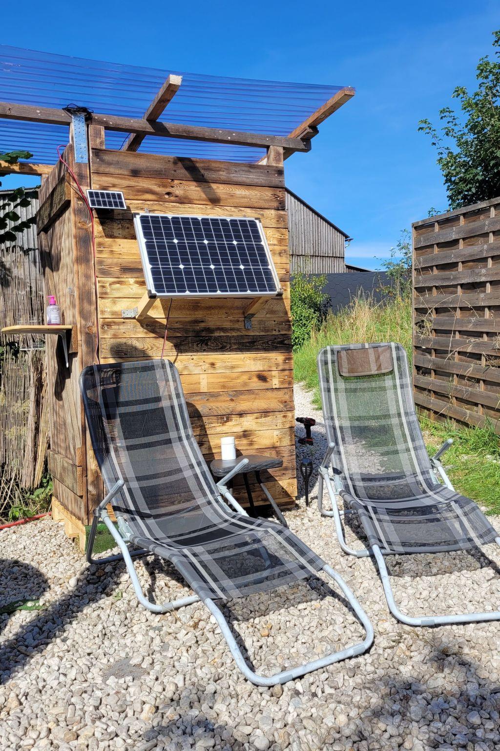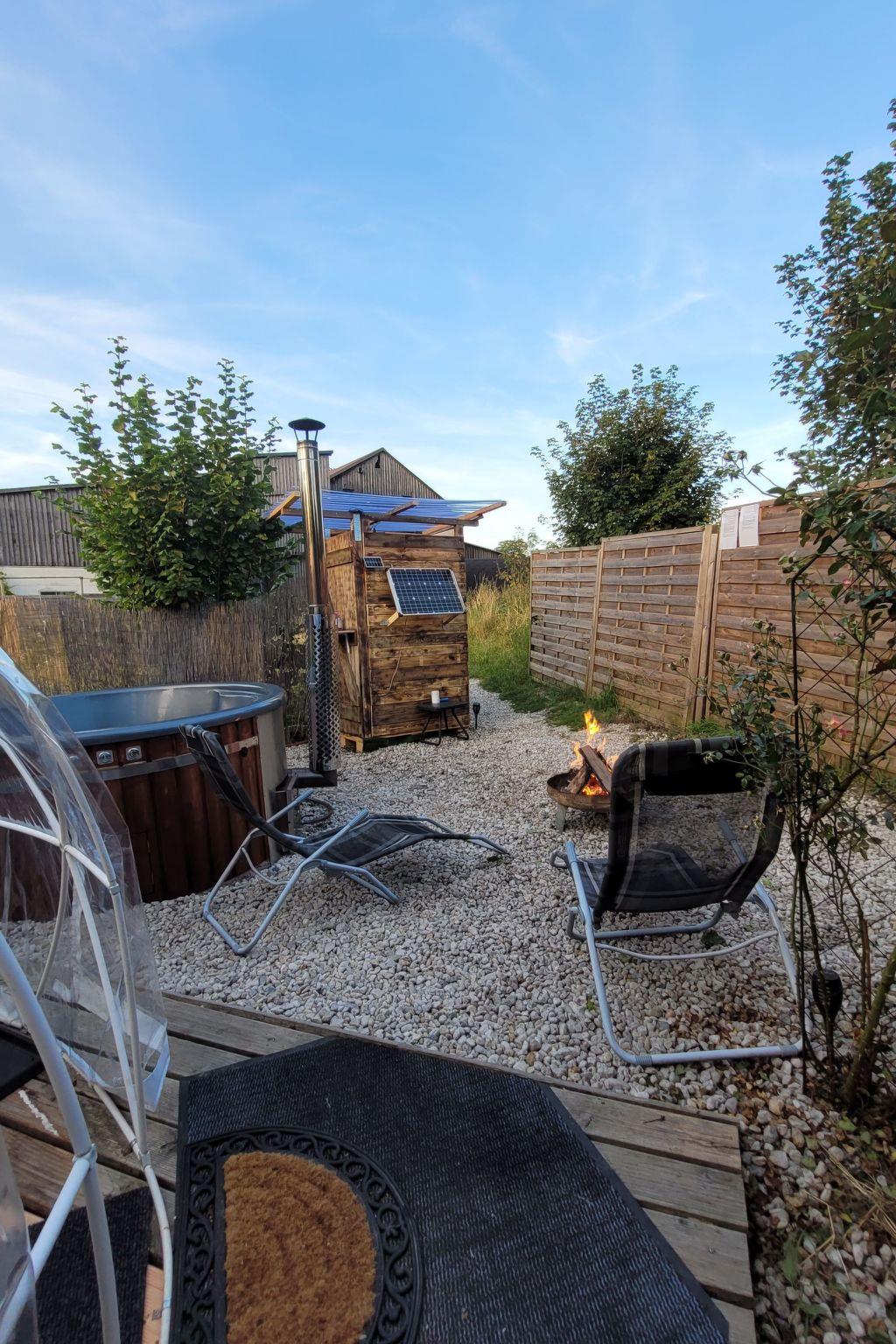 ? A special highlight is the wood-heated hot tub with bubble and hydromassage system and underwater lighting. Treat yourself to this unique wellness experience under the starry sky. The hot tub is filled with fresh water and is therefore completely chemical-free. Of course, it is available for exclusive use when you book. On request, Andy - our host on site - can preheat the hot tub for you. He would appreciate a small tip for the effort. Otherwise, you can heat up the hot tub yourself and should allow around three hours for this. There is a privacy screen around the hot tub and the entire accommodation, which guarantees the necessary privacy.