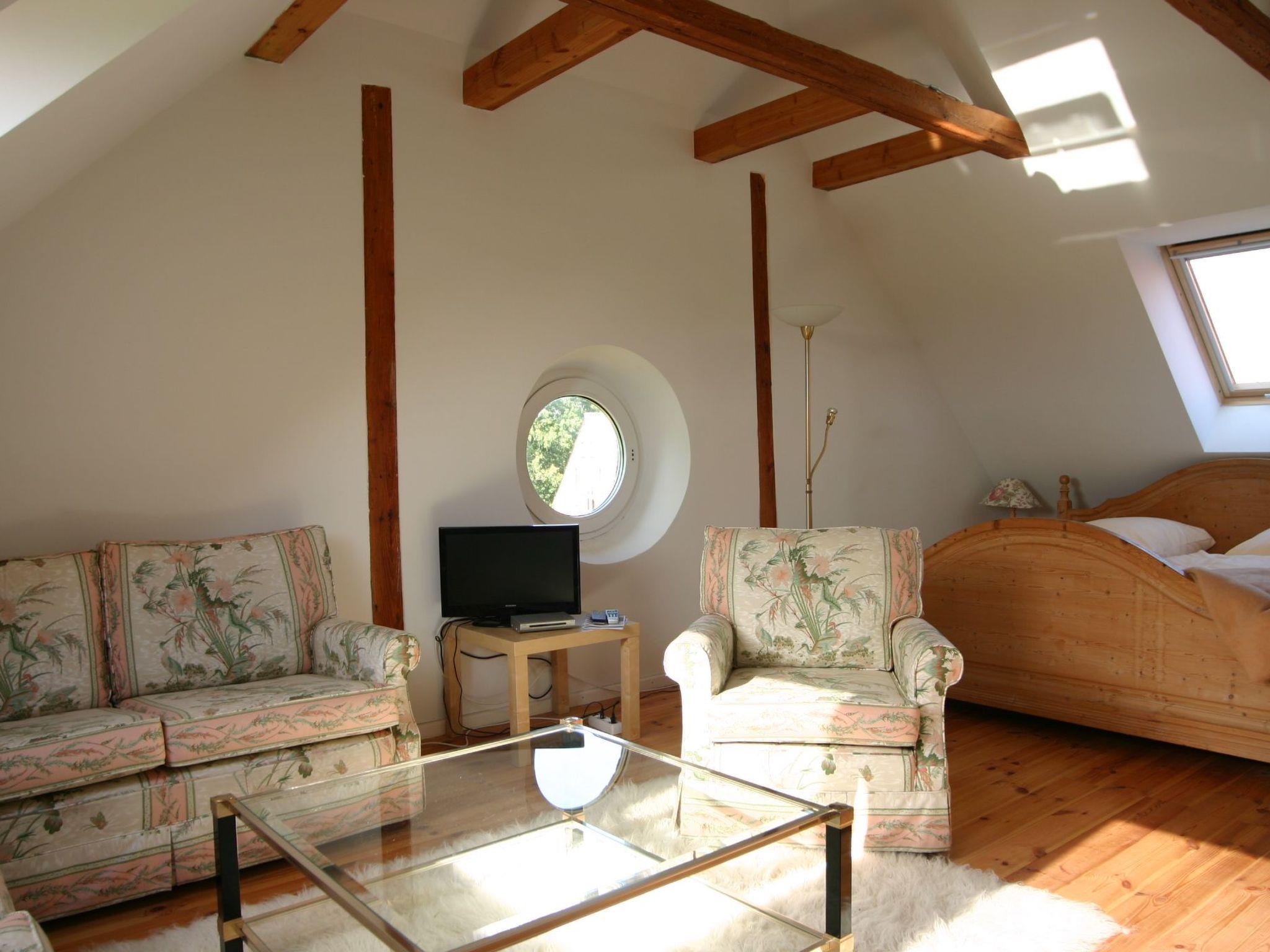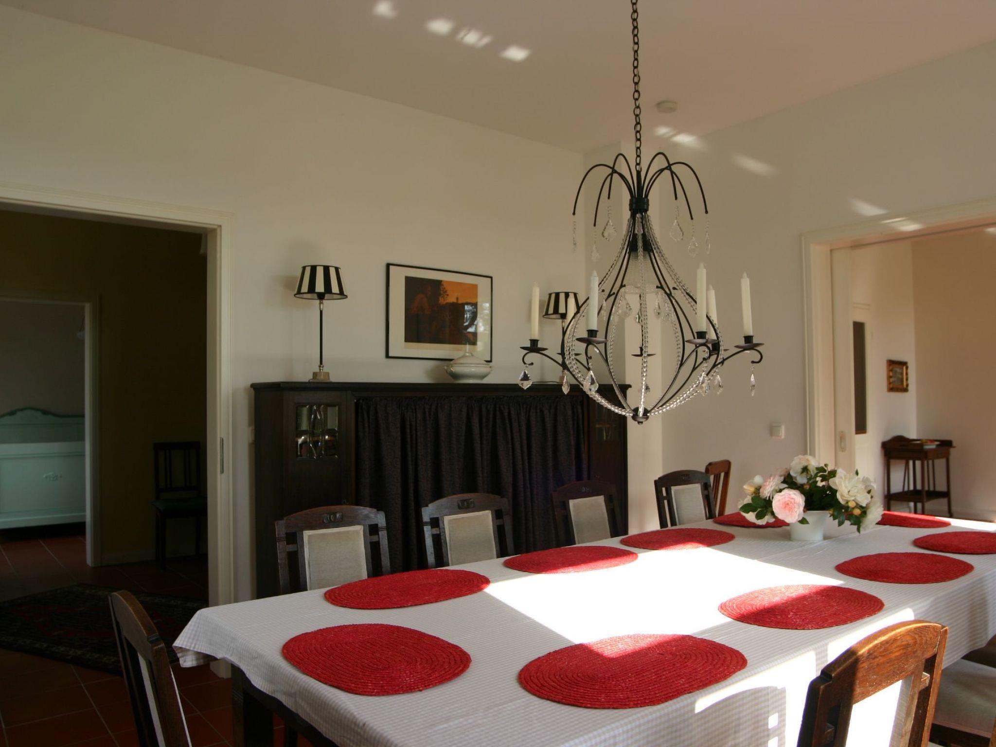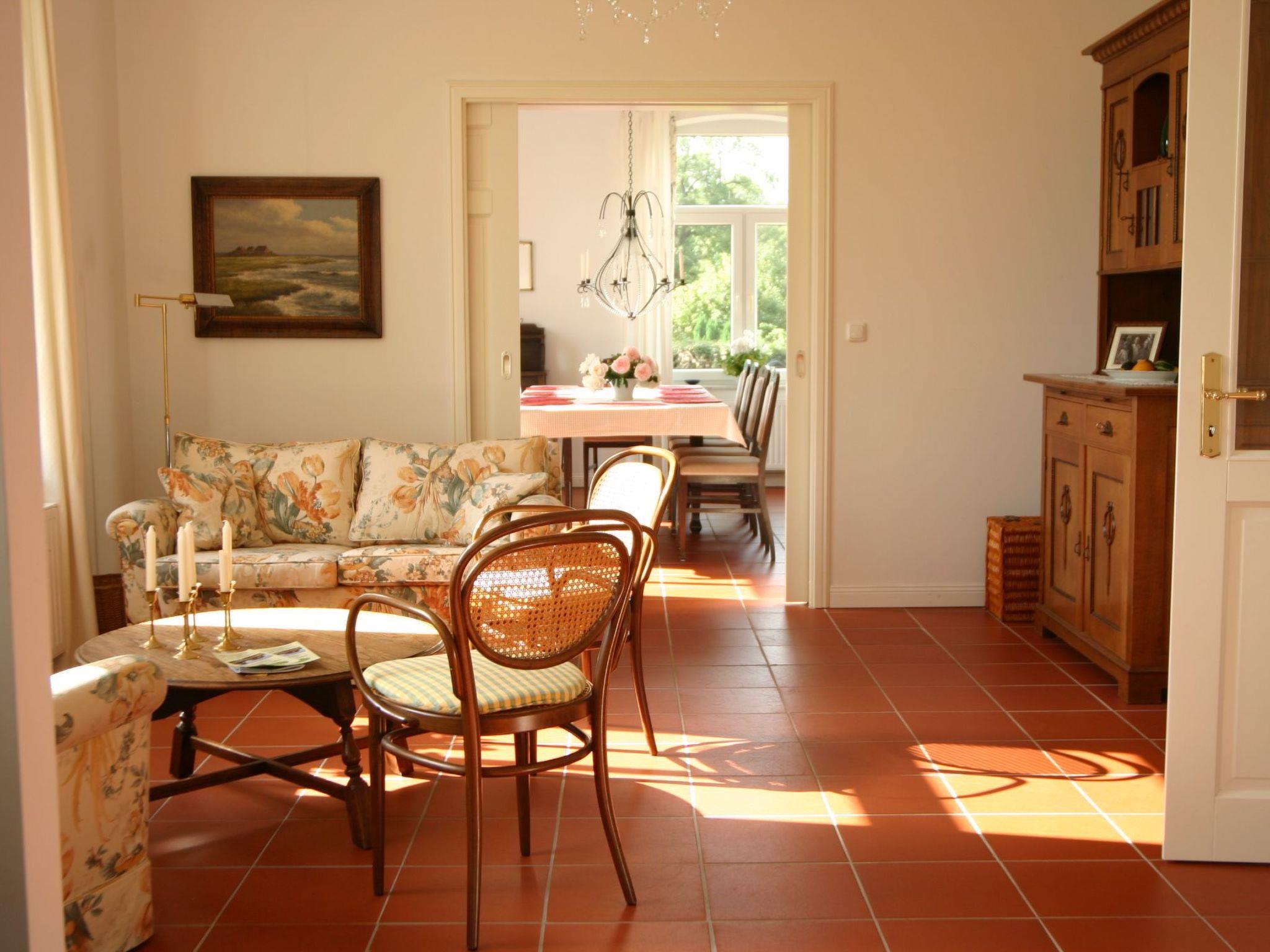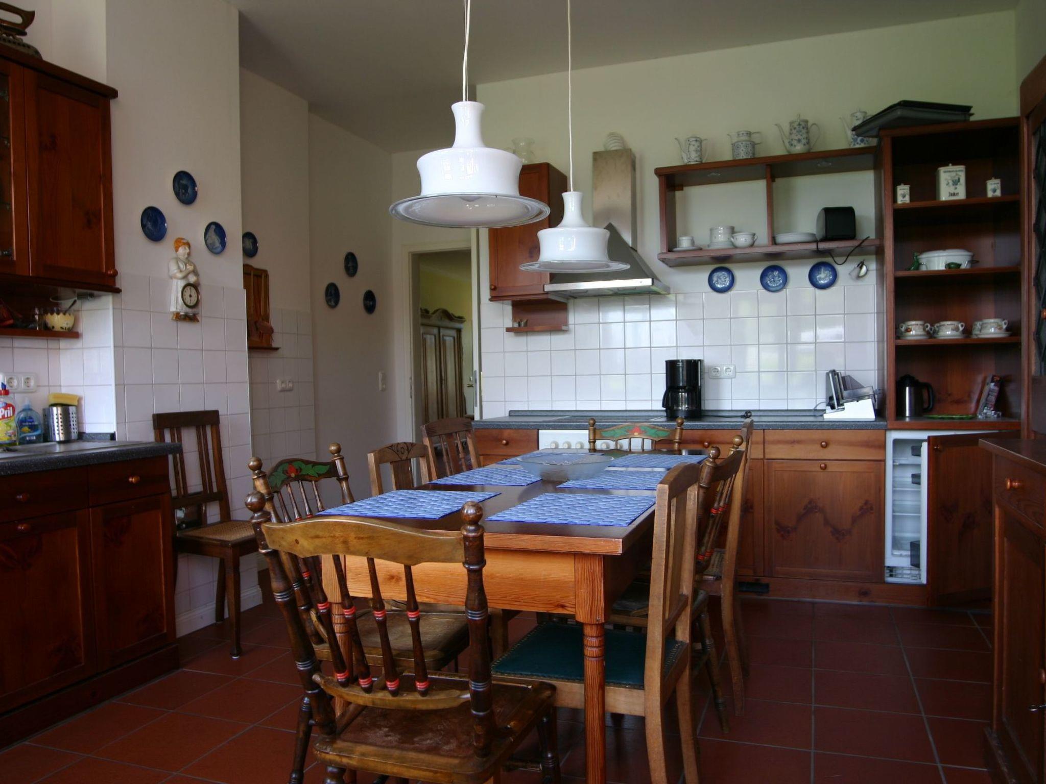 The house is furnished in Art Nouveau style in many areas, but equipped with modern comforts. (e.g. Internet, partly underfloor heating) Ground floor: In the three-part 80 square metre living area with grand piano and white Swedish Art Nouveau stove you will find the Art Nouveau furniture, 2 upholstered seating groups for approx. 20 people as well as a library and a TV area. In the dining room, 16 people can be seated at a table with a view of the wide Elbe meadows. The large hallway is often used as a buffet room, dance hall or children's play area. There is a double bedroom (200x200 beds) on this level, next to it a bathroom with bath and shower and 2 washbasins as well as 1 washing machine and a further shower room.in the kitchen, hobby cooks like to create a special meal on two cookers (with oven) at the same time. 2 additional fridges with freezer are available in the adjoining room.1st floor double bedroom (200x200) with single bed and children's bed double bedroom (200x200) with single bed, sofa bed for 1-2 persons, additional extra bed or children's bed possible double bedroom (200x200) with single bed and children's bed, additional extra bed possible billiard room, approx. 50 square metres with 2 double sofa beds for 3-4 persons, 2 additional extra beds are possible. The 9ft billiard table forms the centrepiece of this popular room, which is furnished with two upholstered seating areas and a football table, children's toys and other art nouveau furniture.2nd floor studio flat with bathroom and kitchenette, double bed (200x200) and pull-out bed 180x200 for 2 people, cot possible or extra bed.studio flat with shower room, kitchenette, double bed 200x200 and single bed 90x200 extra bed and cot possible.