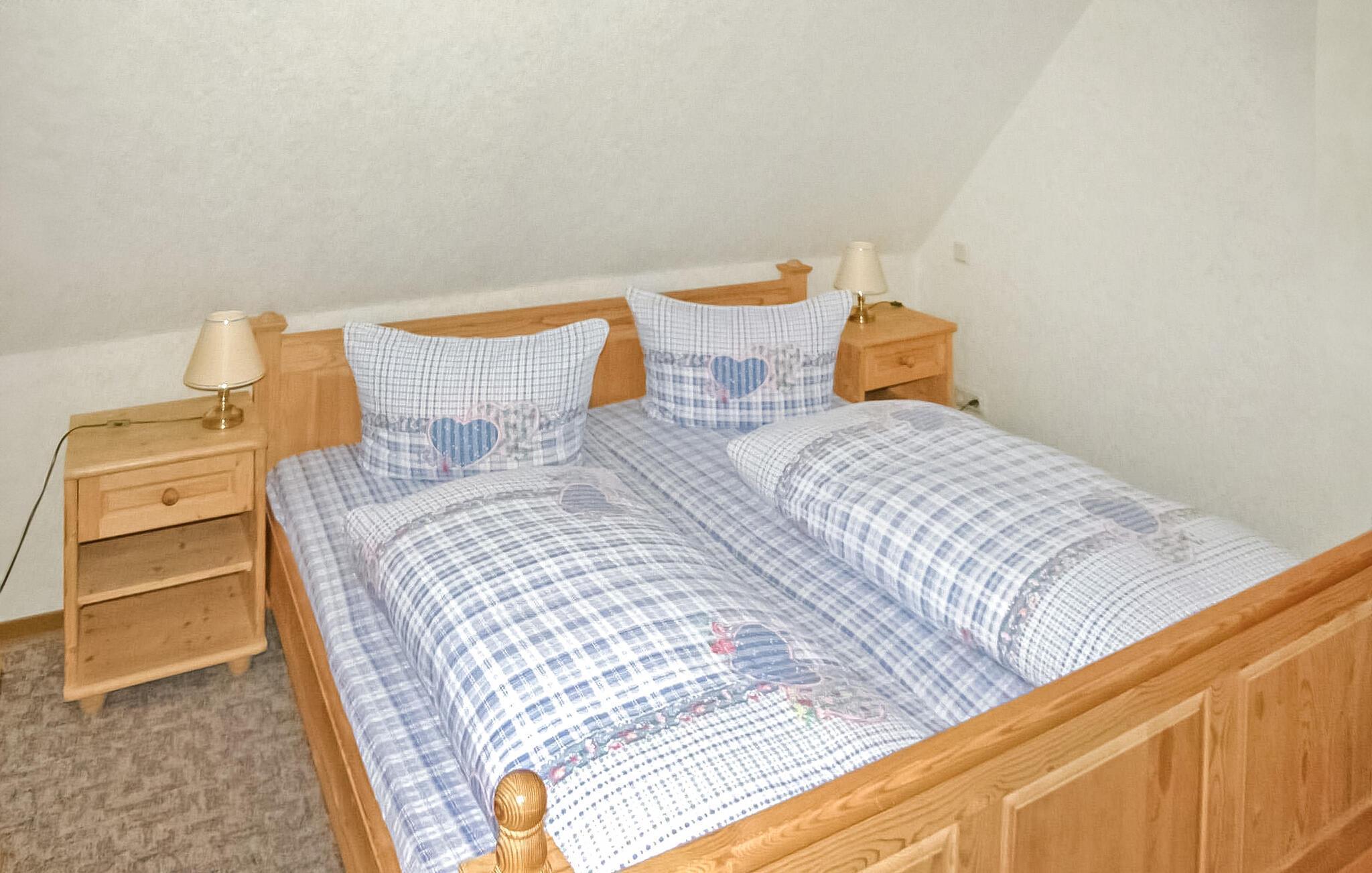 Die 30 qm große Wohnung für bis zu 4 Personen befindet sich im Dachgeschoss des Hauses, werden zentral beheizt und ist ausgestattet mit Wohnzimmer (Doppelbett-Couch - Aufbettung für 2 Pers., Sessel, TV, Radio, W-LAN) inkl. Kochecke (E-Kochplatten, Kühlschrank, Abwäsche), einem Schlafzimmern ( Doppelbett) und Bad (Wanne/WC, Fön). Die Wohnung kann auch in Verbindung mit dem Ferienzimmer (DZV516) gebucht werden. Auf dem Grundstück stehen Liegewiese, ein Pavillon mit Grillmöglichkeit, Sandkasten, Kletterturm, Tischtennis, Rutsche und Schaukel sowie Parkplatz und Fahrrad-Abstellraum zur Verfügung.