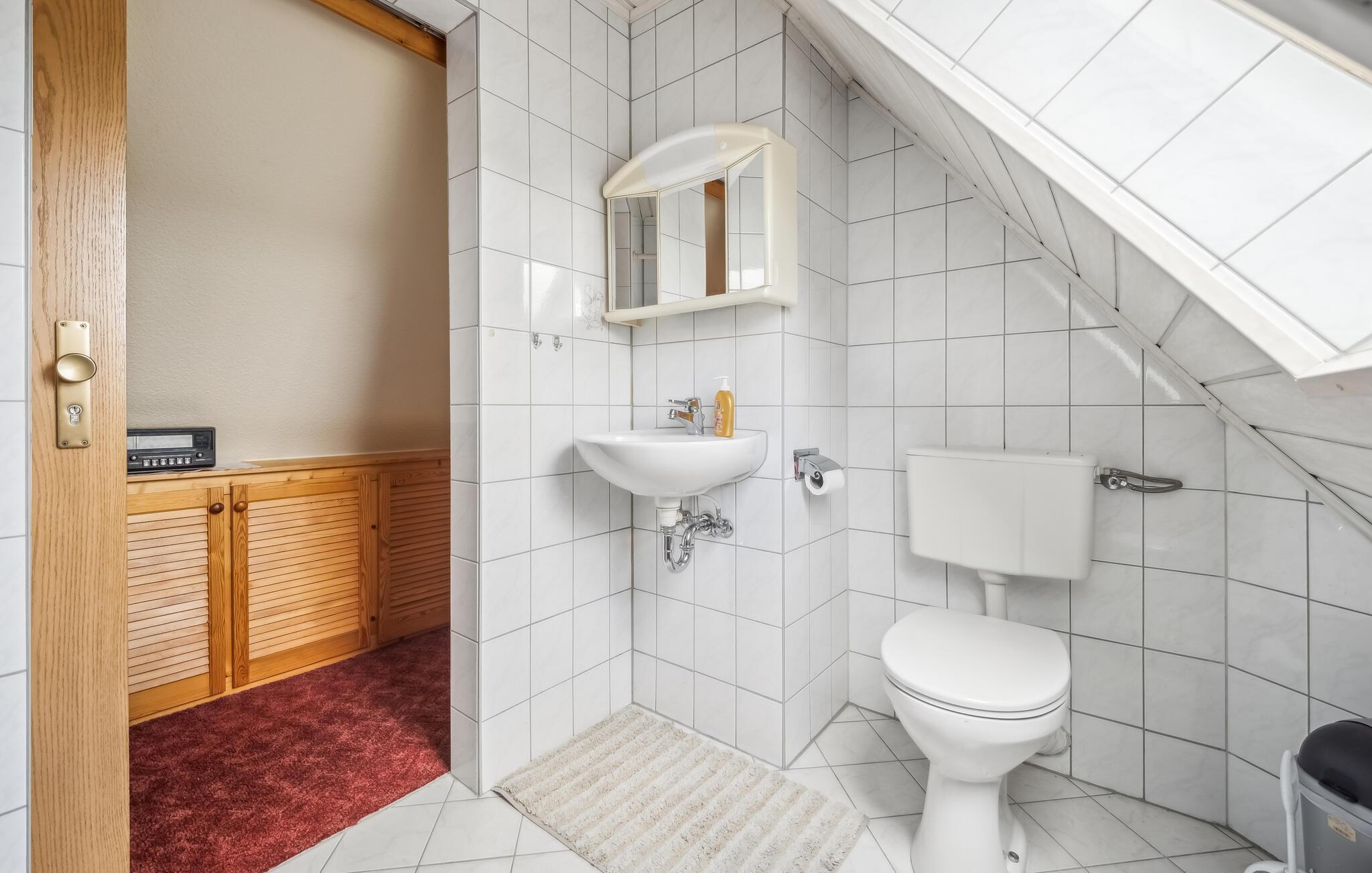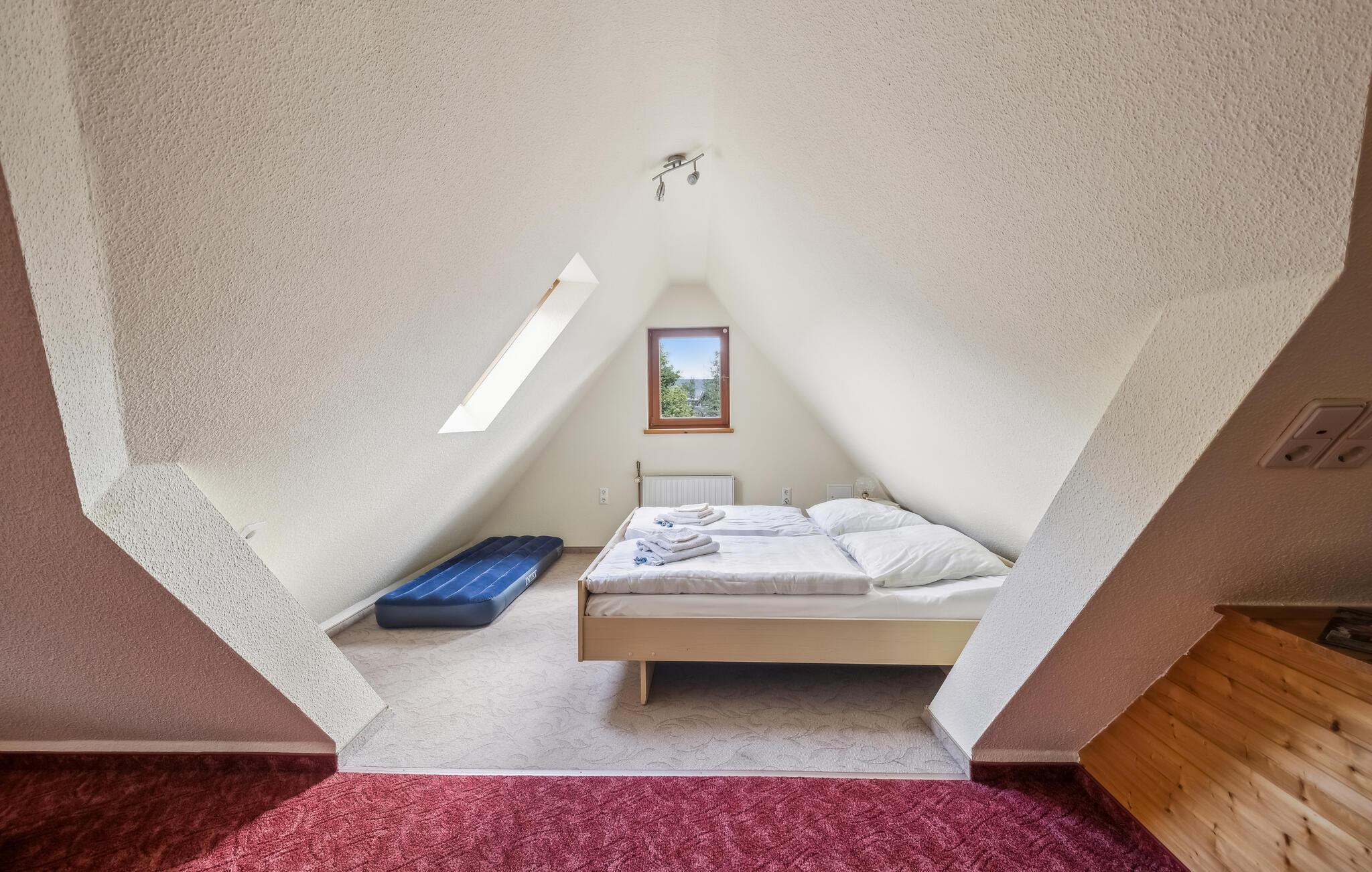 Die Wohnung ist für gehbehinderte Menschen und große Gäste über 1,80 m nicht geeignet. Der separate Zugang erfolgt über eine steile Geschosstreppe. Die ca. 60 qm große, zentral beheizte, komplett mit Dachschrägen versehene Nichtraucher-Wohnung (Raumhöhe max. 2,40 m) verfügt über einen kombinierten Wohn-, Schlafraum, (Couch, SAT-TV, Radio, Tischfußballspiel, Schlafbereich mit 1 x Doppelbett, 1 Luftbett Aufbettung für ein Kind), eine Küche (Essecke, E-Herd, Backofen, Kühlschrank mit Tiefkühlfach) sowie über ein Bad mit Dusche/WC. Zusätzlich stehen Parkplatz, Fahrrad-Unterstellmöglichkeiten, kostenfreies W-LAN, ein Kinder-Spielplatz sowie eine Liegewiese im Garten mit Sitz- und Spielmöglichkeiten (Gemeinschaftsnutzung) zur Verfügung. Im Gesamtpreis sind die Endreinigung, Bettwäsche, Handtücher sowie der Wasser- und Energieverbrauch enthalten. Vor Ort zu zahlen: Kurtaxe. Haustiere sind in diesem Objekt nicht gestattet. Die Wasserversorgung erfolgt über eine hauseigene Brunnenanlage.