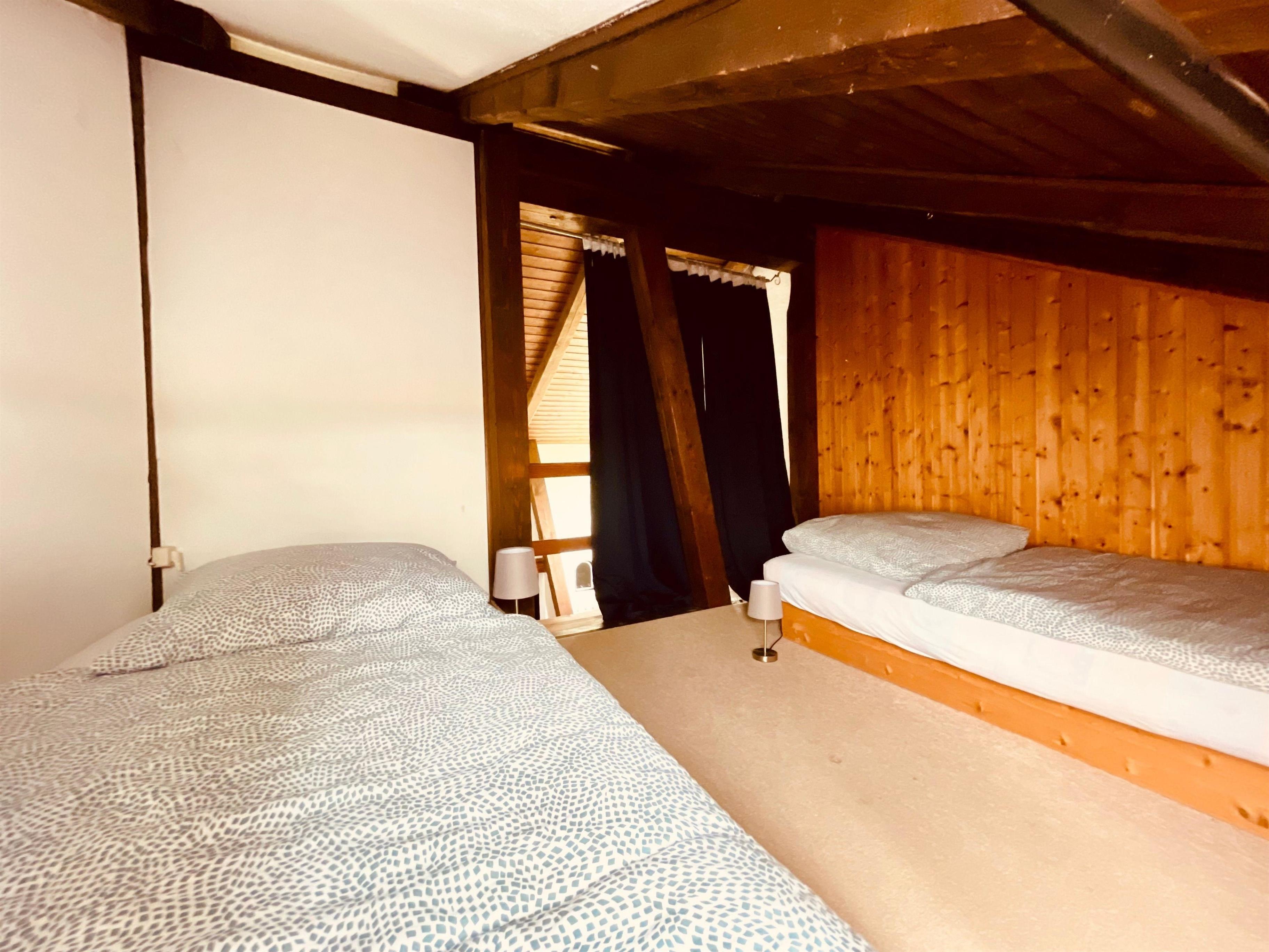 Ein separates Schlafzimmer geht vom Wohnzimmer ab, ein Doppelbett befindet sich im Vorraum (Durchgang zu Bad/Küche) und zwei weitere Schlafplätze auf der Galerie oberhalb der Küche.