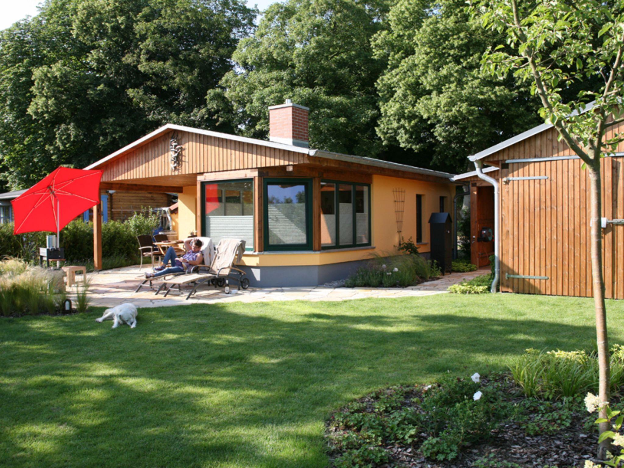 Gemütliche 36 qm mit Wohnzimmer, Essbereich, Schlafzimmer, offener Küche und Bad bieten allen Komfort für einen erholsamen Urlaub. Das helle Wohnzimmer hat direkten Zugang zum Garten. Unter der überdachten Terrasse sitzen oder frühstücken Sie geschützt und über die großen Fenster durchflutet Tageslicht die Räume und sorgt für eine äußerst wohnliche Atmosphäre.