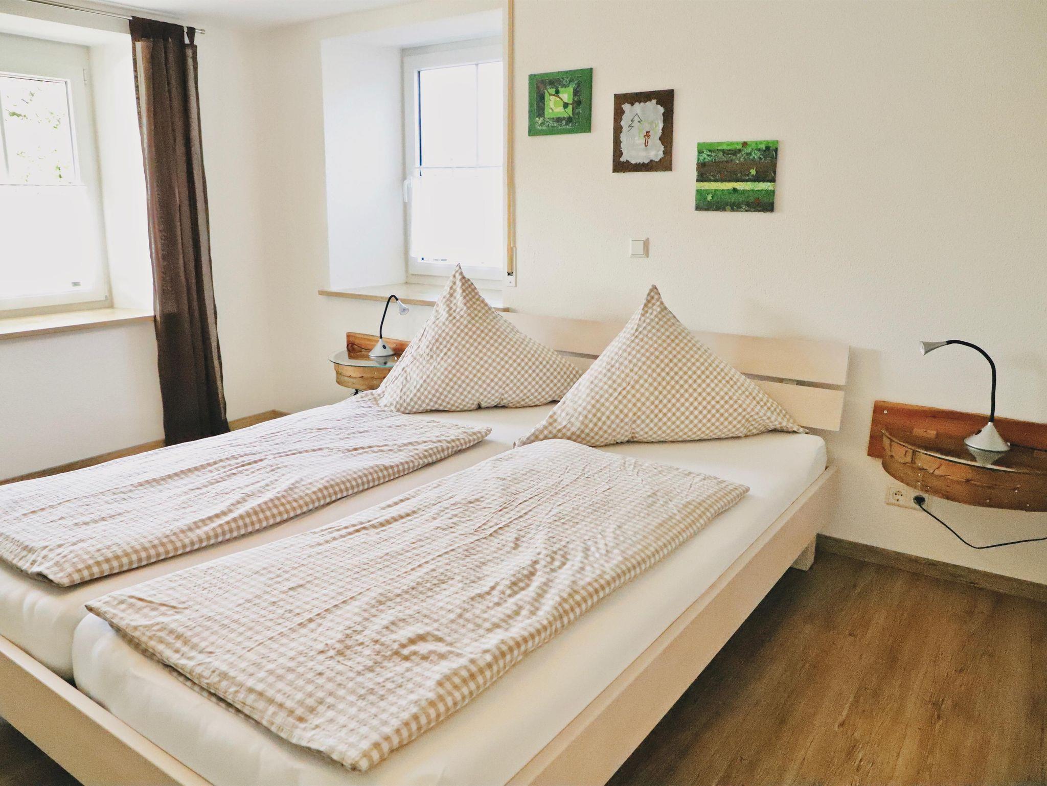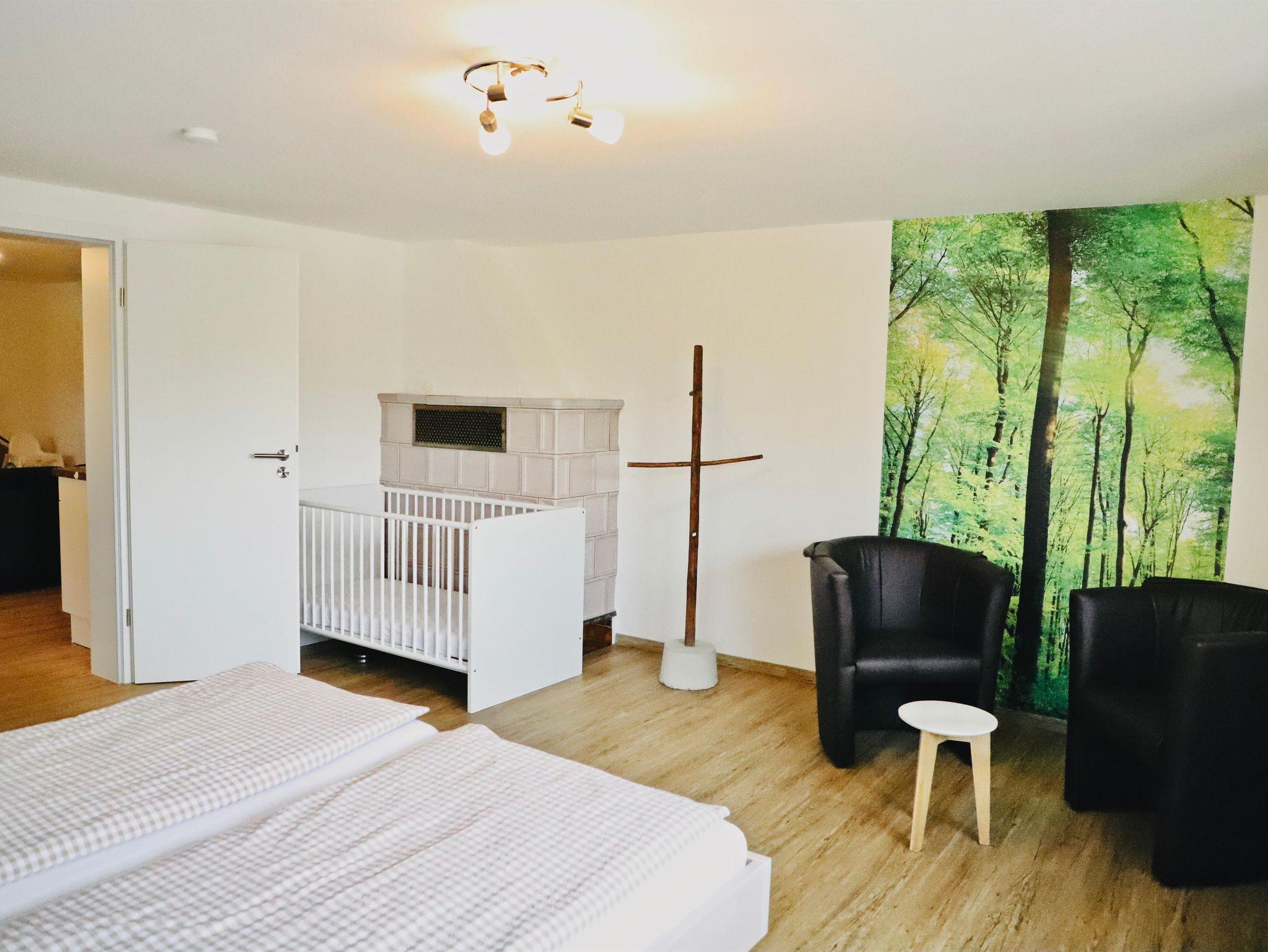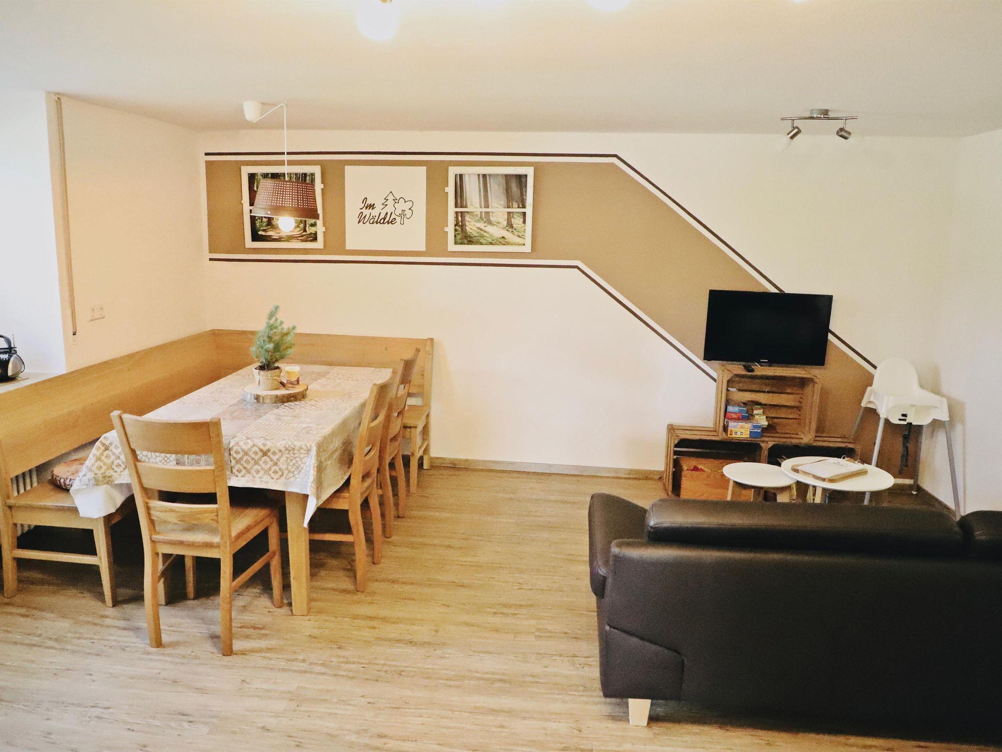 Unsere Ferienwohnung „Im Wäldle“ - benannt und entsprechend eingerichtet nach unserem Tätigkeitsbereich Forstwirtschaft - ist etwa 70 m² groß und befindet sich im Erdgeschoss. Neben einem gemütlichen Wohn-, Essbereich mit gut ausgestatteter Küchenzeile verfügt die Wohnung über ein kleines Schlafzimmer mit zwei Einzelbetten und der Möglichkeit einer Schlafcouch, ein großes Schlafzimmer – extra für Große mit einer Bettenlänge von 2,20 m – sowie ein Badezimmer mit begehbarer Dusche und ein separates WC. Eine überdachte Terrasse und ein Balkon laden zum Frische Luft schnappen ein. Baby- bzw. Kleinkindausstattung ist vorhanden.