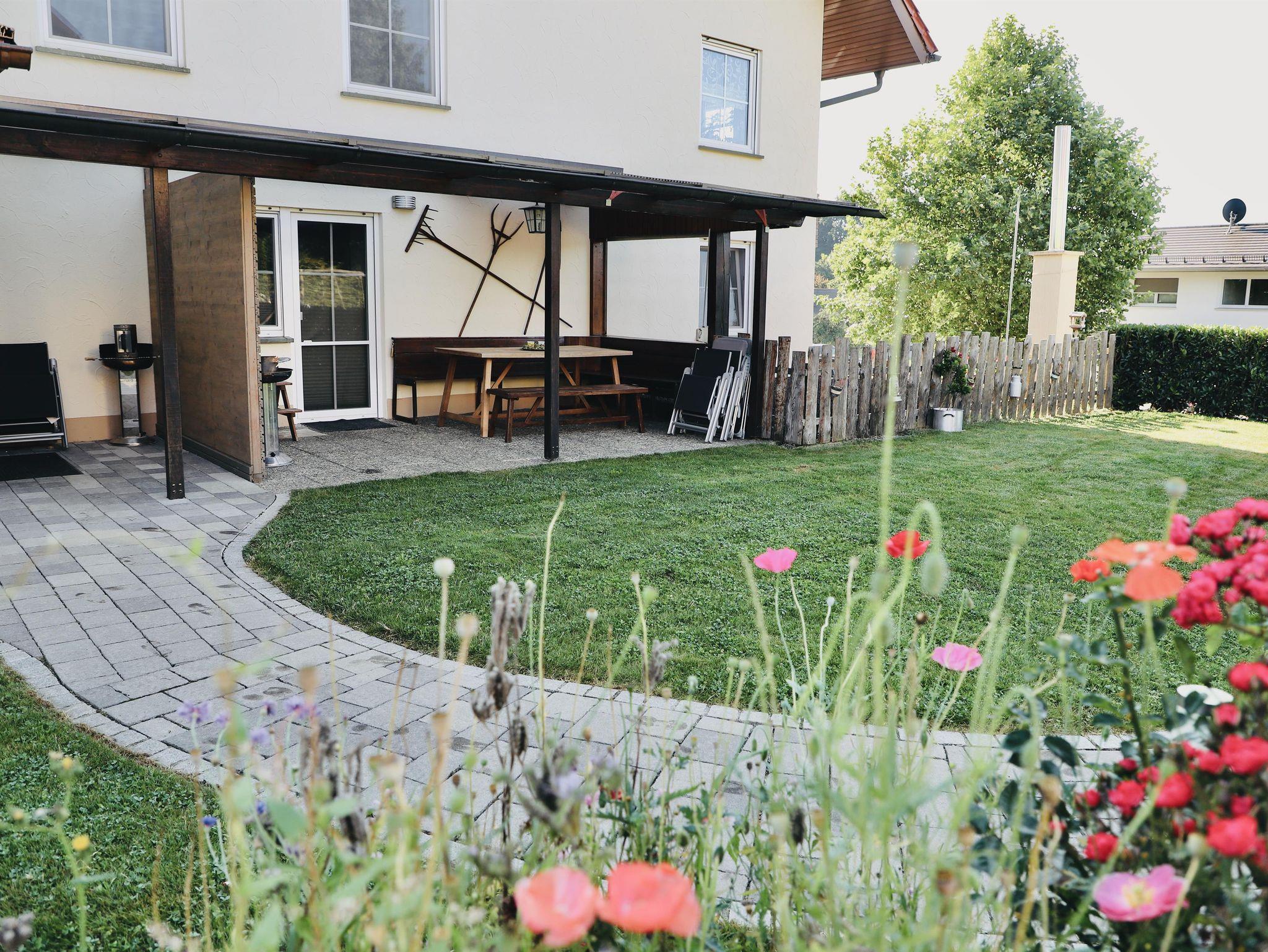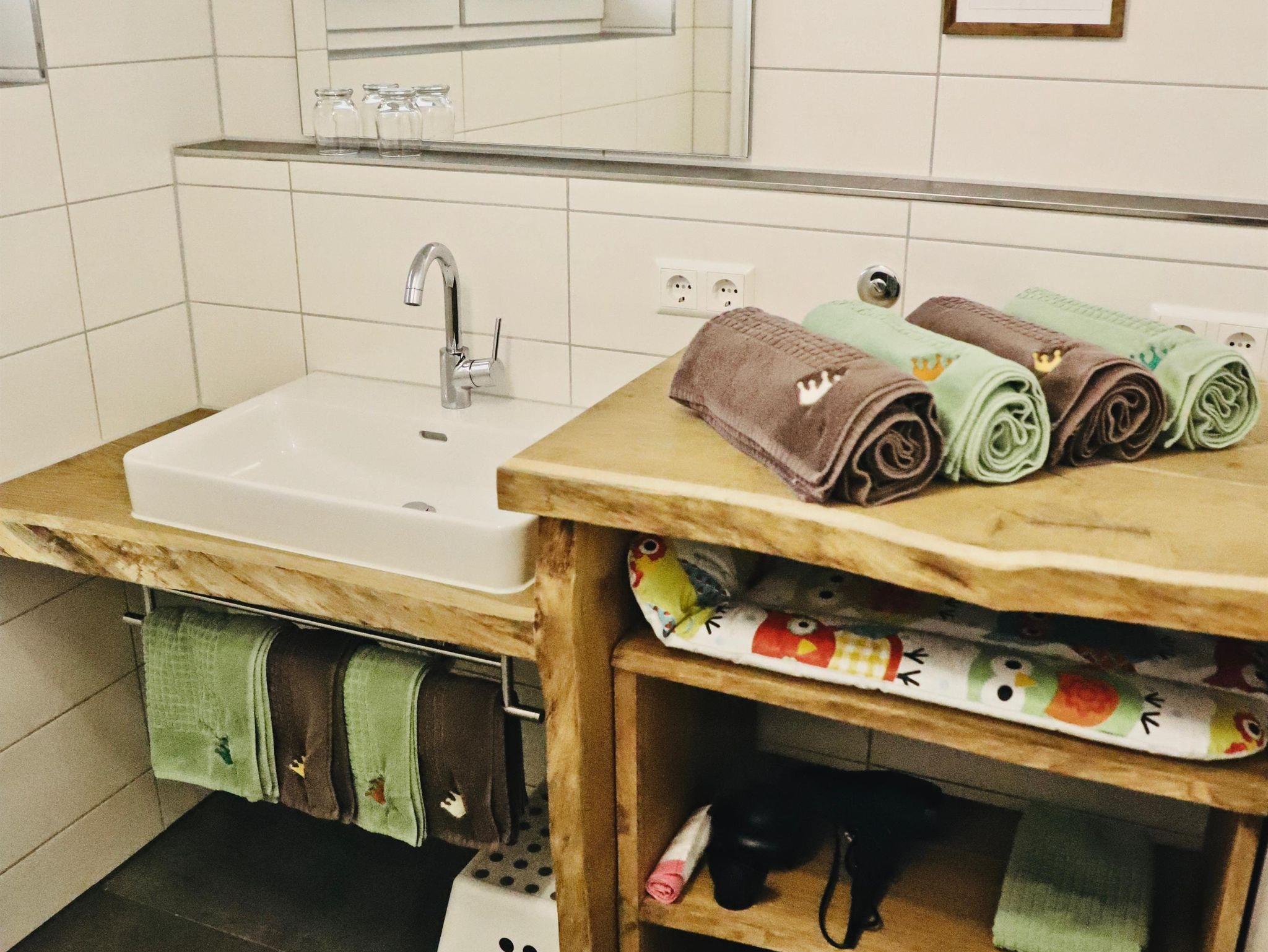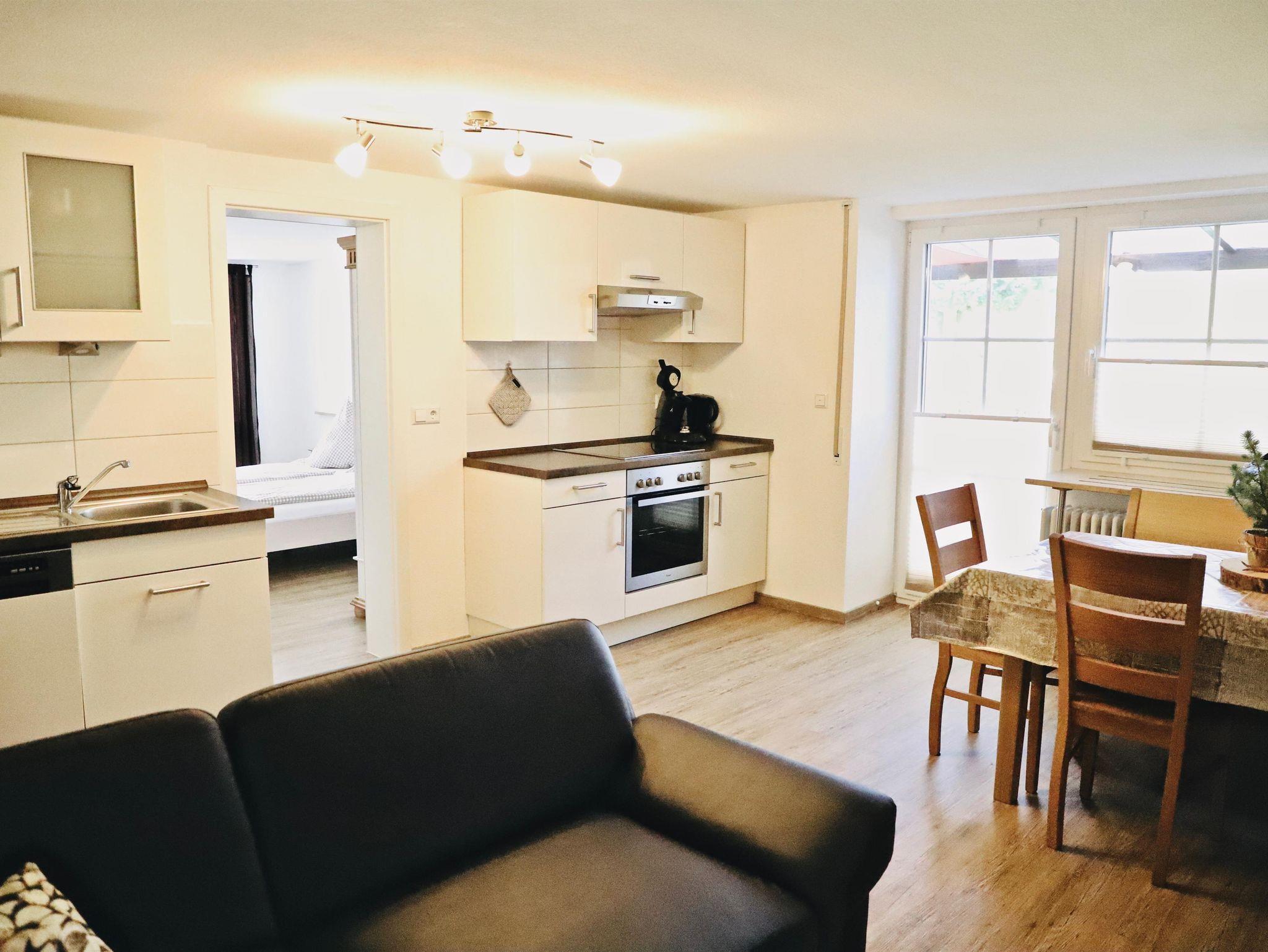 Unsere Ferienwohnung „Im Wäldle“ - benannt und entsprechend eingerichtet nach unserem Tätigkeitsbereich Forstwirtschaft - ist etwa 70 m² groß und befindet sich im Erdgeschoss. Neben einem gemütlichen Wohn-, Essbereich mit gut ausgestatteter Küchenzeile verfügt die Wohnung über ein kleines Schlafzimmer mit zwei Einzelbetten und der Möglichkeit einer Schlafcouch, ein großes Schlafzimmer – extra für Große mit einer Bettenlänge von 2,20 m – sowie ein Badezimmer mit begehbarer Dusche und ein separates WC. Eine überdachte Terrasse und ein Balkon laden zum Frische Luft schnappen ein. Baby- bzw. Kleinkindausstattung ist vorhanden.