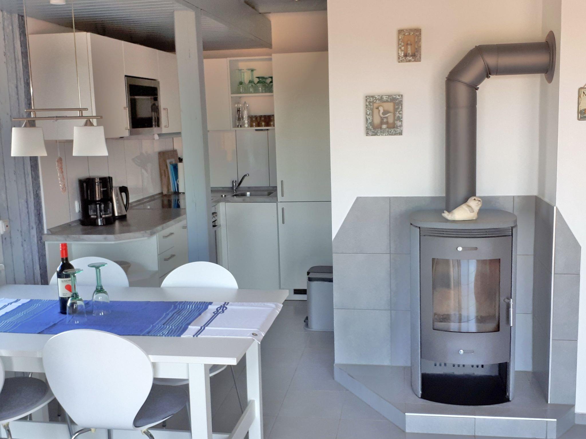 The wooden house is located in a quiet holiday home complex with a direct dream view of the Baltic Sea. It has been regularly renovated and redesigned by the owners. You have an unobstructed view of Großenbrode and the sunny island of Fehmarn. The property is fenced and situated at the end of a cul-de-sac. The property is surrounded by fields. A carport belongs to the house.