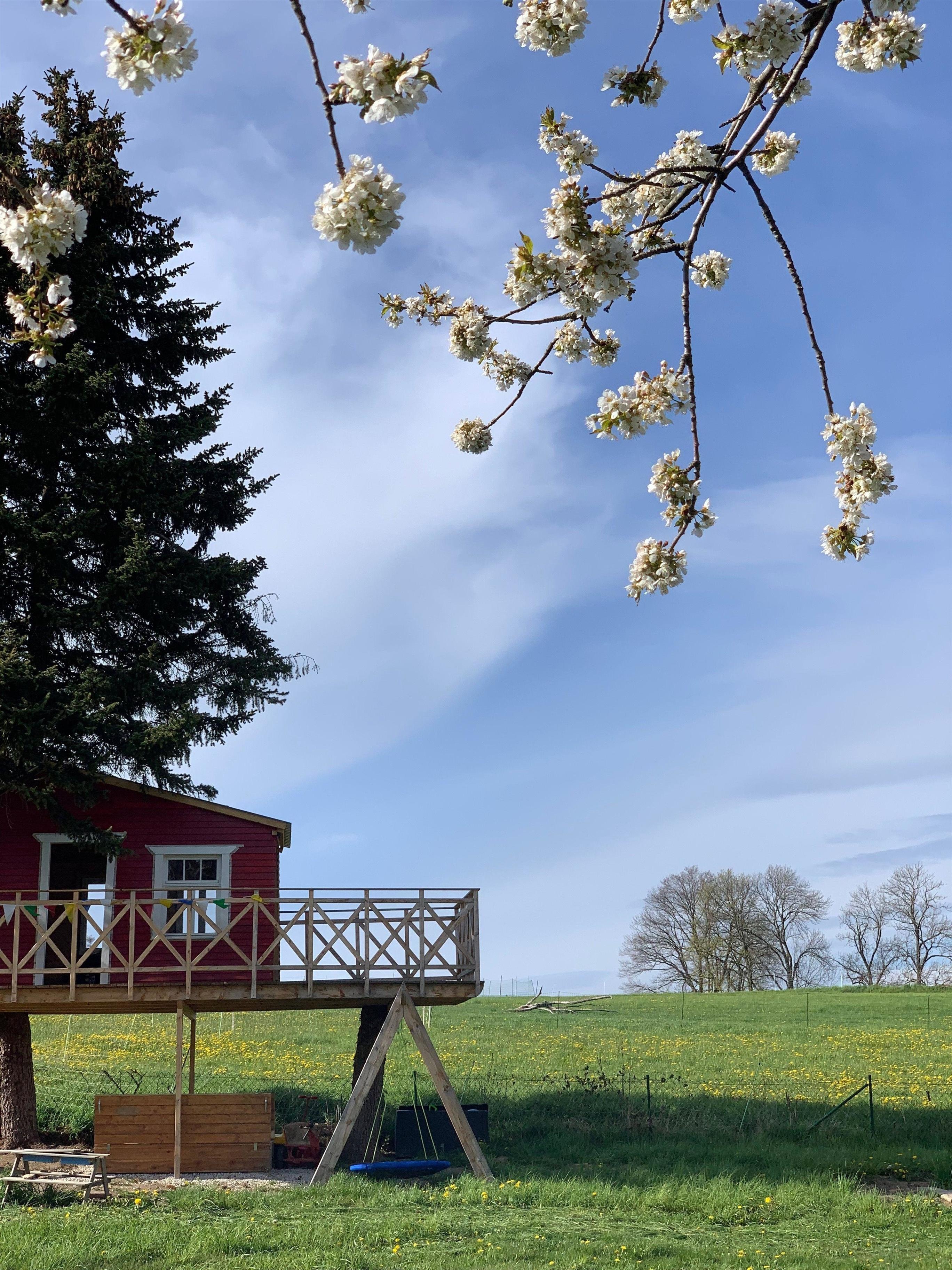 Für die Kinder haben wir ein großes Baumhaus, einen Sandkasten und verschiedene Schaukeln. Überall steht für die Kinder Spielzeug bereit.