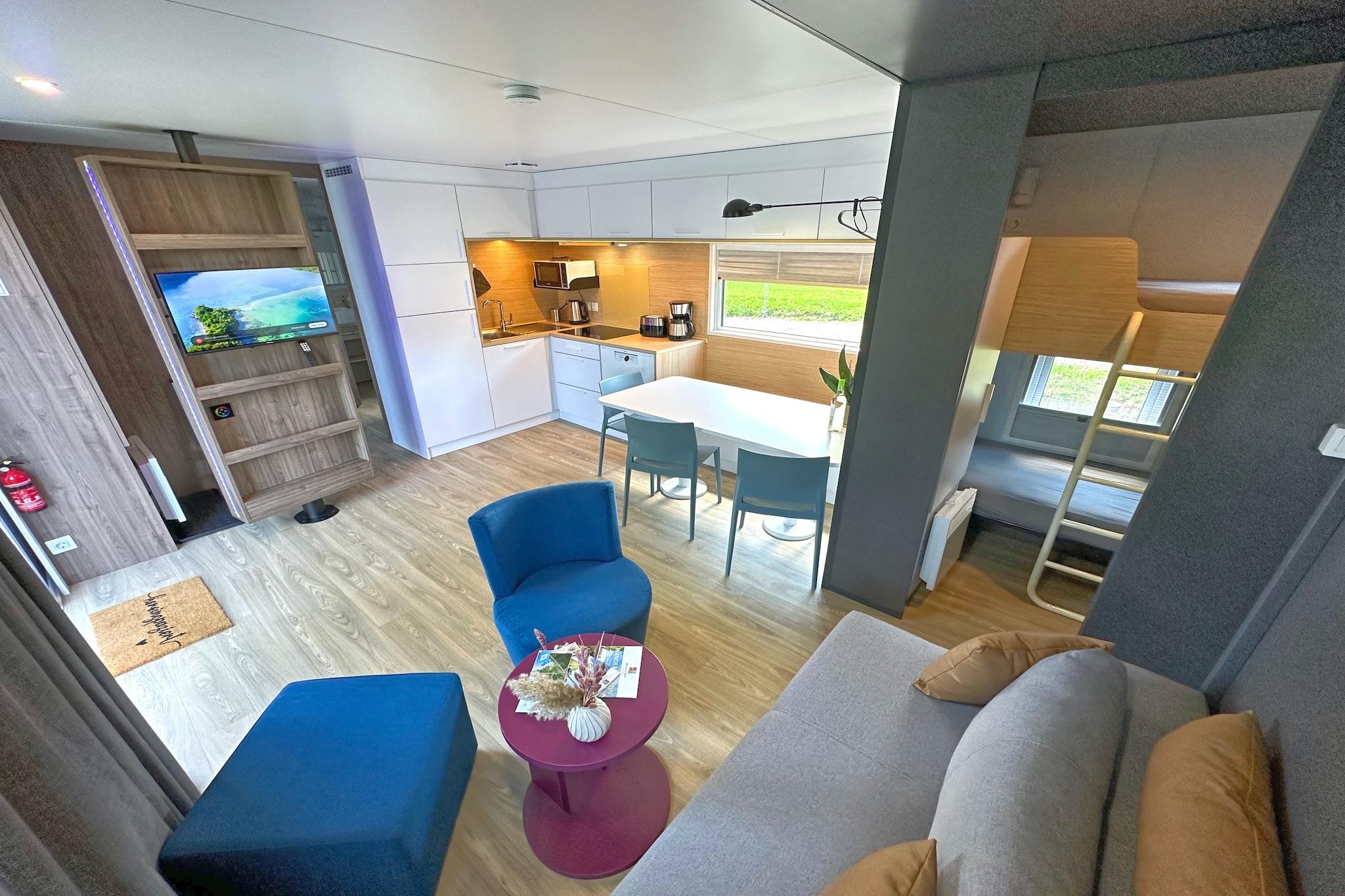 Ground floor: (Entrance, open kitchen(electric kettle, toaster, cooker(4 ring stoves, induction), hood, coffee machine(filter), oven(mini), microwave, dishwasher, fridge-freezer), Living/diningroom(TV(flatscreen, satellite, smart TV), dining table(6 persons)), bedroom(2x single bed(80 x 190 cm)), bedroom(bunk bed(80 x 190 cm)), Bedroom with bathroom(double bed(160 x 200 cm), shower, washbasin, toilet), bathroom(shower, washbasin, toilet)) tumble dryer(shared with other guests, paid), washing machine(shared with other guests, paid), heating(electric), terrace(private), garden(shared with other guests, 10000 m2), garden furniture, sun loungers, BBQ, parking, high chair, insect screens, Sunscreen, Volleyball court, Charging post for electric cars