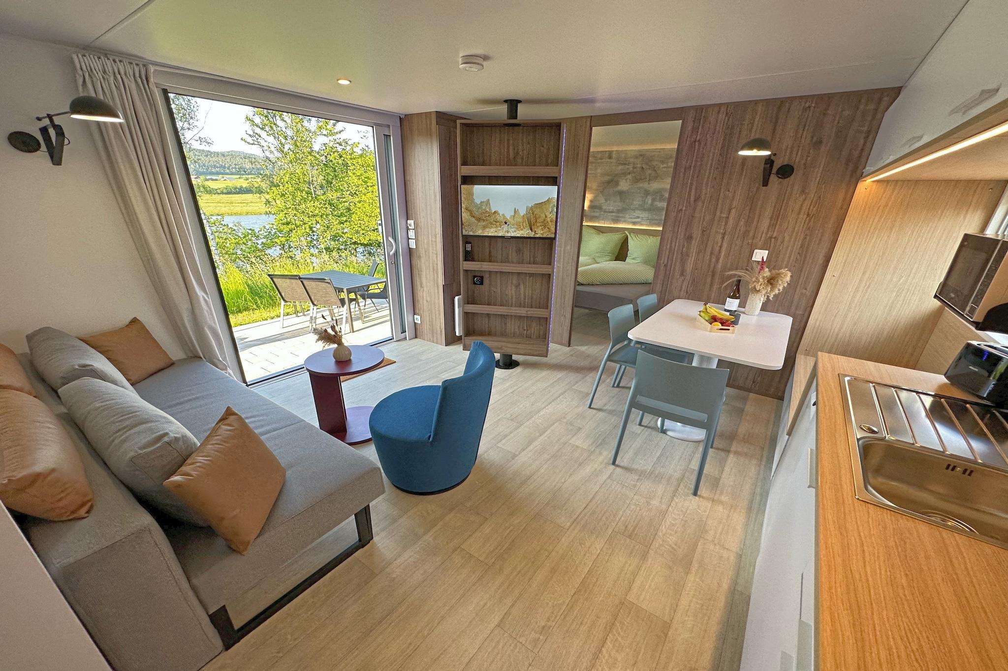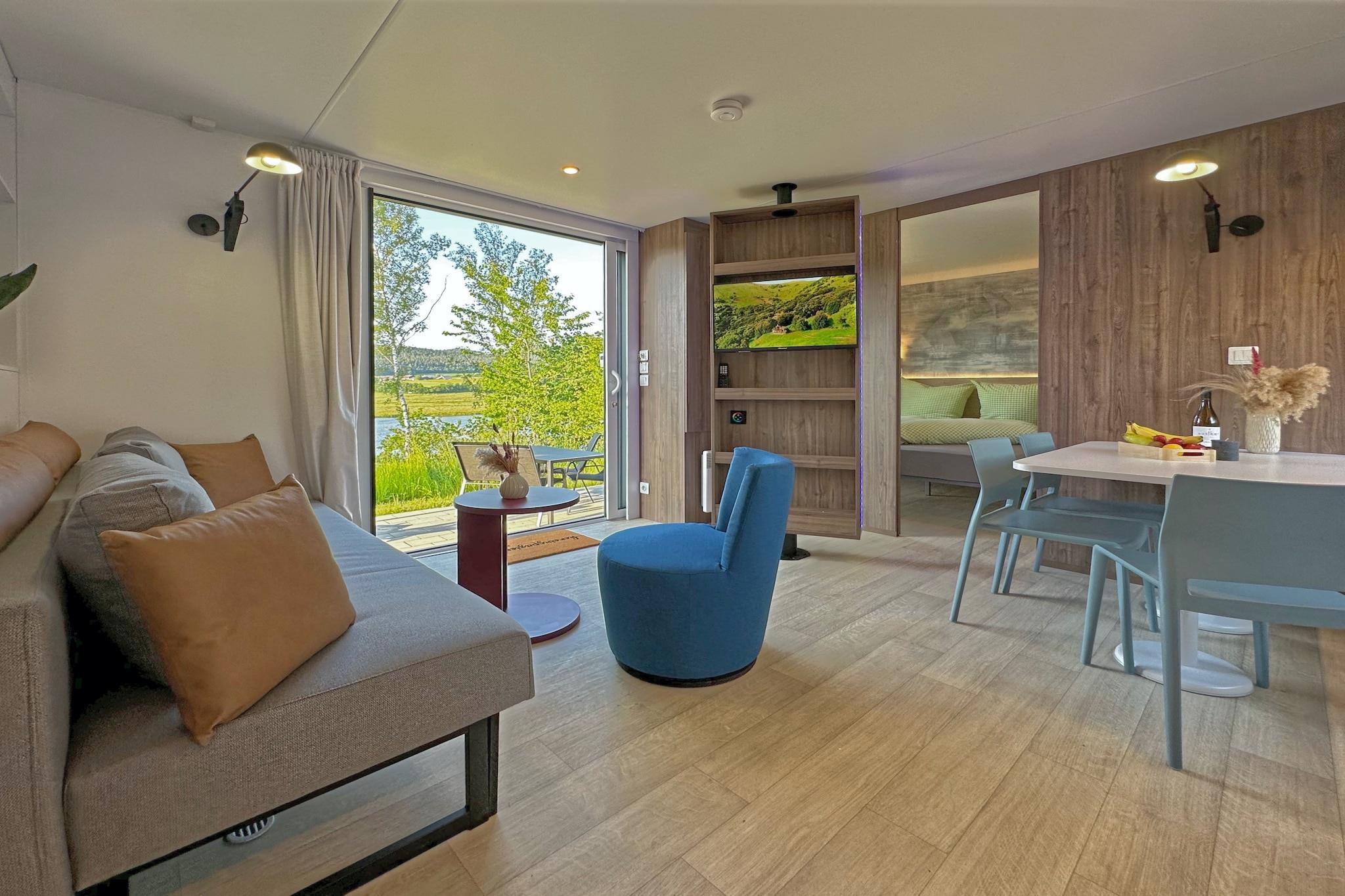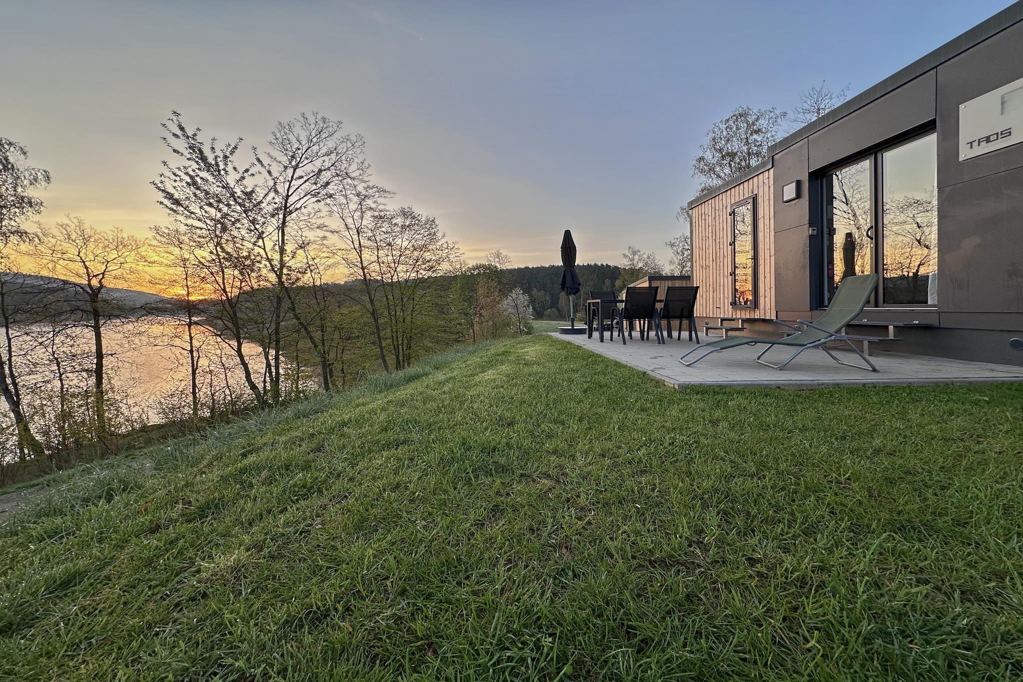 Welcome to the peaceful Seeblick holiday village, nestled on the shores of Lake Eixendorf in the heart of the Upper Palatinate Forest. This cozy tiny chalet is ideal for couples, families, or friends seeking a relaxing escape in nature. It features a fully equipped open-plan kitchen, a comfortable living-dining area, and two bedrooms, each with its own private bathroom, ensuring both comfort and privacy. Step outside to your private terrace with a fireplace grill, garden furniture, parasol, and sun loungers, perfect for lakeside meals and unwinding under the open sky. Amenities include WiFi, TV, dishwasher, and private parking. The surrounding Oberpfälzer Seenland offers a rich mix of activities: explore scenic trails on foot or by bike, enjoy fishing, sailing, or golfing, and discover nearby moors and mountains. Whether you're planning a quiet retreat, an active holiday, or a family adventure, this lakeside haven offers something for everyone.