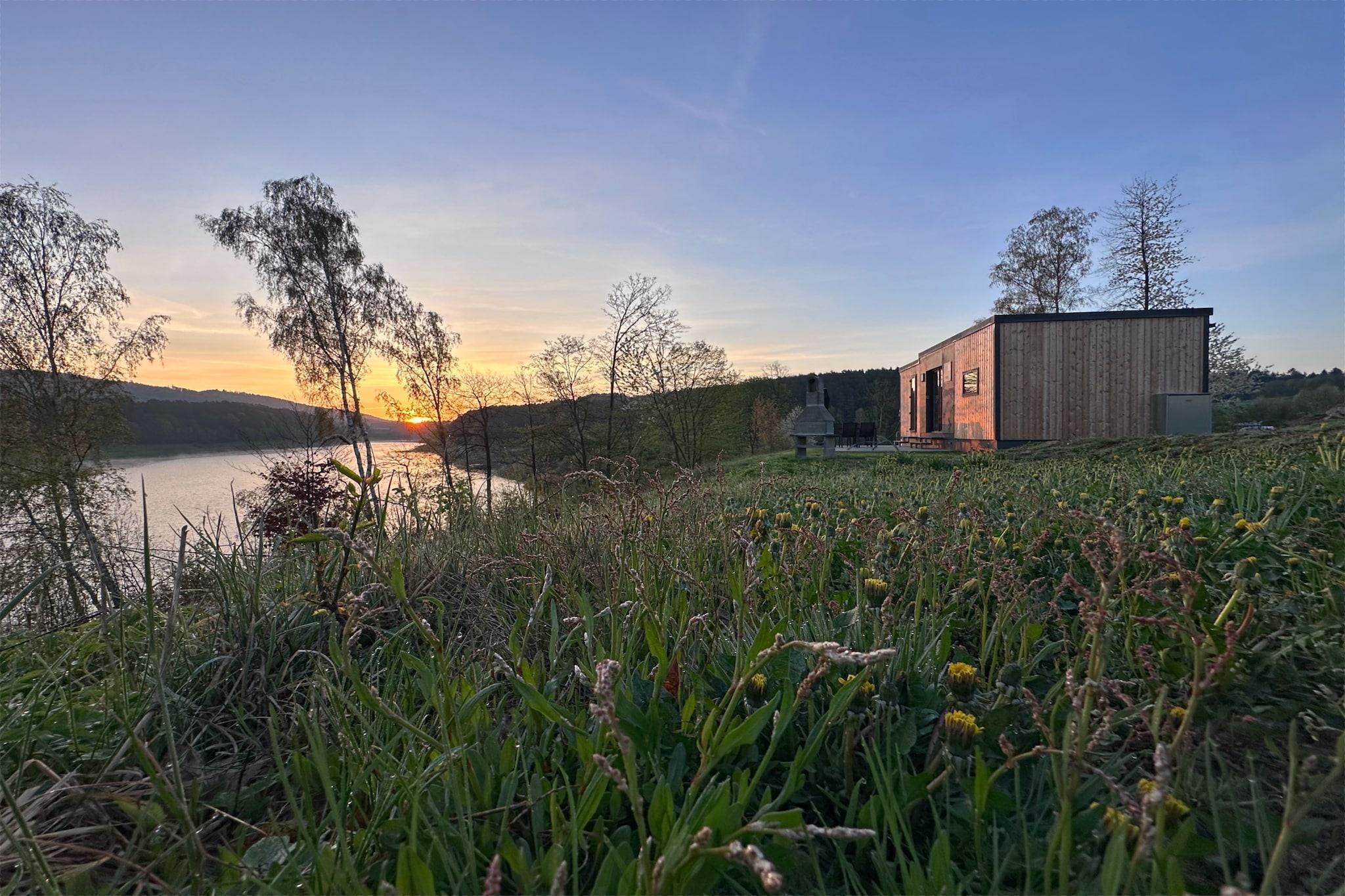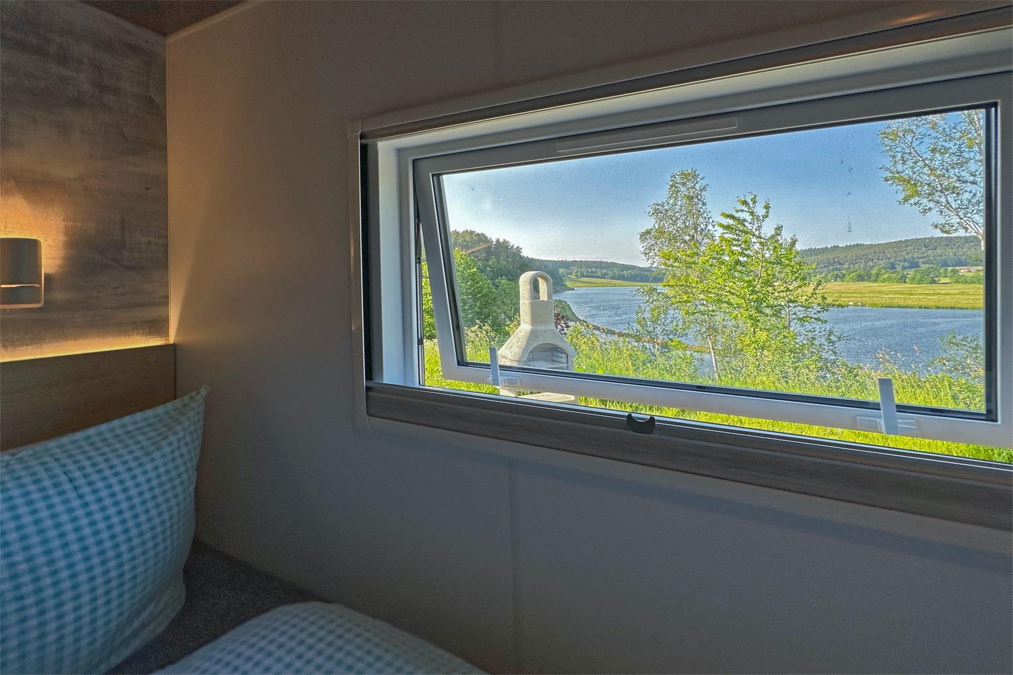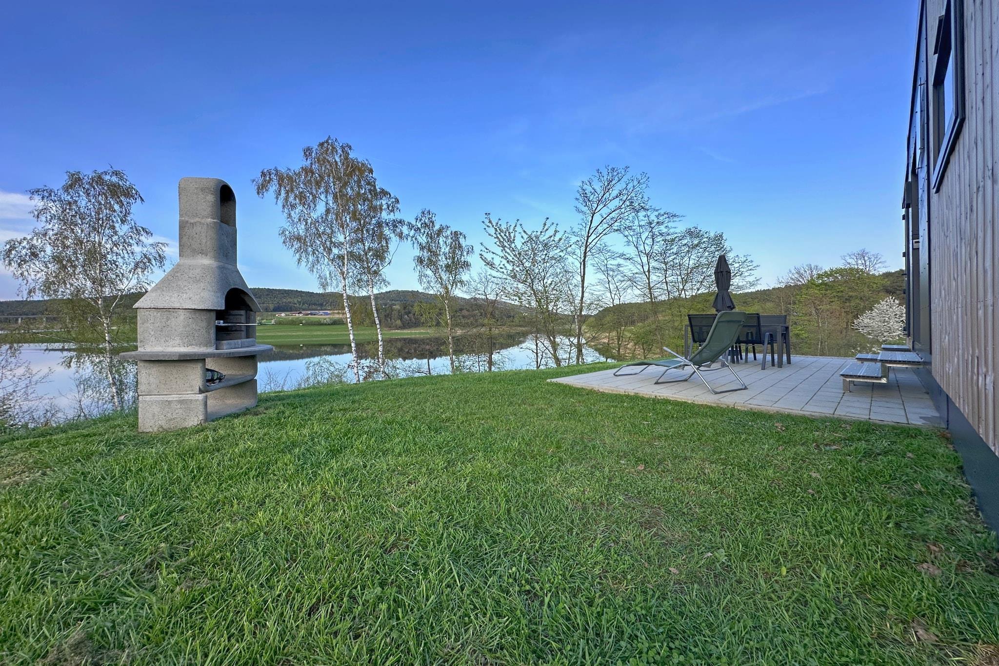 Welcome to the peaceful Seeblick holiday village, nestled on the shores of Lake Eixendorf in the heart of the Upper Palatinate Forest. This cozy tiny chalet is ideal for couples, families, or friends seeking a relaxing escape in nature. It features a fully equipped open-plan kitchen, a comfortable living-dining area, and two bedrooms, each with its own private bathroom, ensuring both comfort and privacy. Step outside to your private terrace with a fireplace grill, garden furniture, parasol, and sun loungers, perfect for lakeside meals and unwinding under the open sky. Amenities include WiFi, TV, dishwasher, and private parking. The surrounding Oberpfälzer Seenland offers a rich mix of activities: explore scenic trails on foot or by bike, enjoy fishing, sailing, or golfing, and discover nearby moors and mountains. Whether you're planning a quiet retreat, an active holiday, or a family adventure, this lakeside haven offers something for everyone.