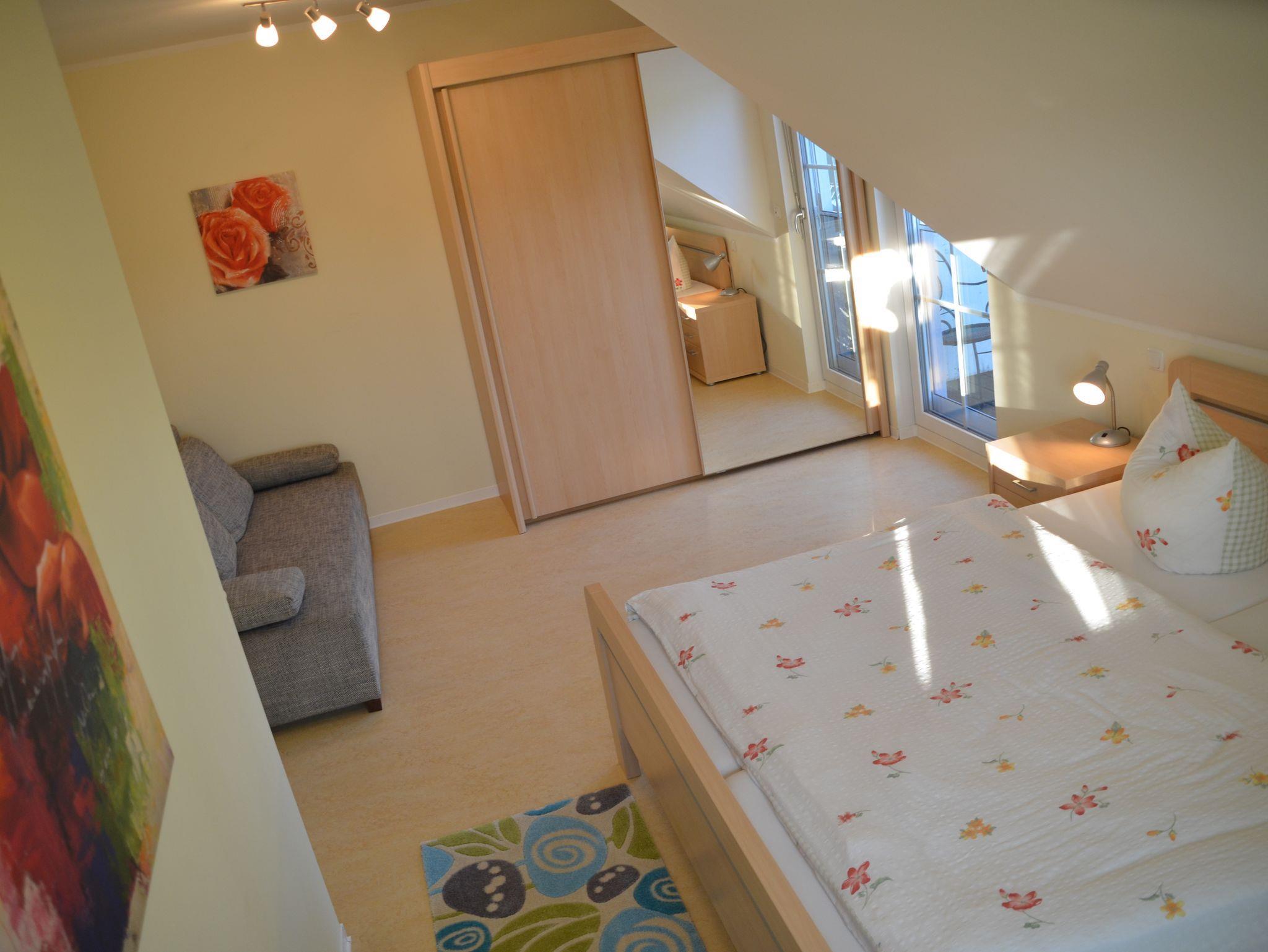 Im Eingangsbereich gibt es eine große Garderobenbereich von dem ab führt eine Treppe nach oben zu zwei getrennten Schlafräumen. Der Eltern-Schlafraum hat ein Doppelbett, eine Couch und einen Balkon. Der zweite Schlafraum hat drei Einzelbetten und einen begehbaren Kleiderschrank. Im Obergeschoß befindet sich außerdem noch das Badezimmer mit Dusche und WC.