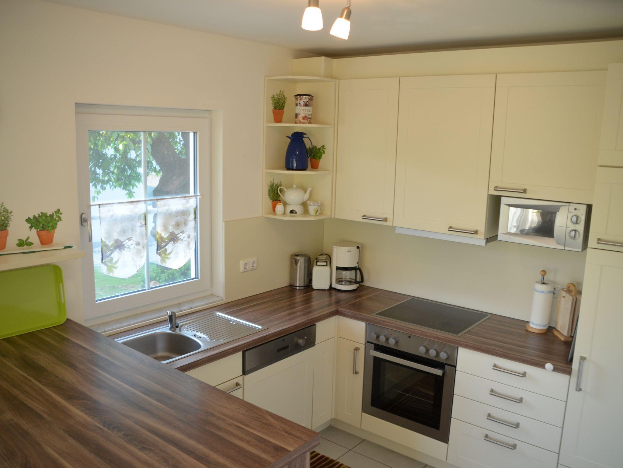 Haus Maria - ist eine Hälfte eines Doppel-Hauses. Diese ist ebenerdig ausgestattet mit großem Wohn- und Essbereich, der einen Zugang zur eigenen Terrasse hat. Es gibt dort eine großzügige Küchenzeile, mit Spülmaschine, Backofen, Mikrowelle, Kaffeemaschine, Toaster, Wasserkocher etc. Außerdem gibt es im Erdgeschoss noch ein extra WC und einen Abstellraum mit Waschmaschine.