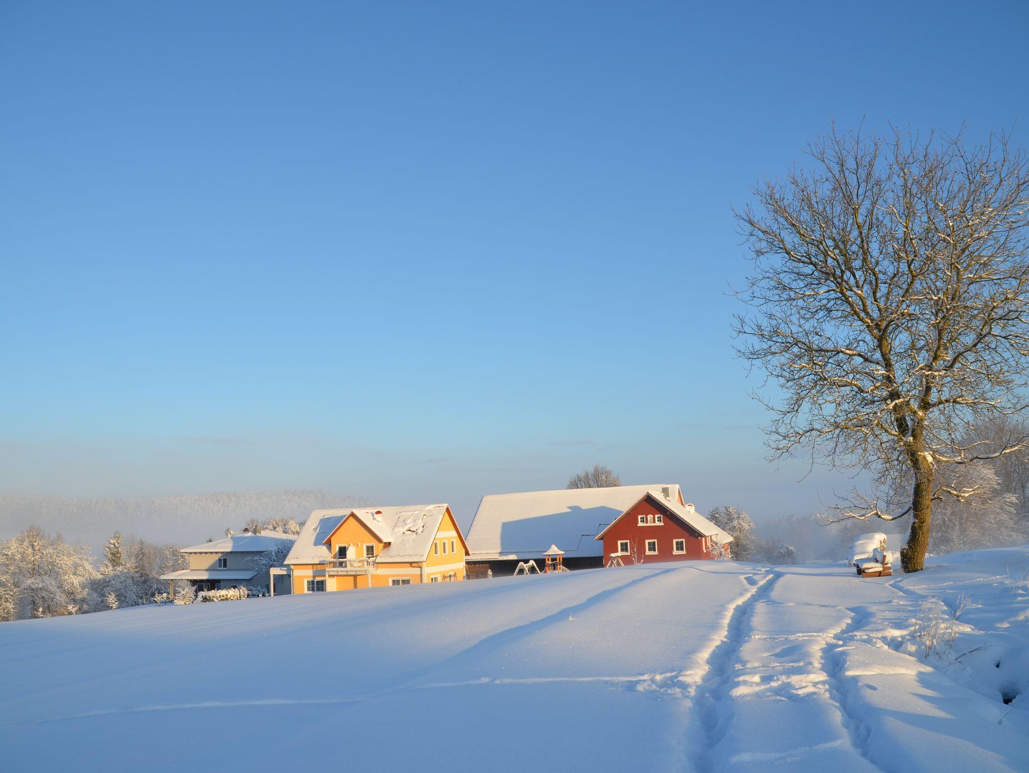 Von der eigenen Terrasse aus haben Sie Blick über Wiesen und Felder, zu Pferdekoppeln und angrenzenden Wäldern.