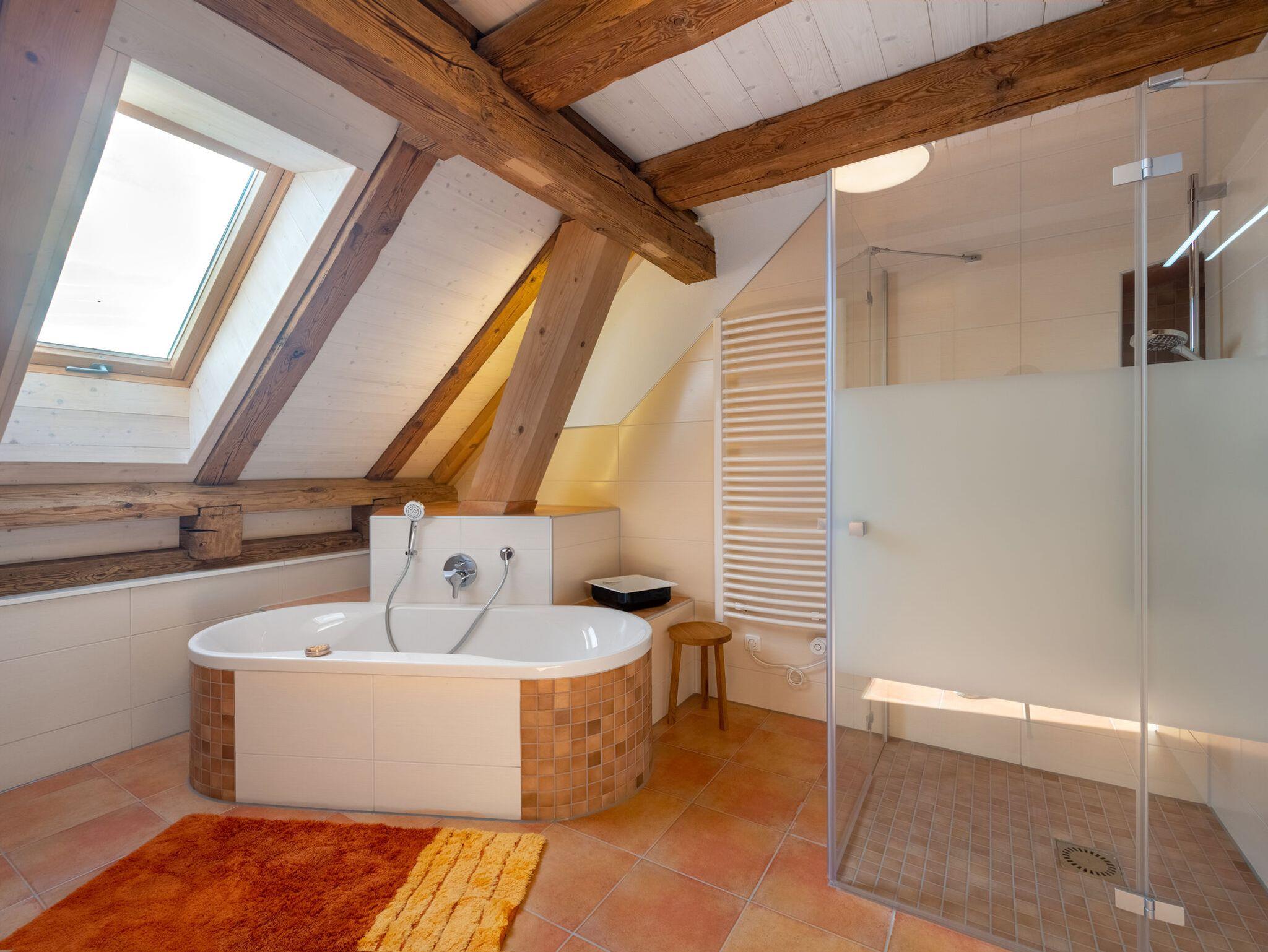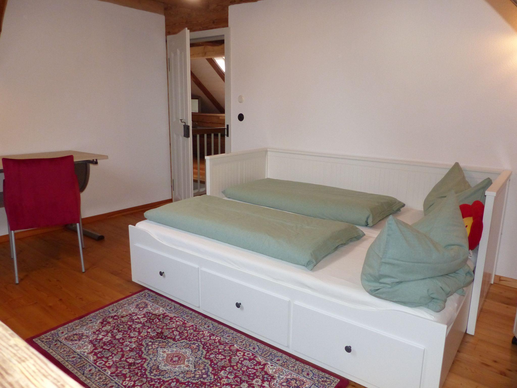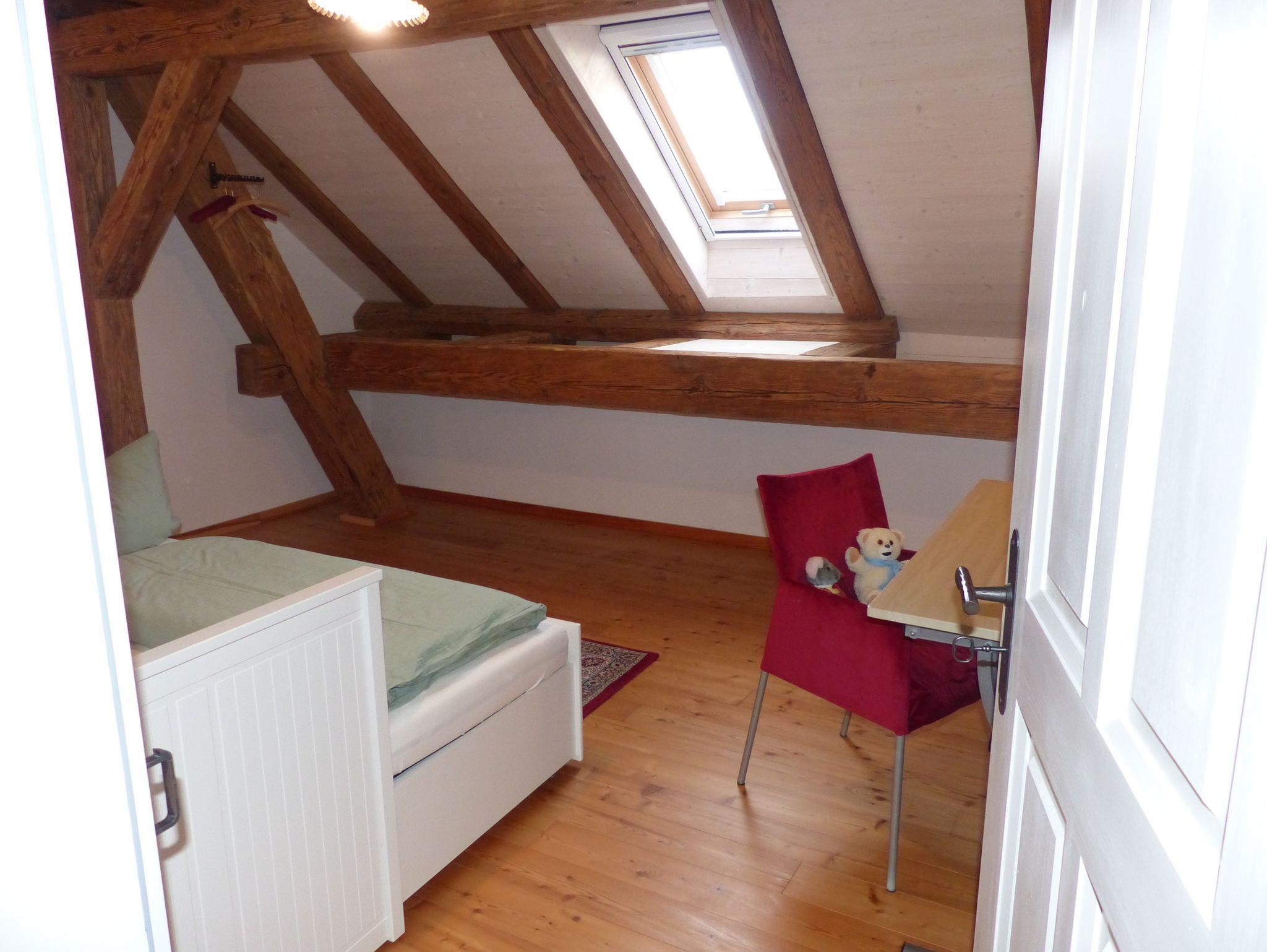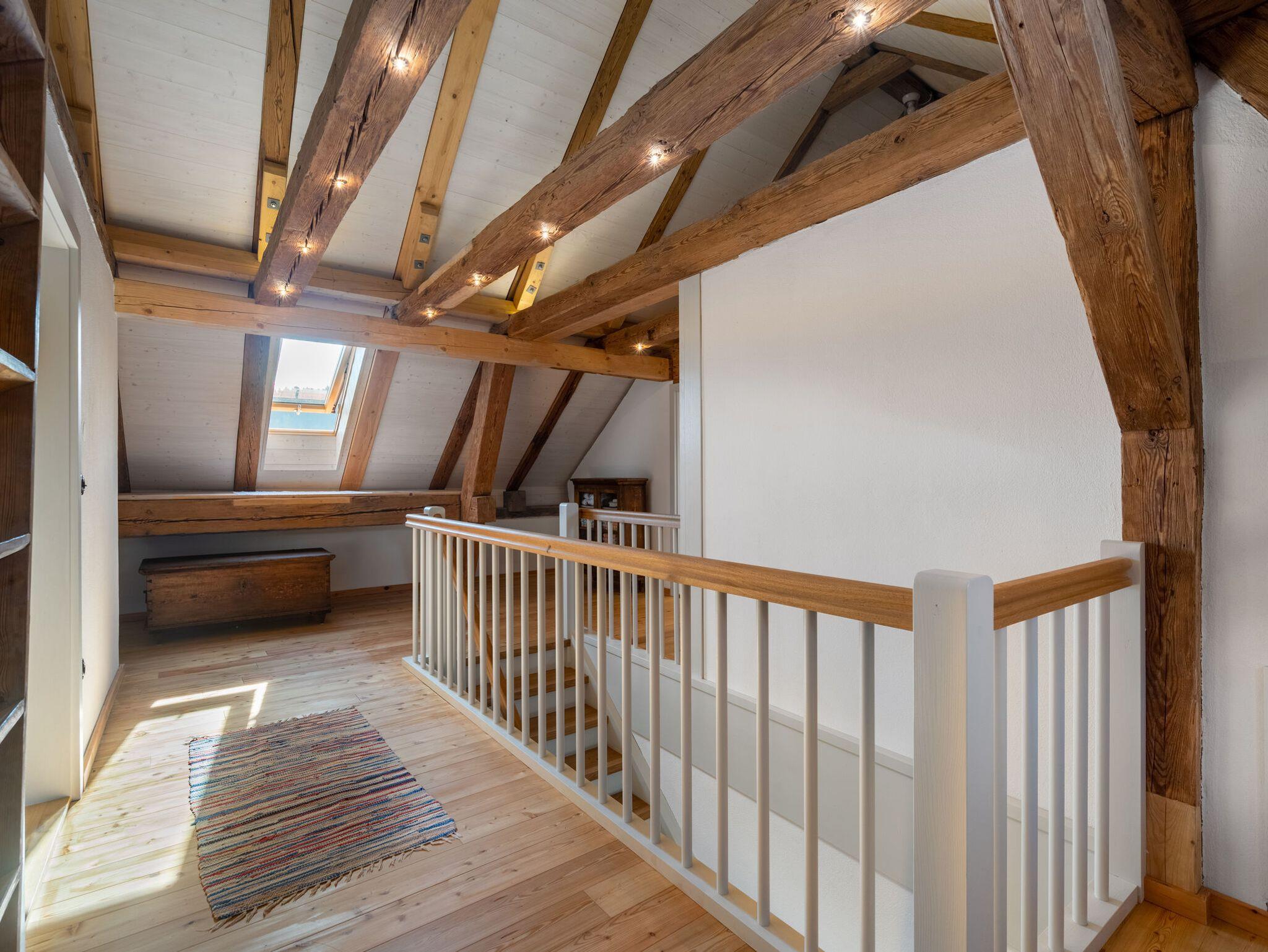 Im Obergeschoss erwarten Sie zwei liebevoll gestaltete Schlafzimmer – eines mit einem komfortablen Doppelbett, das andere mit einem praktischen Doppelunterschiebebett. Das geräumige Badezimmer überzeugt mit WC, Waschbecken, Dusche, Badewanne und einem Föhn. Ein heller Flur verbindet die Zimmer und sorgt für eine angenehme Atmosphäre.