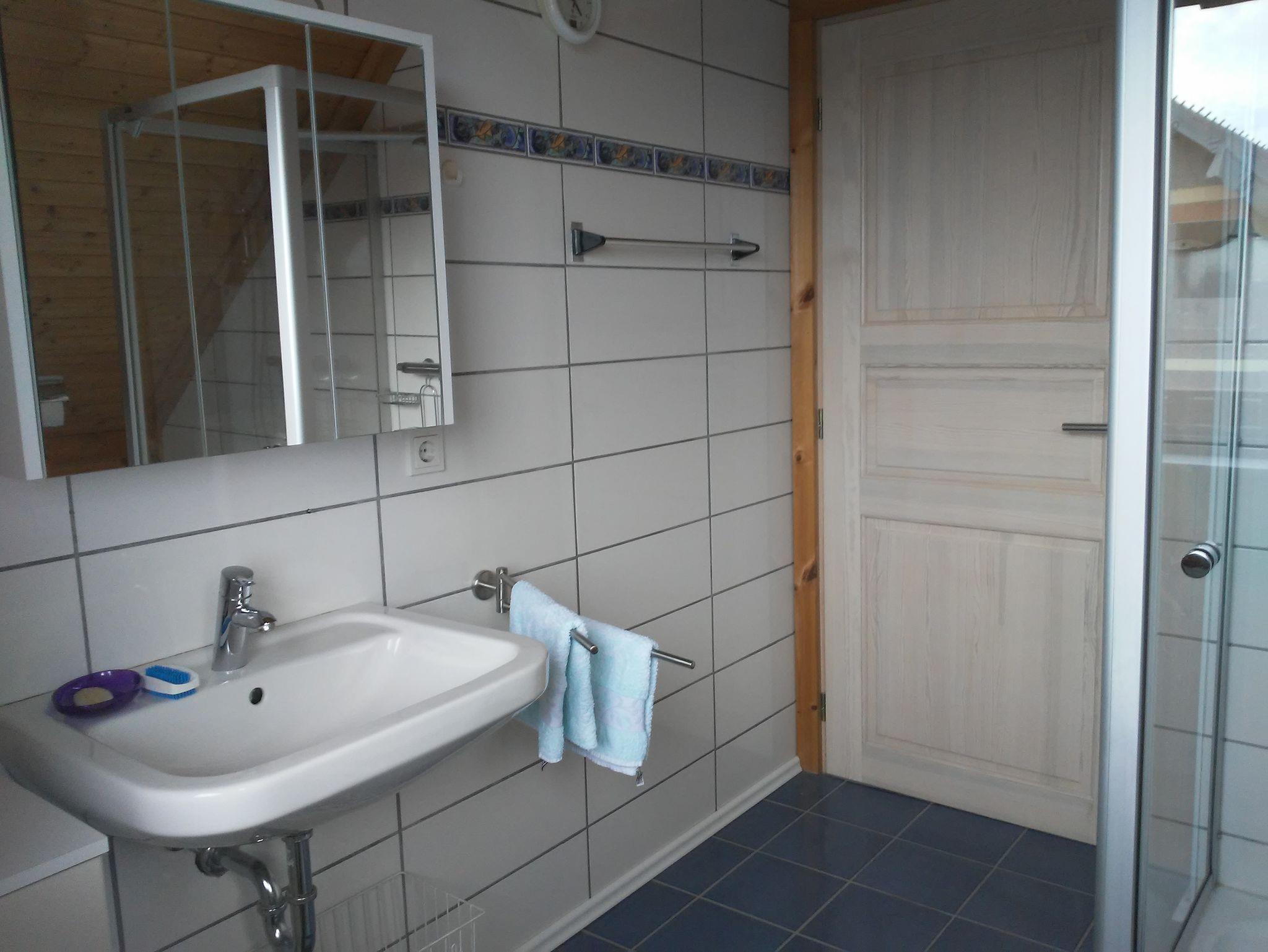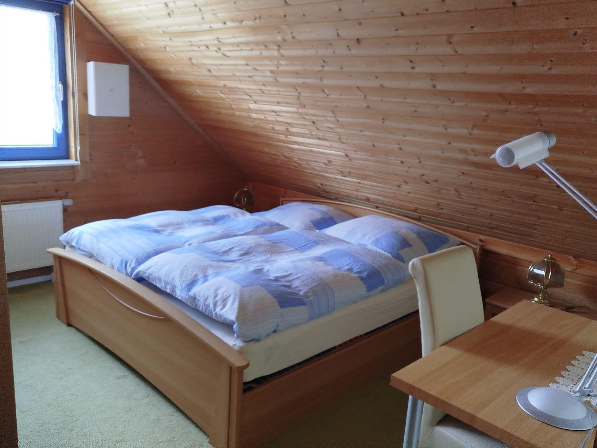 Die obere Wohnung mit Südbalkon hat eine Größe von ca. 70 m² und bietet Platz für 1 bis 5 Personen. Das gemütliche Wohnzimmer mit Schlafsofa und Flachbild-TV lädt zum Verweilen ein. Ein weiteres TV-Gerät steht zur Verfügung. Die komplett ausgestattete Küche mit Kühlschrank inkl. Gefrierfach, Herd, Backofen, Kaffeemaschine, Wasserkocher und Eierkocher lässt keine Wünsche offen. Die helle Küche mit großer Fenstertür hat Zugang zum Balkon, der mit Tisch und Gartenstühlen bestückt ist und eine herrliche Aussicht freigibt. Zur Ausstattung der Ferienwohnung gehört auch ein elektrischer Grill, der für gemütliche Abendstunden besonders im Sommer sorgen kann. Die Ferienwohnung verfügt über zwei Schlafzimmer, eines davon ist mit einem Doppelbett ausgestattet. Das geräumige Badezimmer mit Dusche, Spiegelschrank, Waschbecken, Föhn und Handtuchtrockner rundet das Gesamtbild ab. Hier steht auch zum Reinigen Ihrer Kleidung eine Waschmaschine zur Verfügung. WLAN und den Parkplatz vor dem Haus können Sie kostenfrei in Anspruch nehmen. Die Nutzung der Infrarot-Kabine und Markenkristallmatte können nach Absprache hinzugebucht werden.