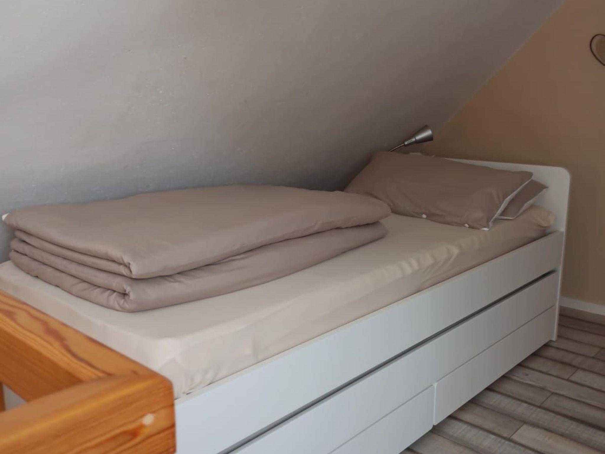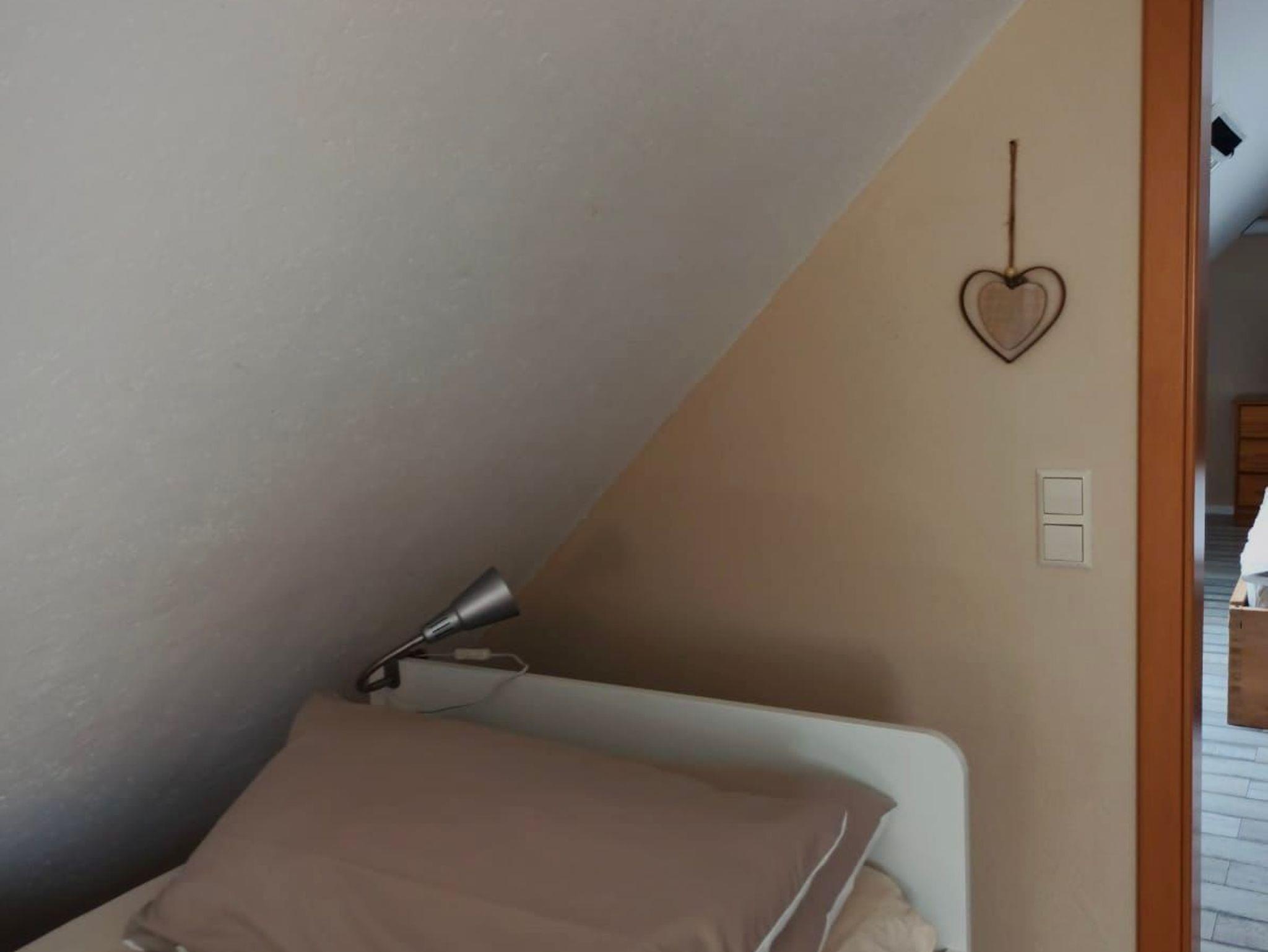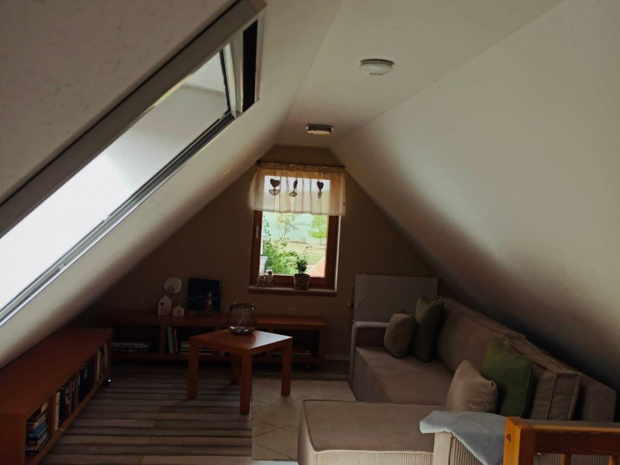 moderne Ausstattung auf 2 Etagen, Dachgeschoss mit schrägen Wänden und niedriger Deckenhöhe, Nichtraucherwohnung, Fußboden mit Fliesen und Laminat, 1 Bett 90 cm x 200 cm und 1 Doppelbett 180 cm x 200 cm, Fußbodenheizung und Elektroheizung. Eine Waschmaschine ist vorhanden.