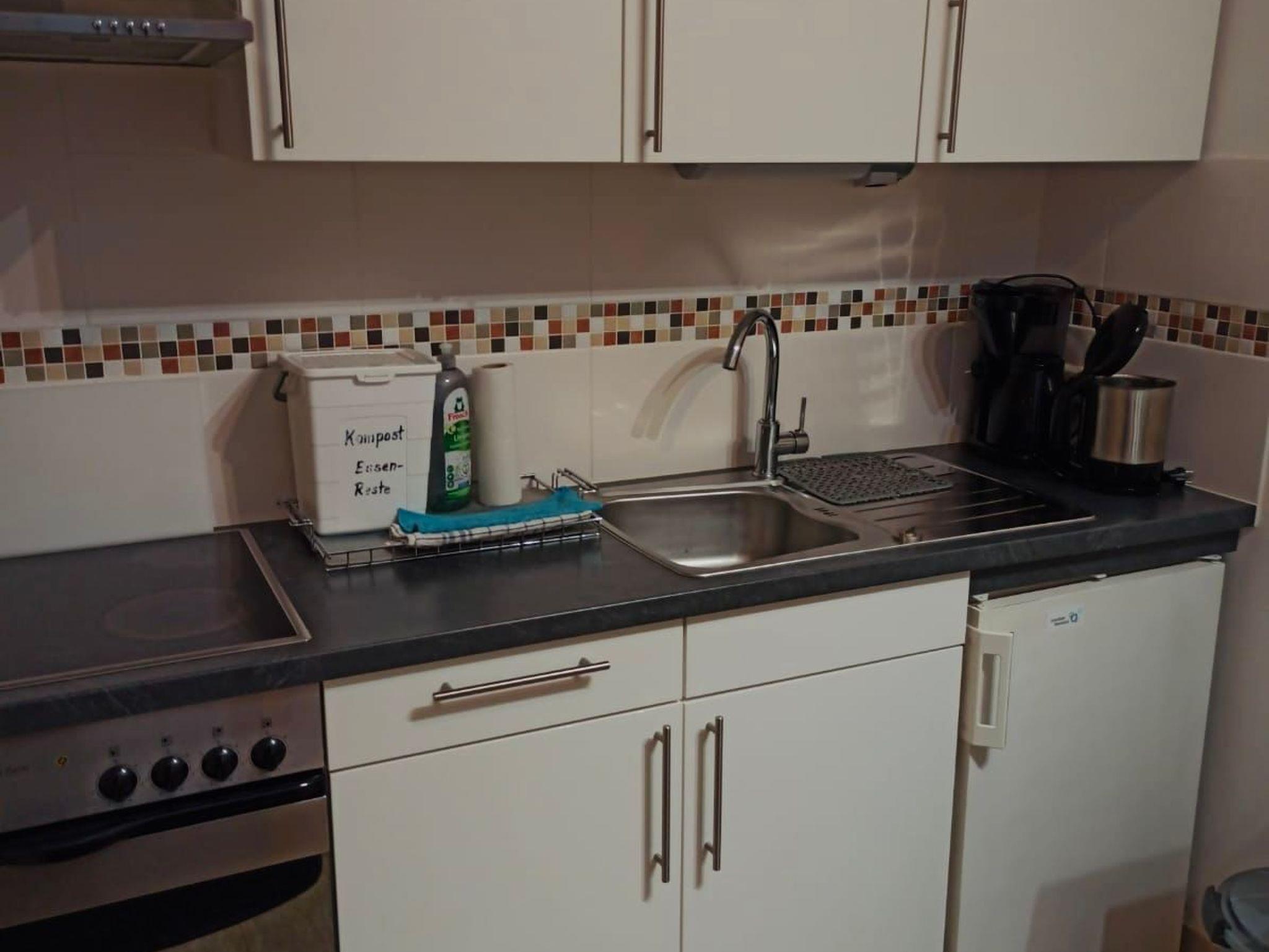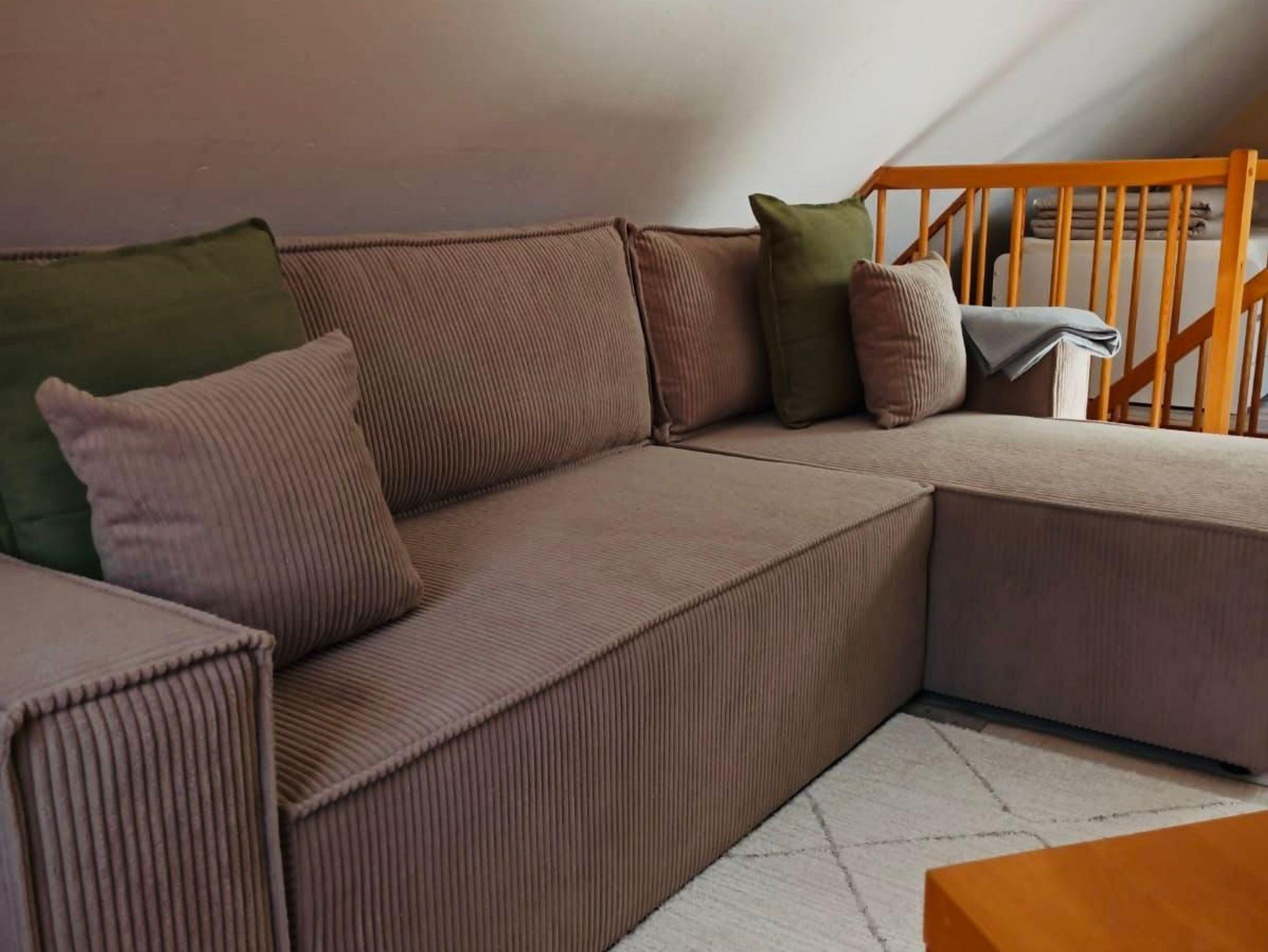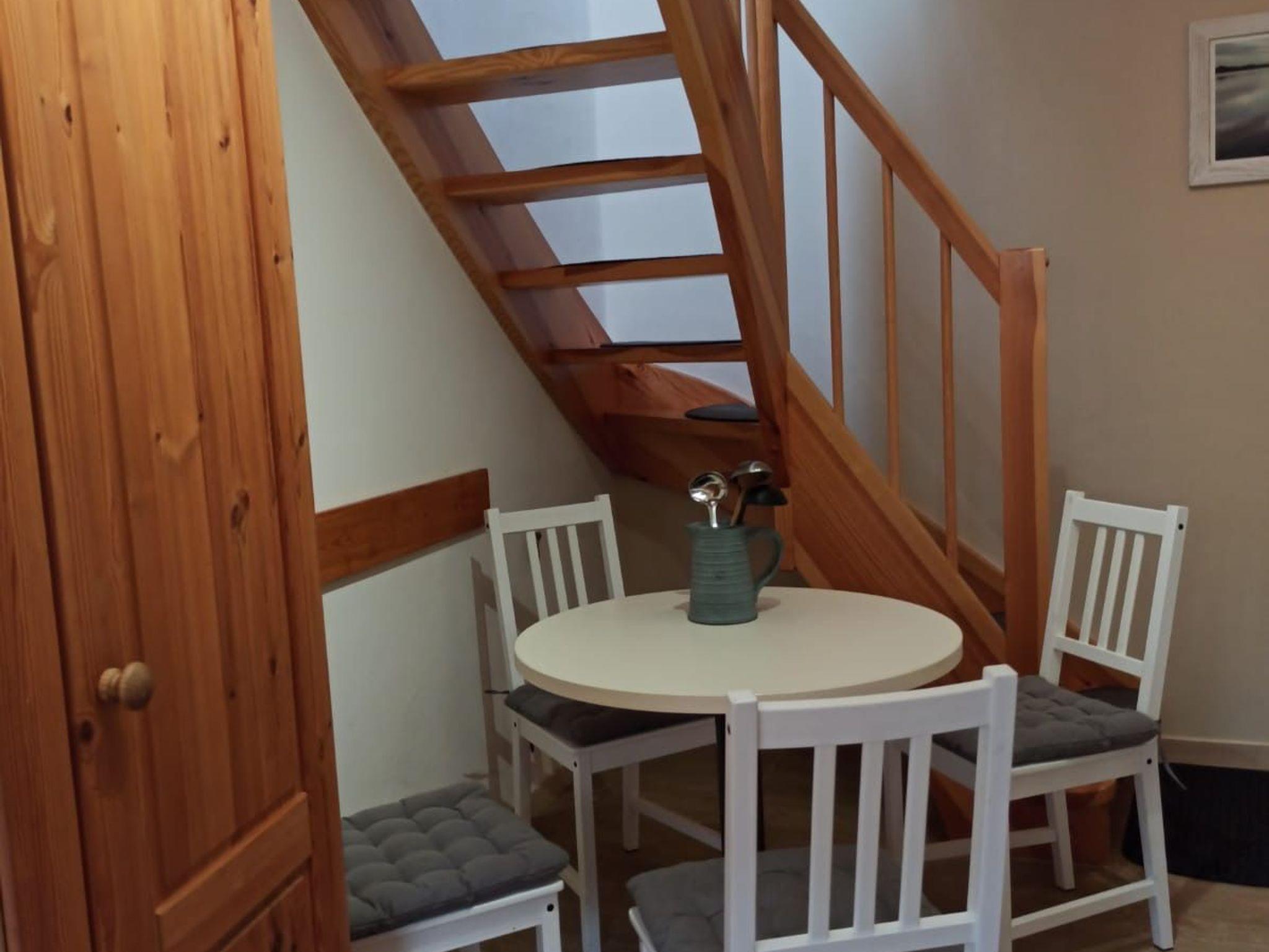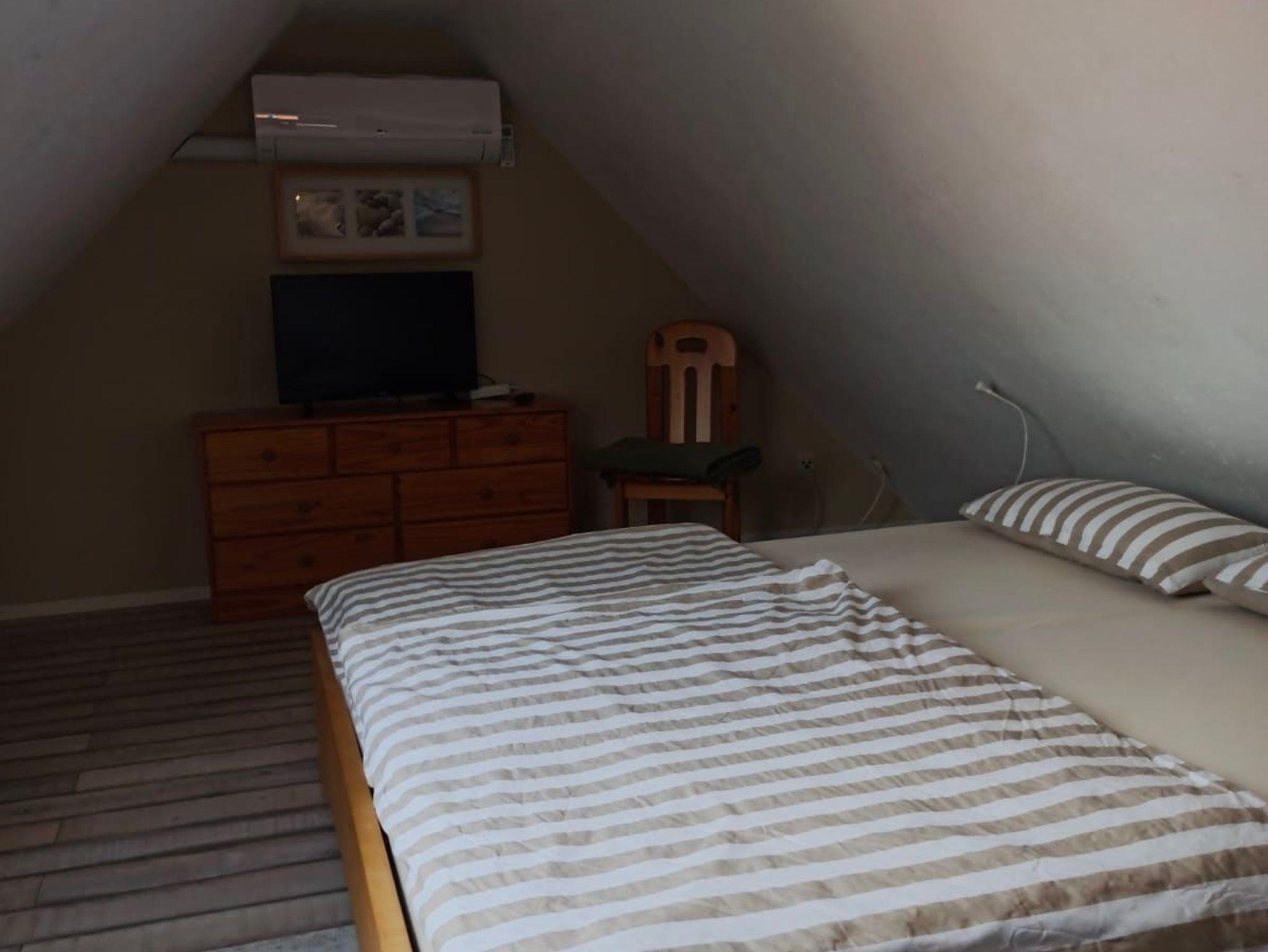 moderne Ausstattung auf 2 Etagen, Dachgeschoss mit schrägen Wänden und niedriger Deckenhöhe, Nichtraucherwohnung, Fußboden mit Fliesen und Laminat, 1 Bett 90 cm x 200 cm und 1 Doppelbett 180 cm x 200 cm, Fußbodenheizung und Elektroheizung. Eine Waschmaschine ist vorhanden.