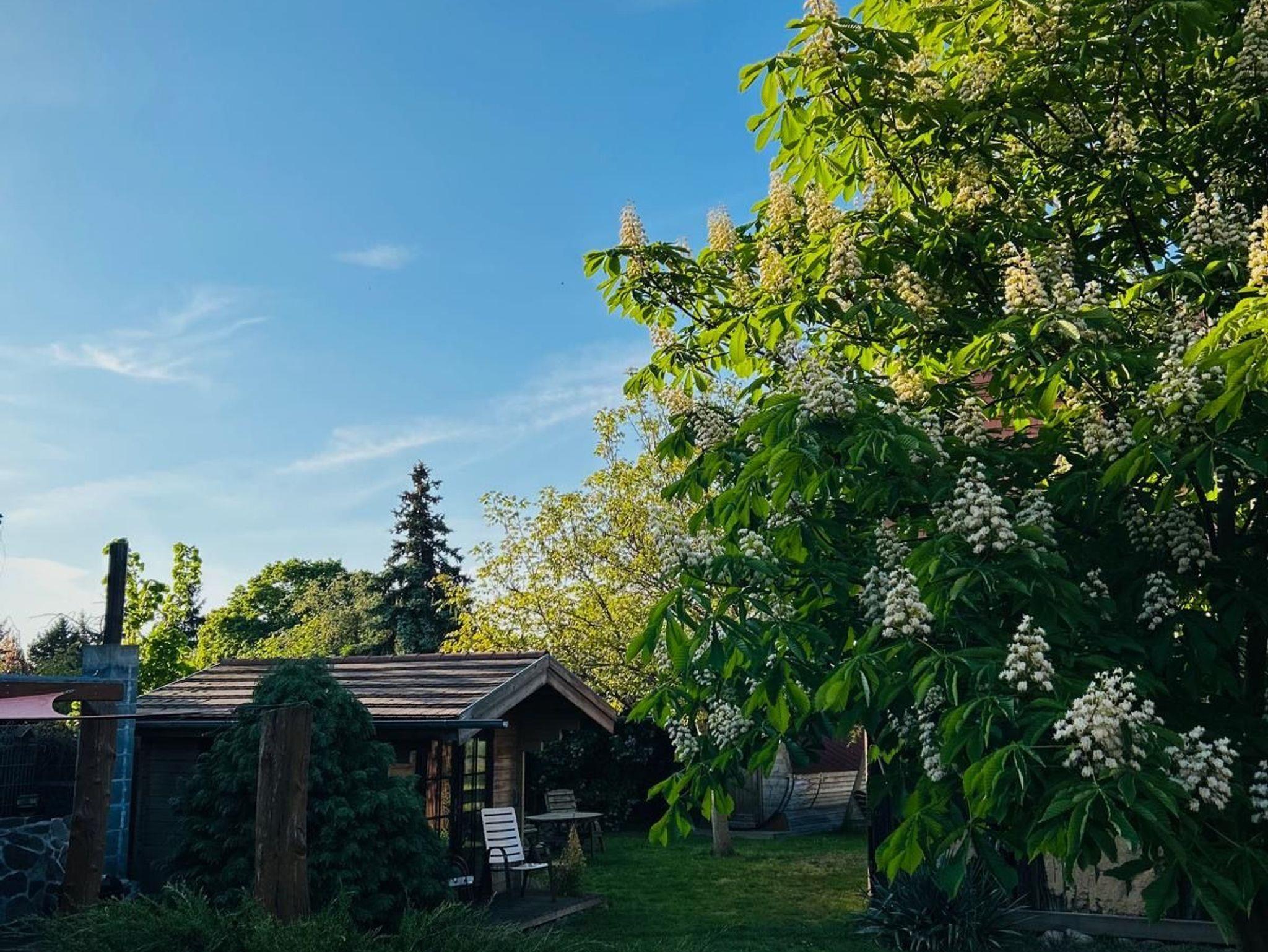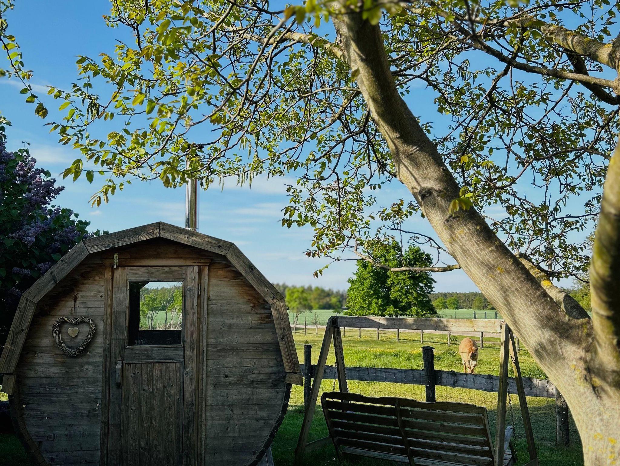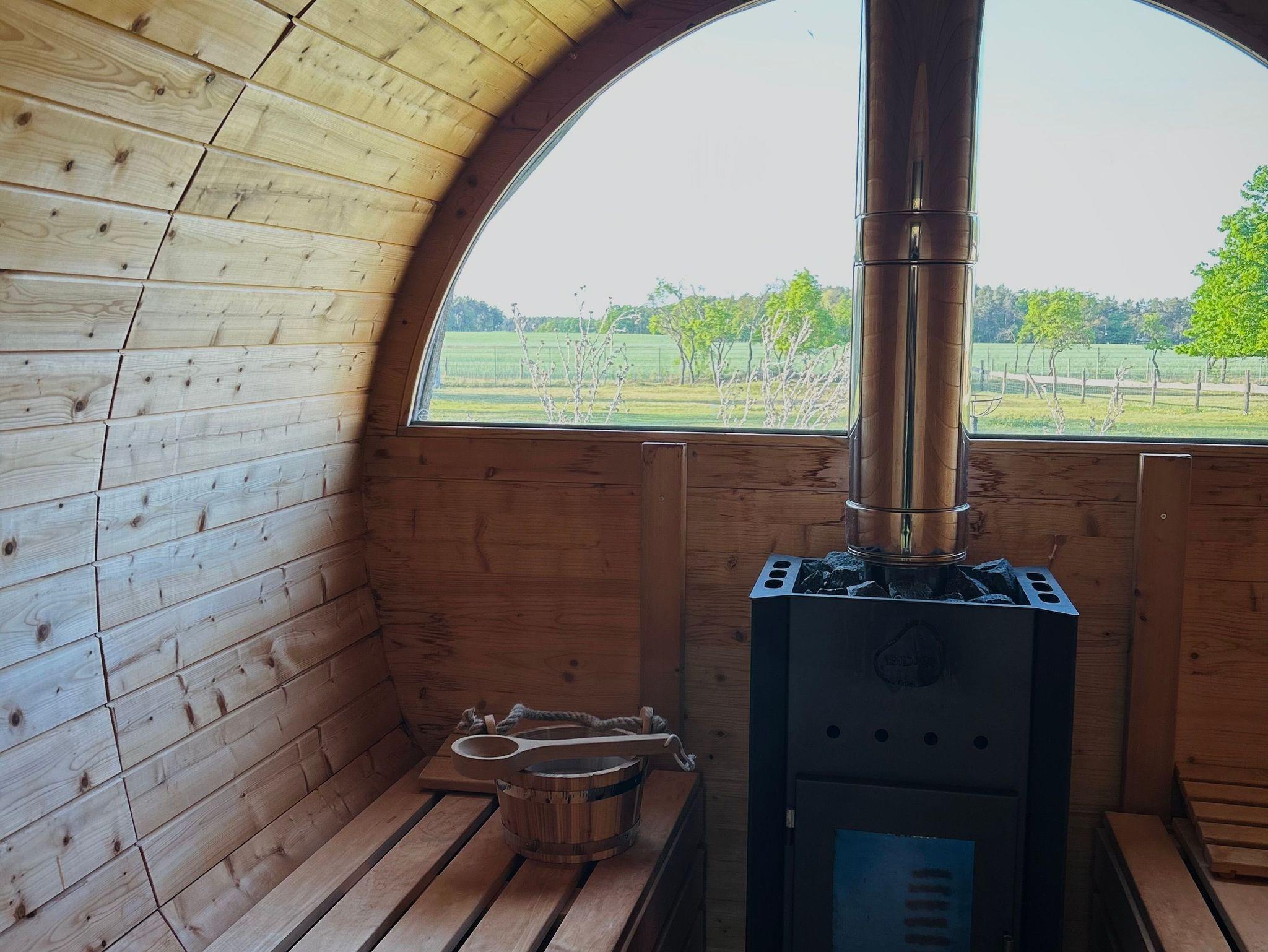Im Außenbereich ist eine Sauna (Faßsauna mit Holzofen) vorhanden. Ein Sitzplatz mit Glasüberdachung ist für alle Gäste vorhanden.