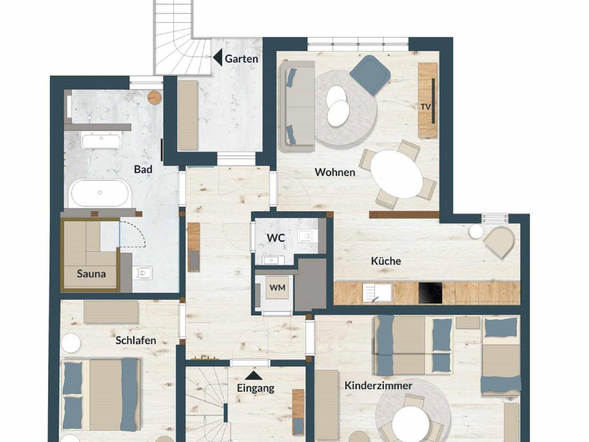 Das Familienapartment. Ein stilvoll-gemütliches Elternschlafzimmer und ein richtig großes Kinderzimmer mit drei Betten. Dazu noch Platz für bis zu zwei Kleinkinder im Babybett. Zusammenkommen im offenen Wohn- und Essbereich mit moderner Küche.