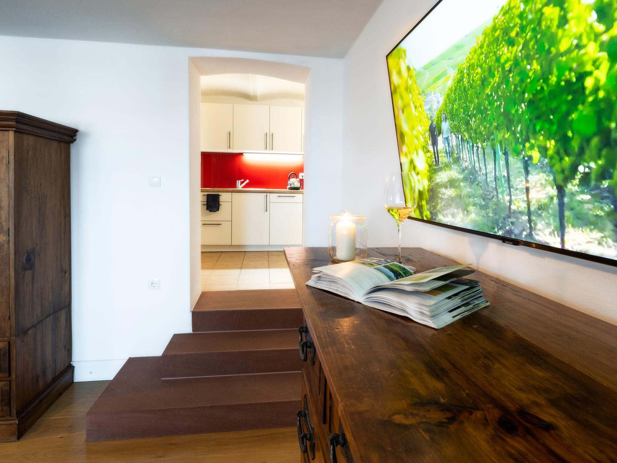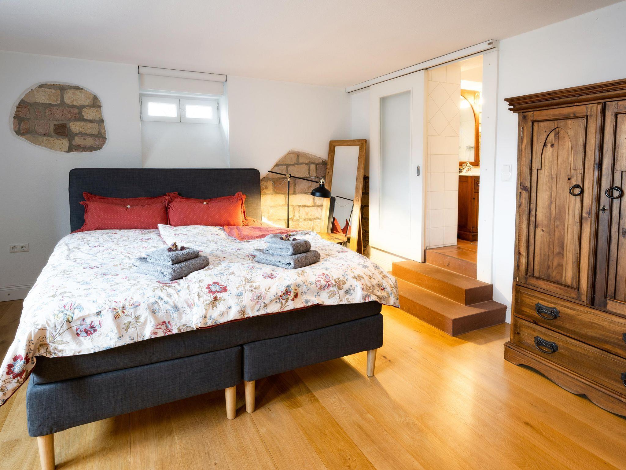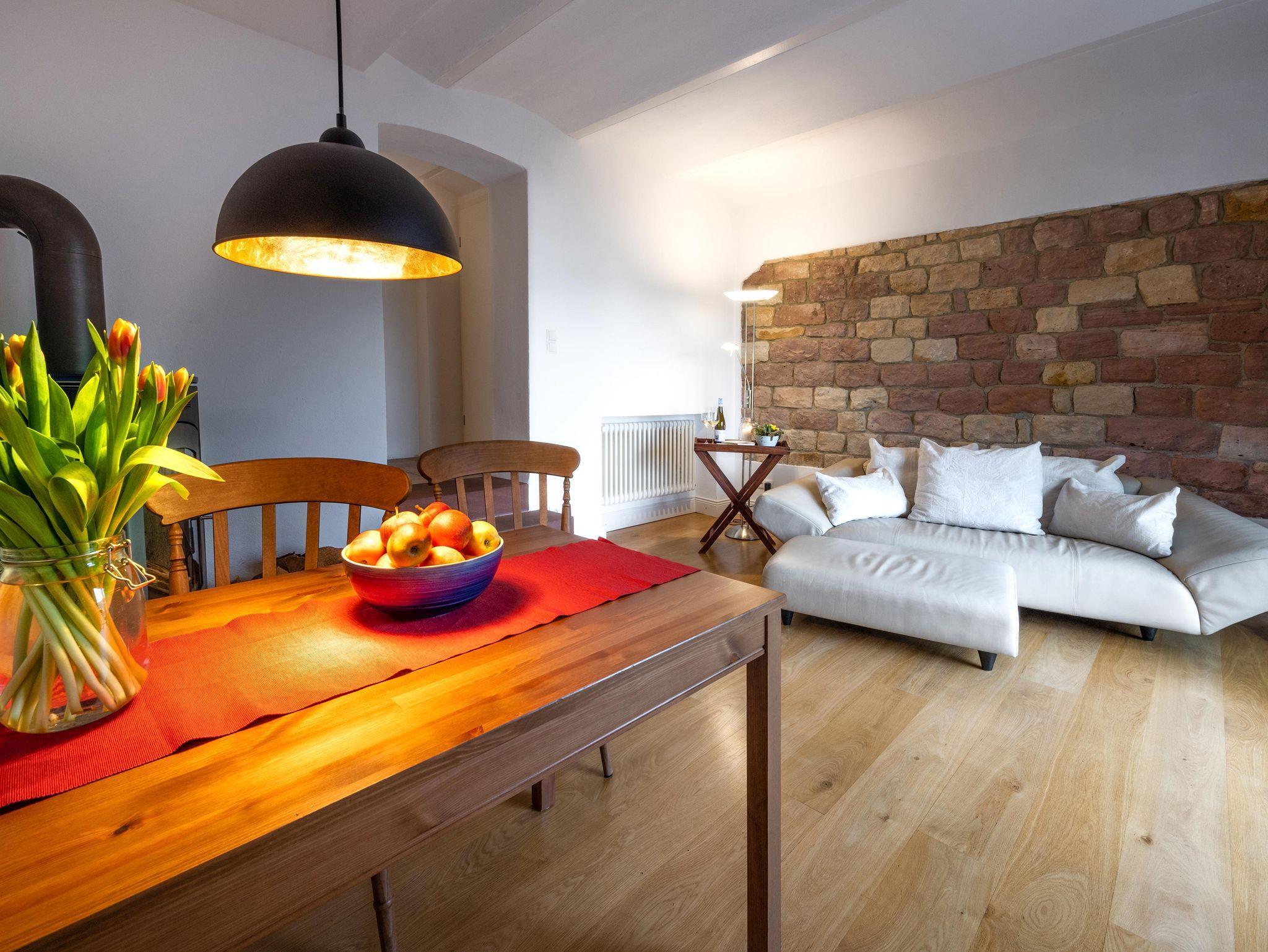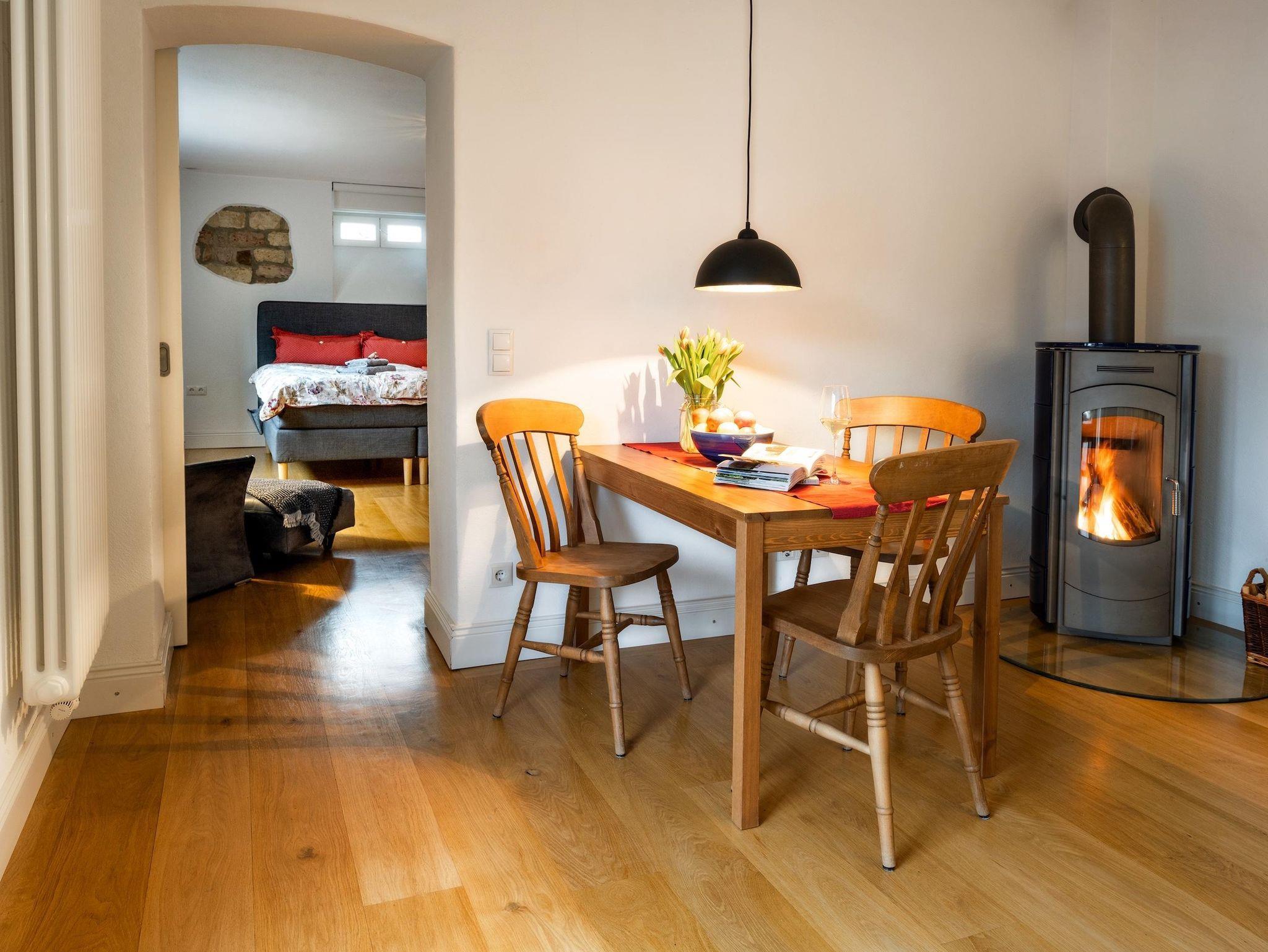 Die Ferienwohnung wurde 2020 im ebenerdig begehbaren Untergeschoss der Villa in Hanglage ausgebaut und hochwertig mit Eichenparkett, voll ausgestatteter Küche, benutzbarem Kaminofen (Holz inklusive) und Boxspringbett gemütlich eingerichtet.