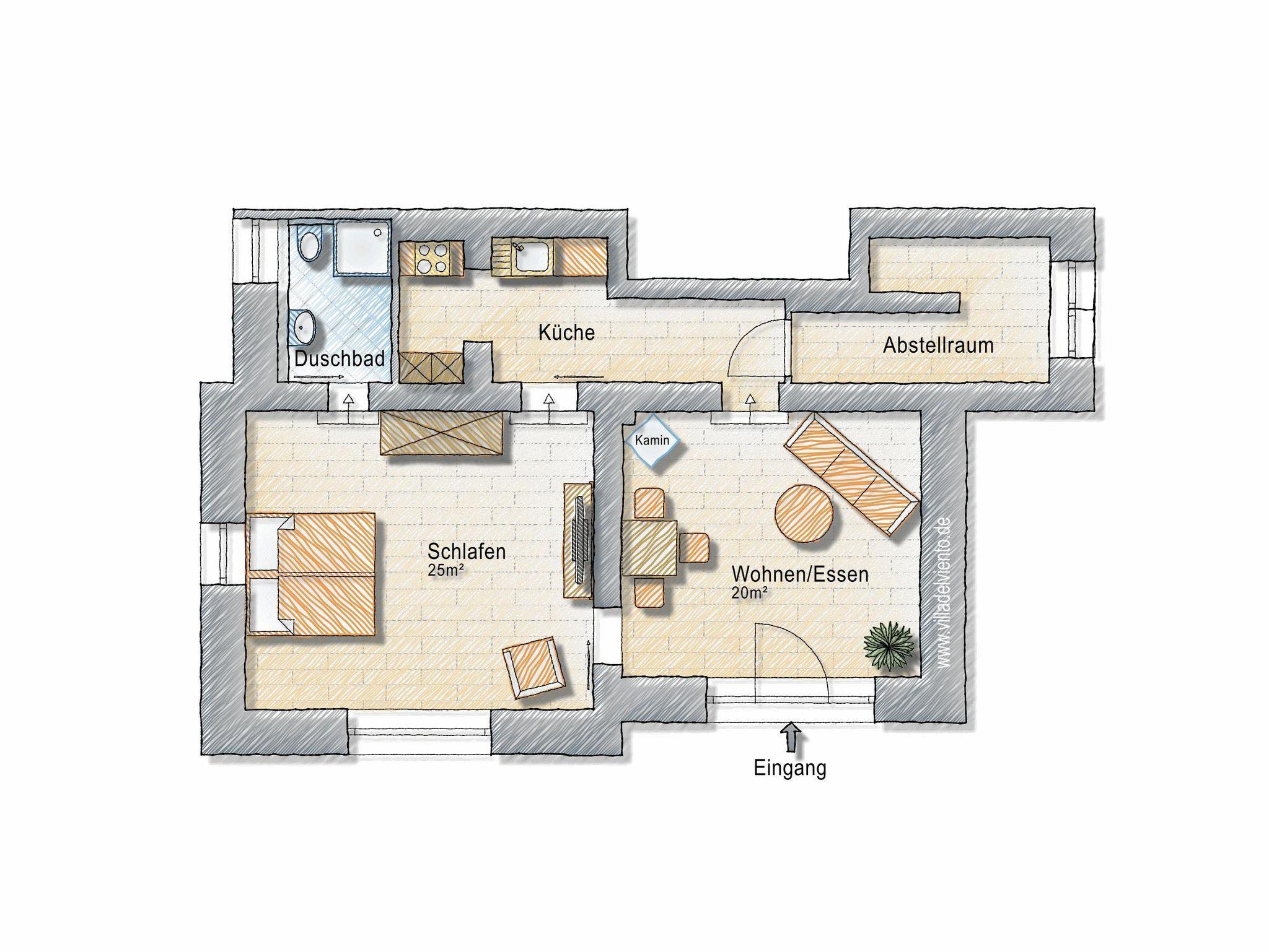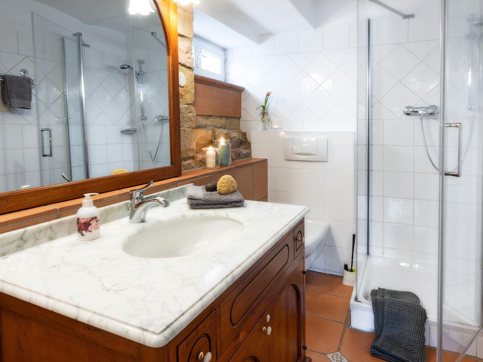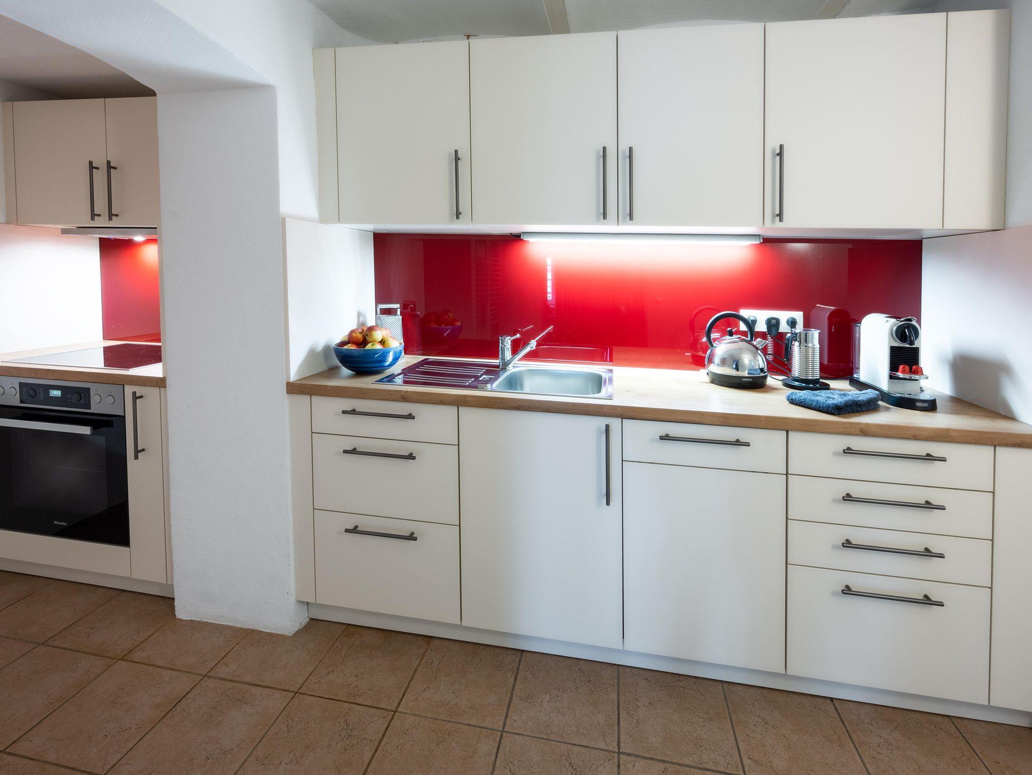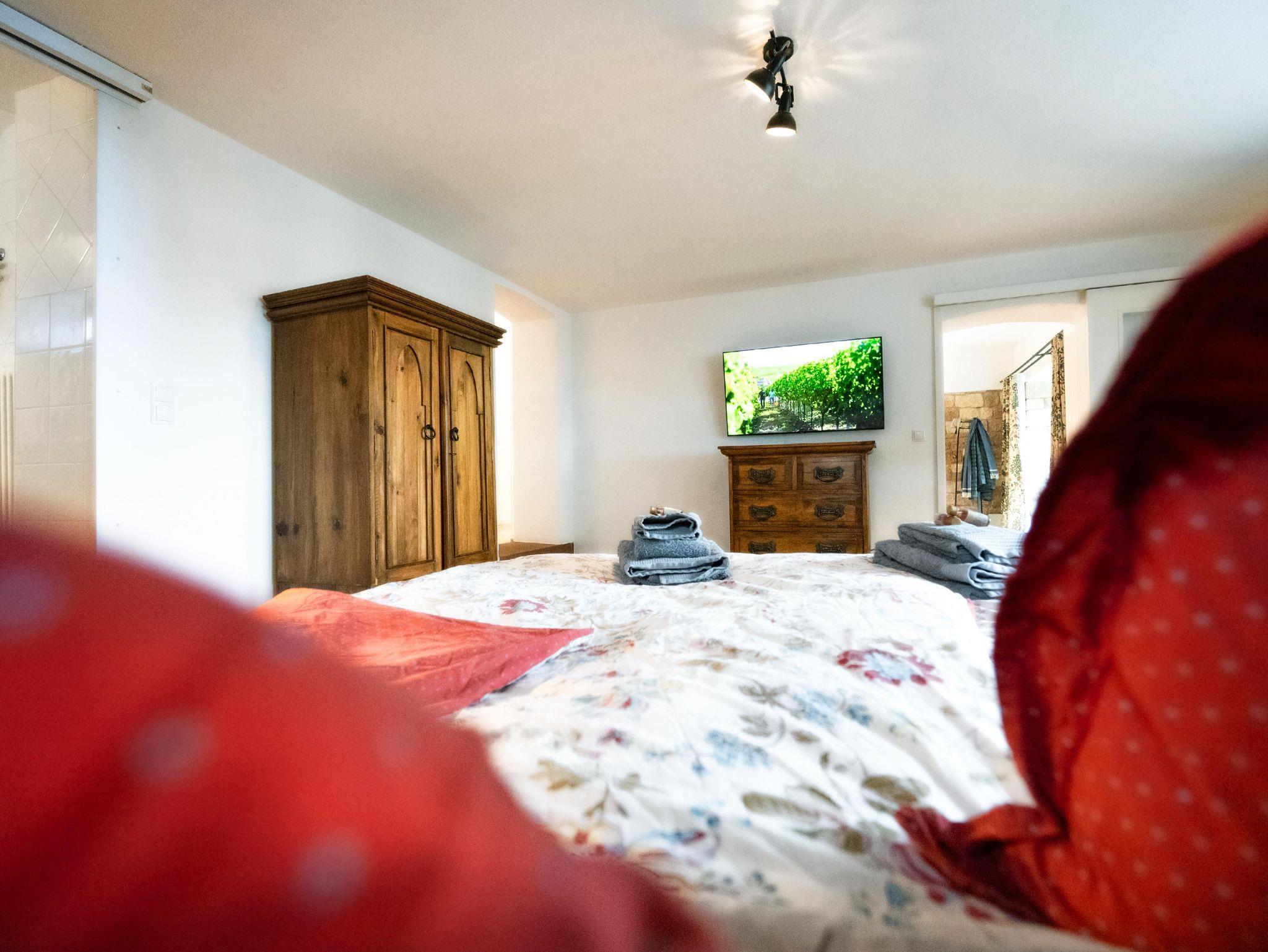 Die Ferienwohnung wurde 2020 im ebenerdig begehbaren Untergeschoss der Villa in Hanglage ausgebaut und hochwertig mit Eichenparkett, voll ausgestatteter Küche, benutzbarem Kaminofen (Holz inklusive) und Boxspringbett gemütlich eingerichtet.