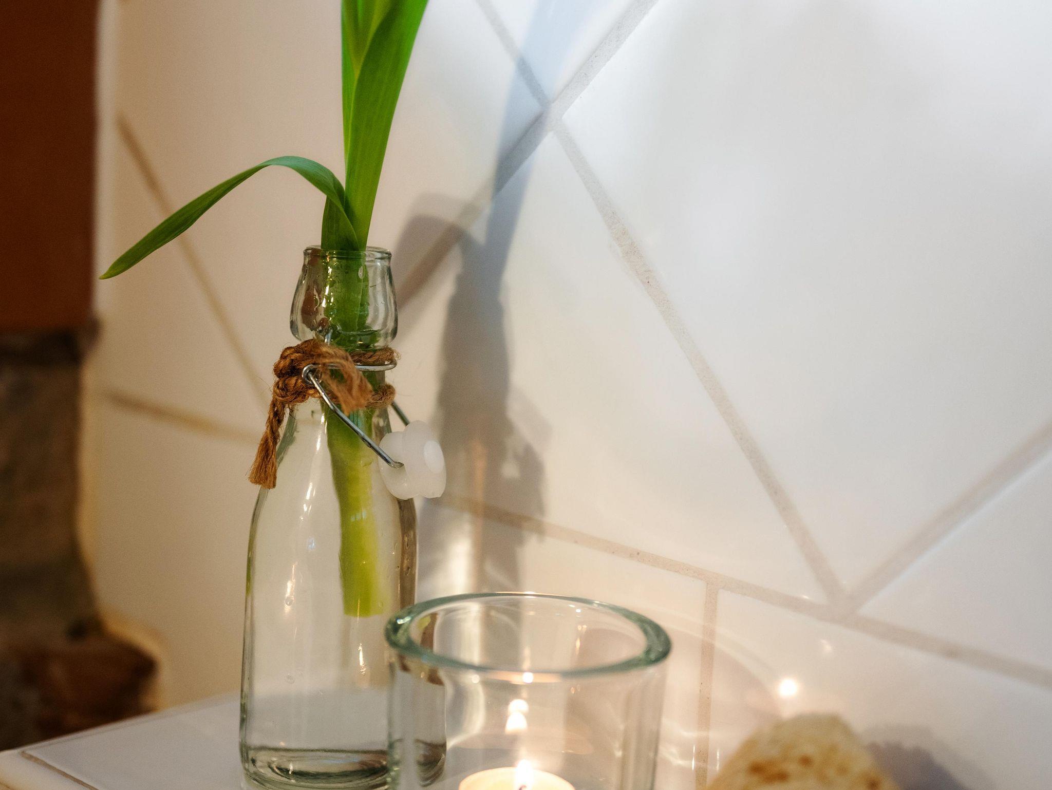 Gemütliches Schlafzimmer mit grossem Boxspringbett, Duschbad mit Handtüchern, Wohnzimmer mit Essplatz, nutzbarem Kaminofen (Holz inklusive) und Designersofa, Terrasse mit Blick über die Stadt, hochwertige voll ausgestattete Küche.