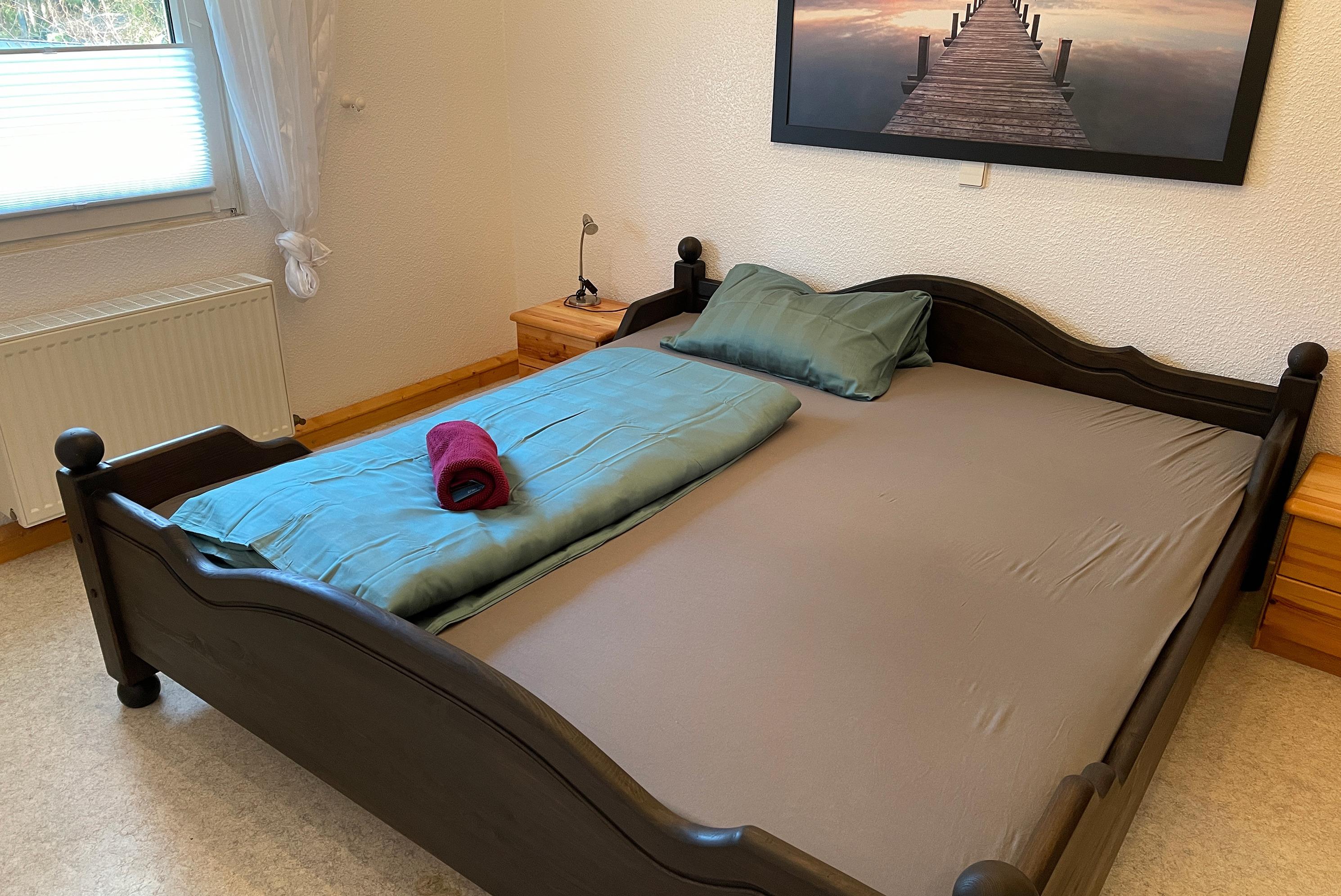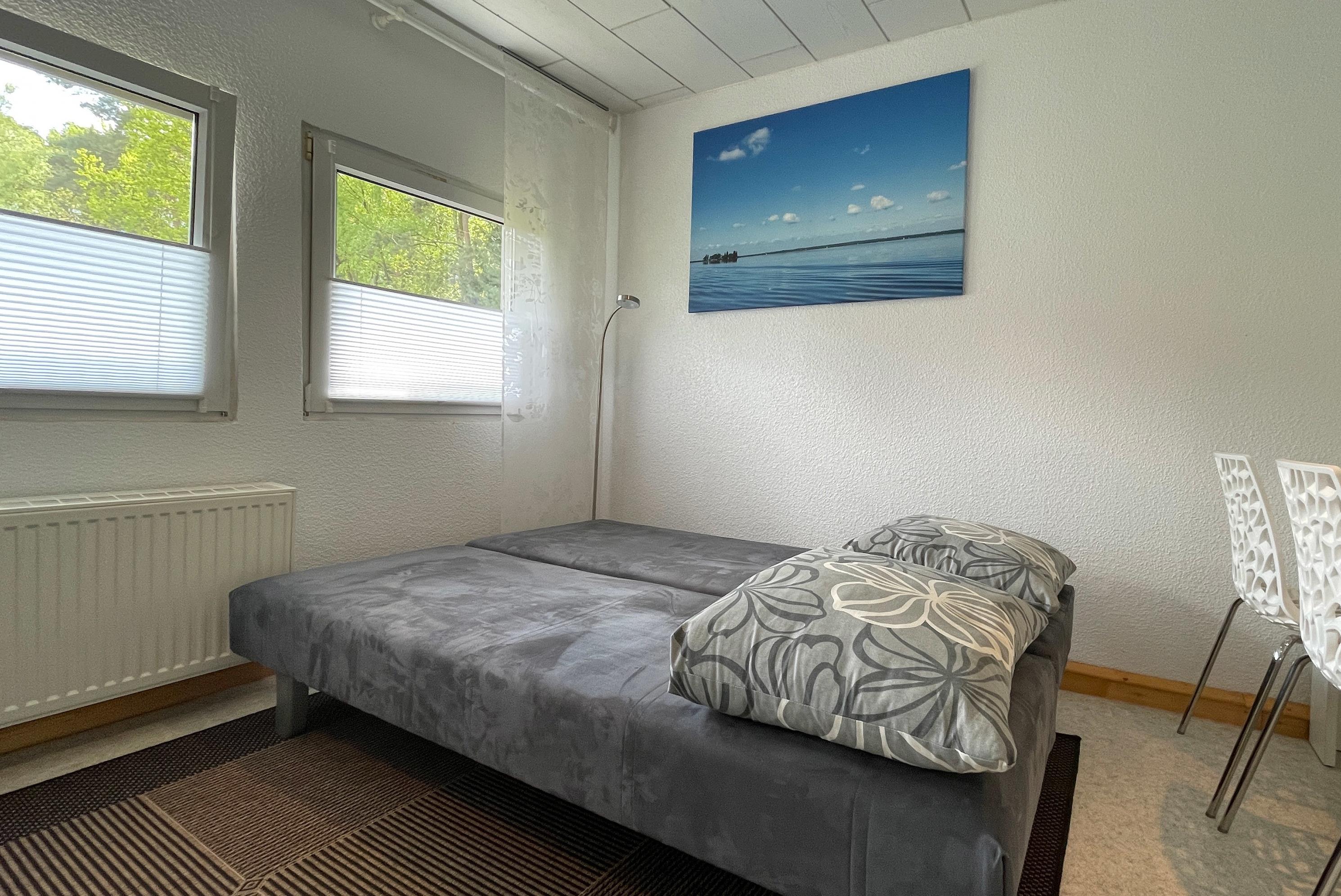 Im Ferienhaus finden Sie Erholung und Entspannung in einem komplett eingerichteten, gemütlichen Holzhäuschen. Das Haus bietet Platz für bis zu 3 Erwachsene. Das Ferienhaus hat ein großes Schlafzimmer mit Doppelbett (2 einzelne Matratzen). Eine Zusatzoption für die Übernachtung von Kindern oder einem dritten Gast bietet eine Schlafcouch (140 x 200 cm Liegefläche) im Wohnzimmer.