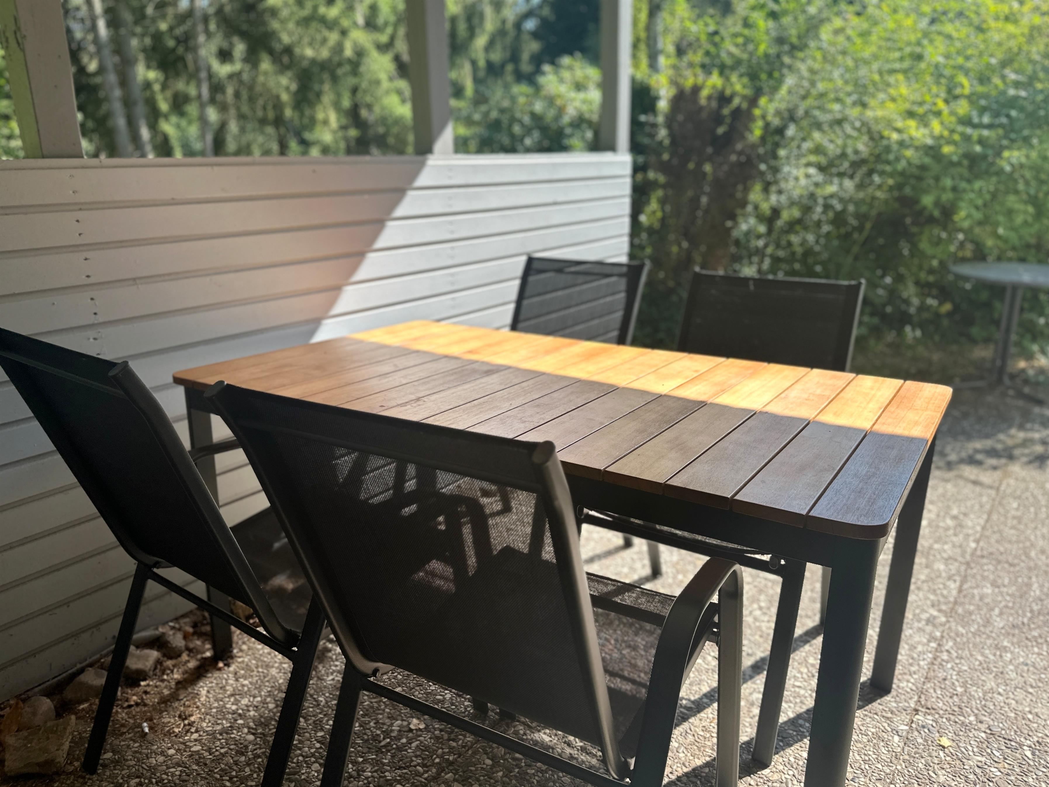 Vor dem Eingang befindet sich eine überdachte Terrasse mit Sitzgarnitur, rund ums Haus ein idyllischer Garten. Sie parken direkt vor der Tür auf dem eigenen Grundstück. Für radelnde Gäste steht ein sicherer Abstellplatz am Haus inkl. Steckdose für Elektrofahrräder bereit.