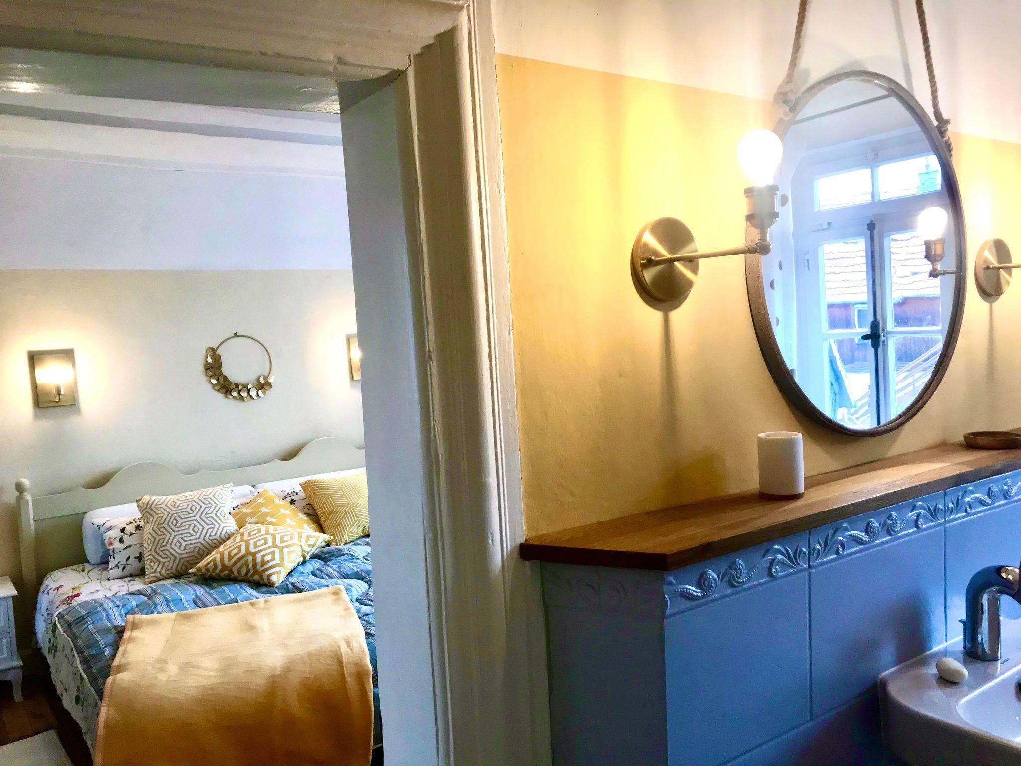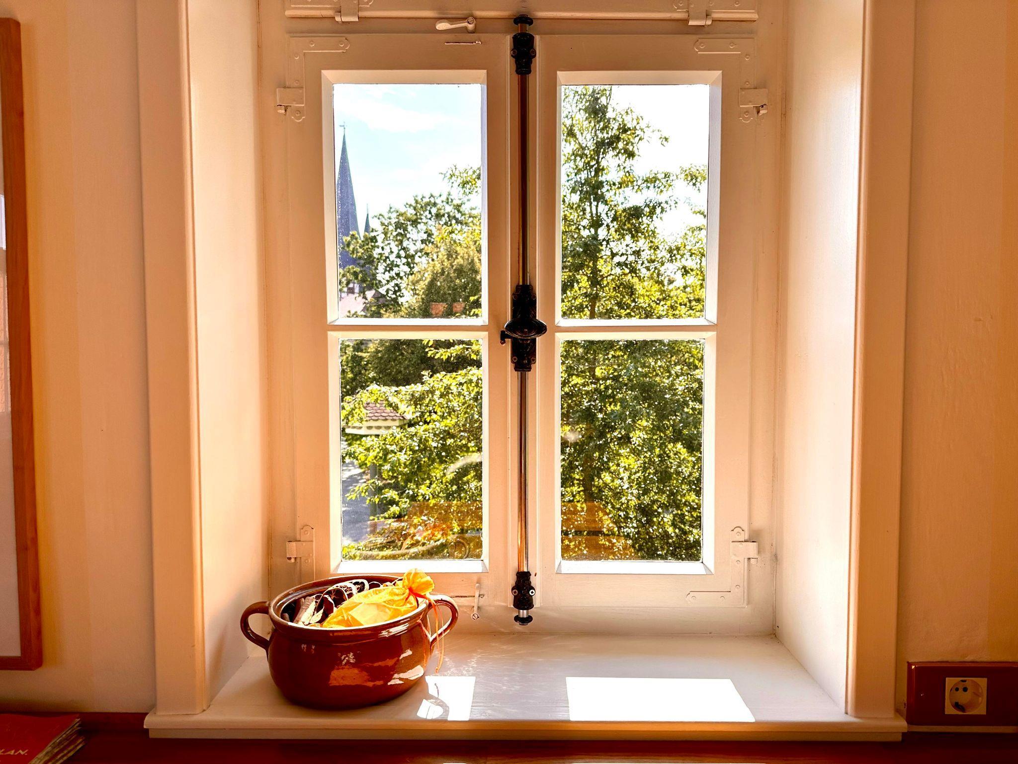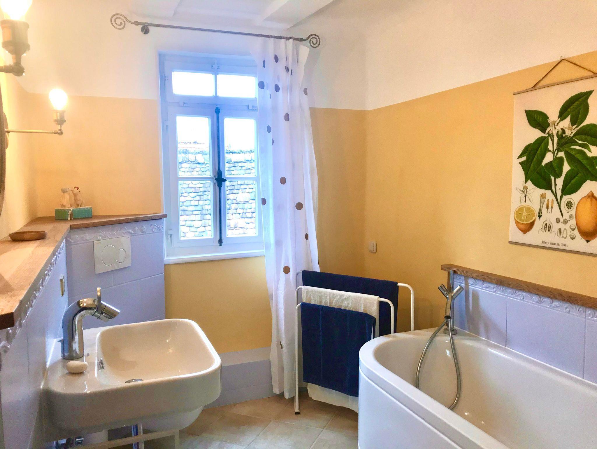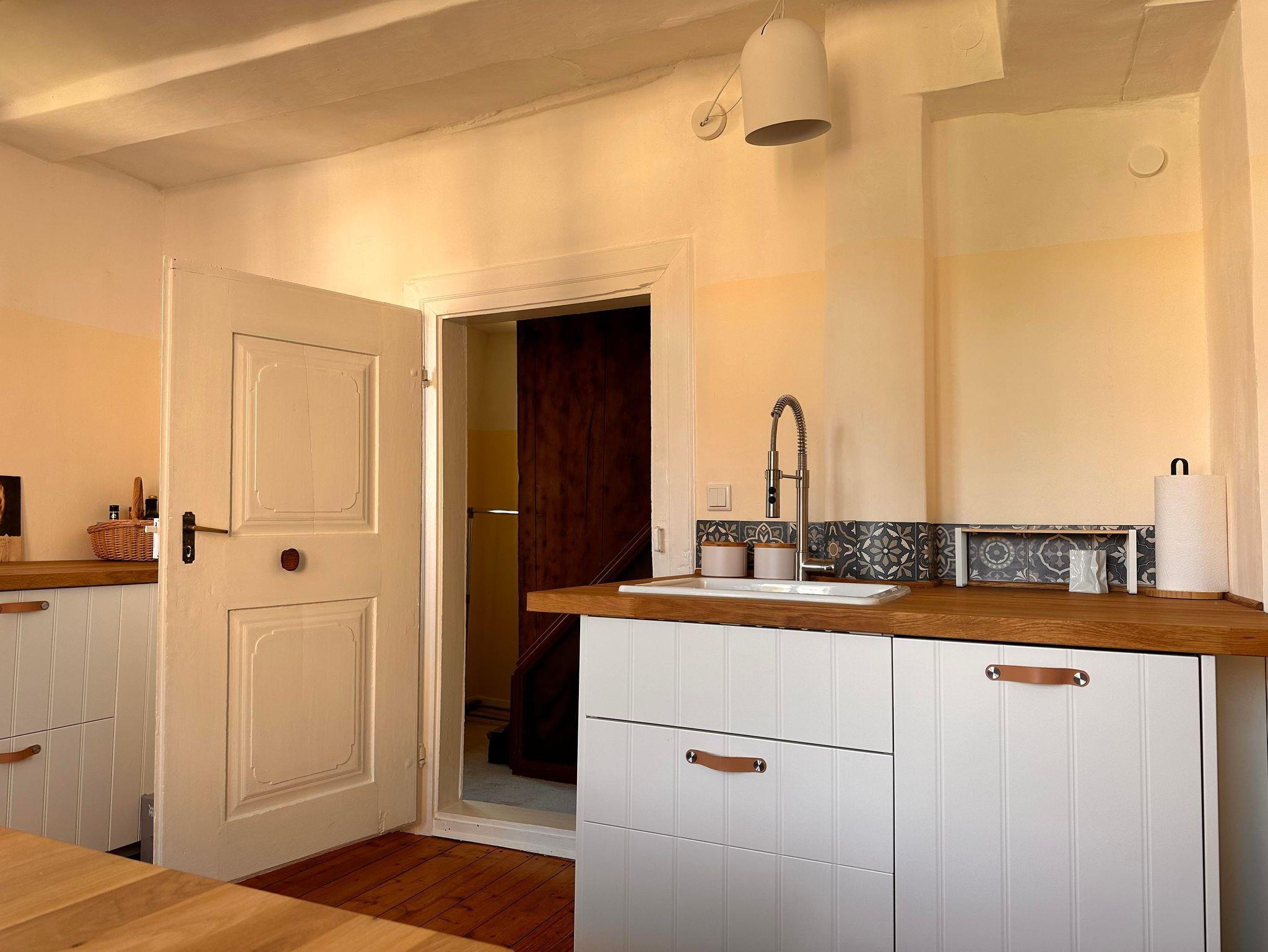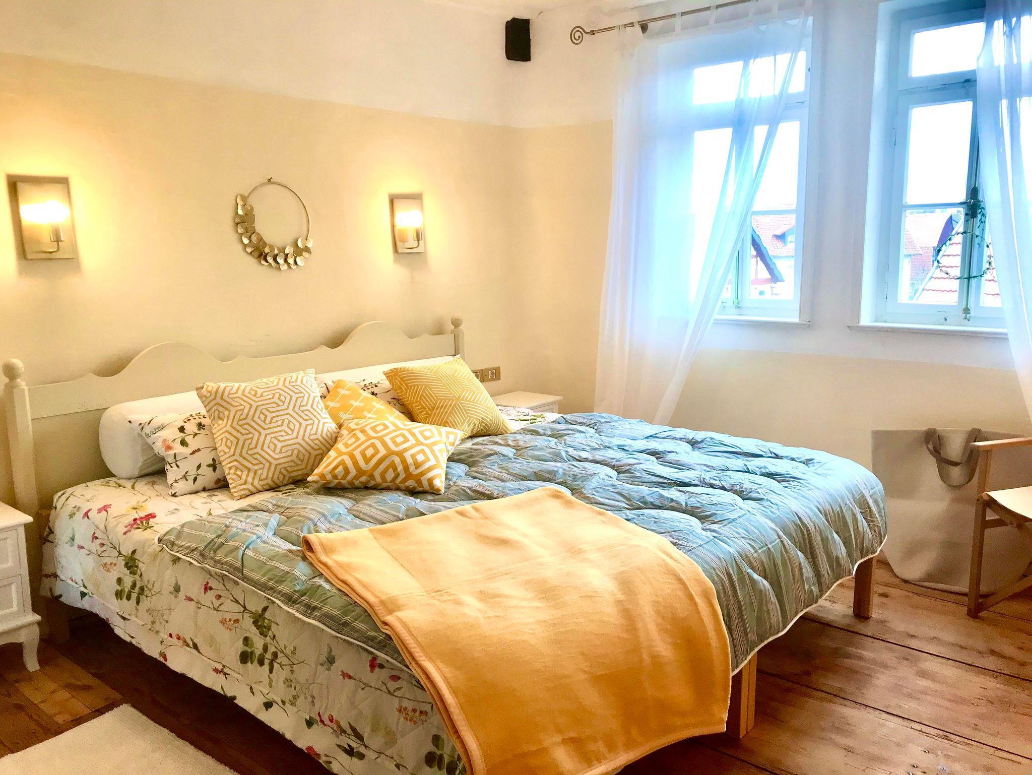 Zwei historische, schöne und stilvoll eingerichtete Schlafzimmer erwarten Sie, beide mit eigenen Bädern en Suite, komplett ausgestattet mit viel Schrankraum, 1,60 - 1.80 m breiten Betten und Ablageflächen. Dazu gibt es noch ein extra WC. Das große Wohnzimmer verfügt über eine bequeme Schlafcouch, einen Schreibtisch, einen Fernseher und viele Bücher. Die große Wohnküche ist mit allem ausgestattet: Herd, Backofen mit Mikrowellen-Funktion, Spülmaschine, Kaffeemaschine, Wasserkocher, Abzughaube, Pfannen und Töpfe, Geschirr, Gläser, Tassen, Besteck, Putzzeug, Staubsauger etc. Für Ihre Sicherheit sorgen Rauchmelder und Feuerlöscher. Aus allen Zimmern haben Sie einen fantastischen Blick auf die historische Altstadt mit Junker-Hansen-Turm (größter Fachwerkrundbau weltweit) und Dörnbergschem Schloß.