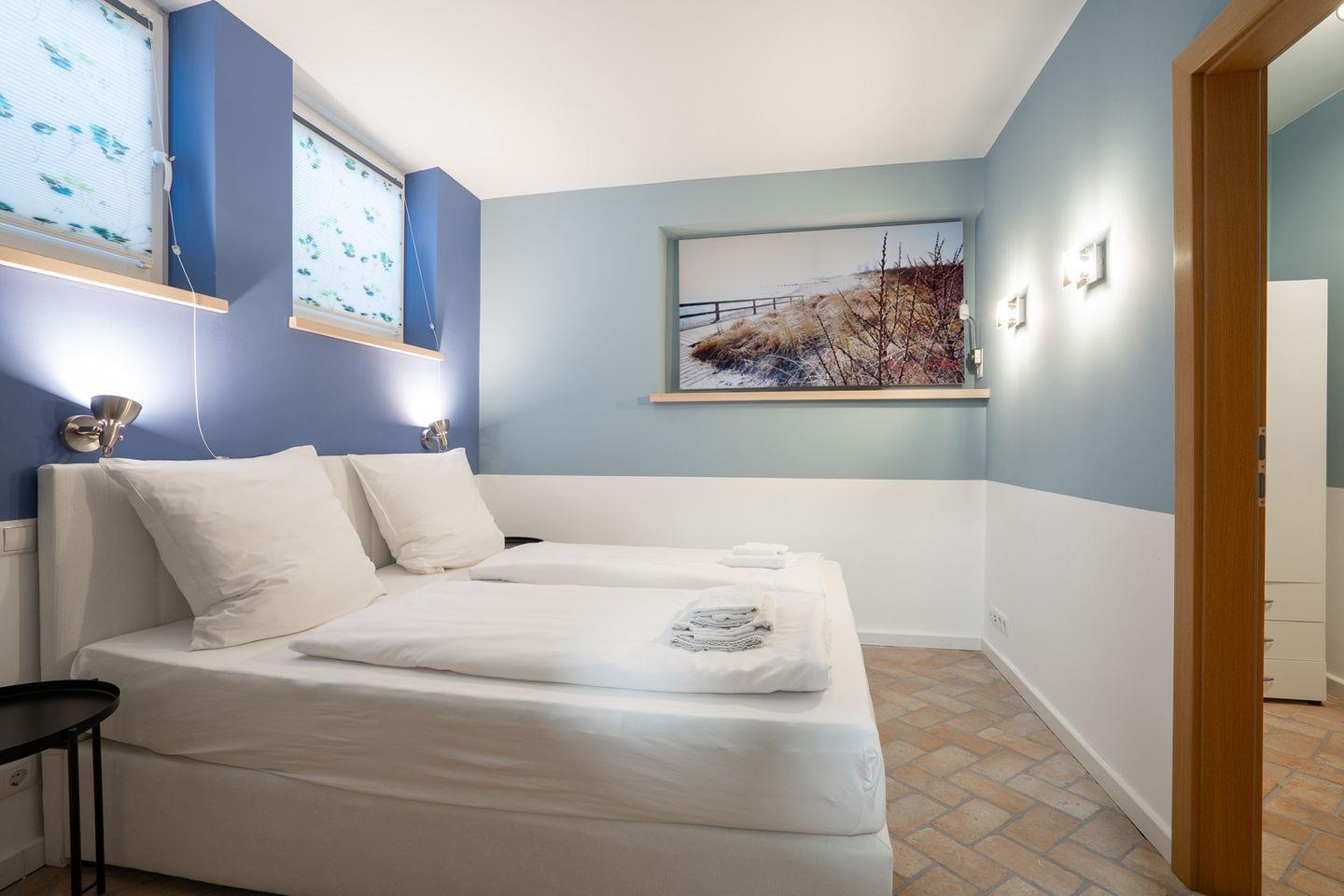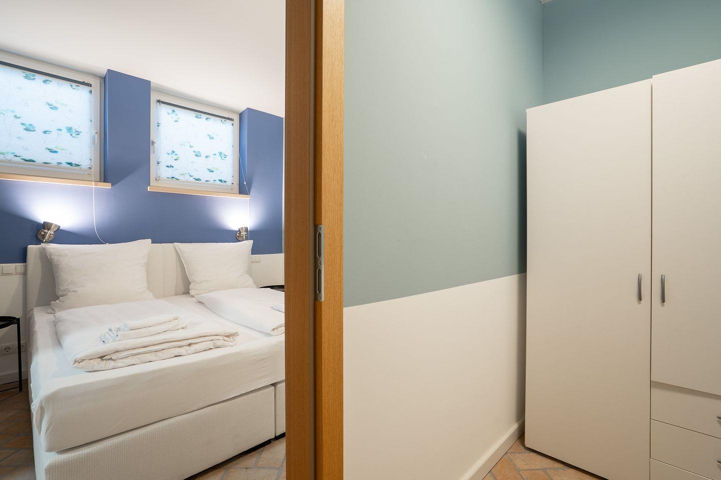 Im unteren Bereich der Wohnung befindet sich ein weiteres Schlafzimmer mit Doppelbett. Von hier aus gelangen Sie in ein separates Ankleidezimmer mit Kleiderschrank – ideal für längere Aufenthalte. Ein zweites, separates Badezimmer mit Dusche, WC und Waschtisch bietet zusätzlichen Komfort und Privatsphäre.