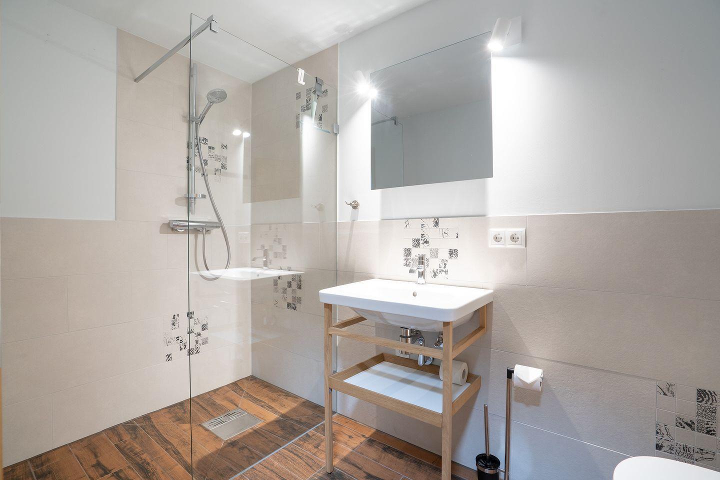 Im oberen Stockwerk erwartet Sie ein helles Schlafzimmer mit Doppelbett, TV und Kleiderschrank – der perfekte Rückzugsort zum Ausschlafen und Entspannen. Der angrenzende, möblierte Balkon mit Grill bietet herrliche Möglichkeiten für laue Abende unter freiem Himmel. Das großzügige Badezimmer auf dieser Etage überzeugt mit Badewanne, ebenerdiger Dusche, WC, stilvollem Waschtisch – und als besonderes Highlight: einer privaten Sauna für Ihr persönliches Wellness-Erlebnis.
