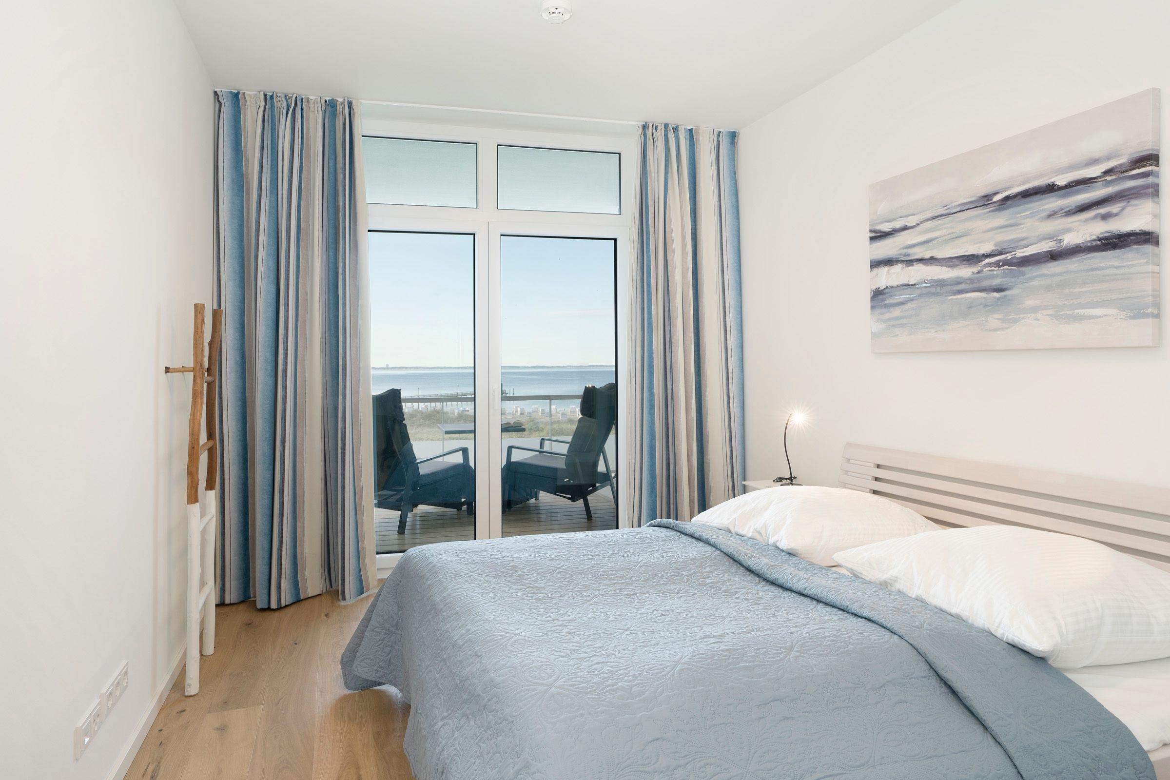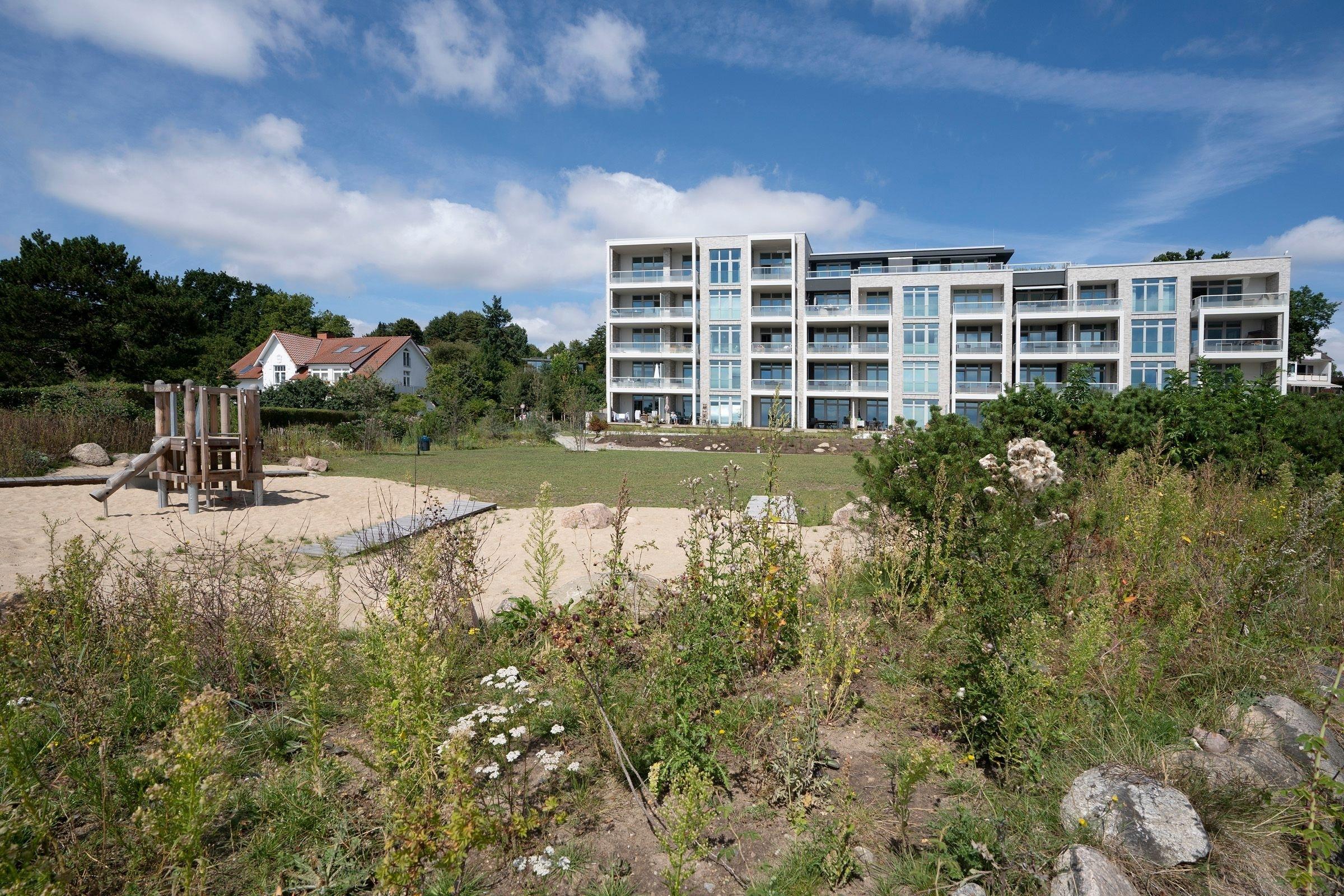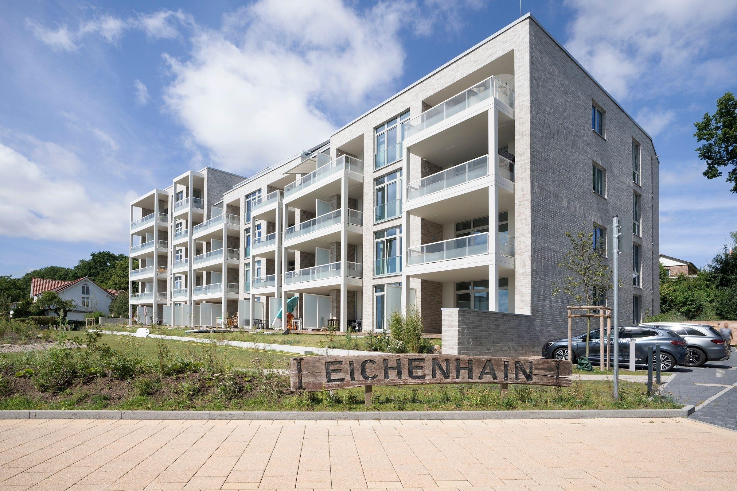 Der kombinierte Wohn- und Essbereich ist stets lichtdurchflutet und grenzt offen an die voll ausgestattete Küchenzeile. Unmittelbar vor der großen Fensterfront mit Blick auf die Ostsee steht Ihnen ein komfortables Sofa (Schlafmöglichkeit, 140x200 cm) mit Sichtschutzplissees zur Verfügung. Ein großer Flachbildfernseher sorgt für Unterhaltung. Das separate Schlafzimmer mit Doppelbett (2x 90x200 cm), Verdunkelungsgardinen und Kleiderschrank bietet Ihnen ebenfalls Zugang zum Balkon. Das innenliegende Badezimmer erwartet Sie mit WC, bodengleicher Dusche und beheizbarem Handtuchhalter. Viele erholsame Stunden können Sie auf dem überdachten, möblierten Balkon verbringen und dabei den Ausblick auf die Ostsee genießen. Den Gästen im Eichenhain steht außerdem ein gemeinschaftlich genutzter Garten inklusive Sandspielplatz zur Verfügung.