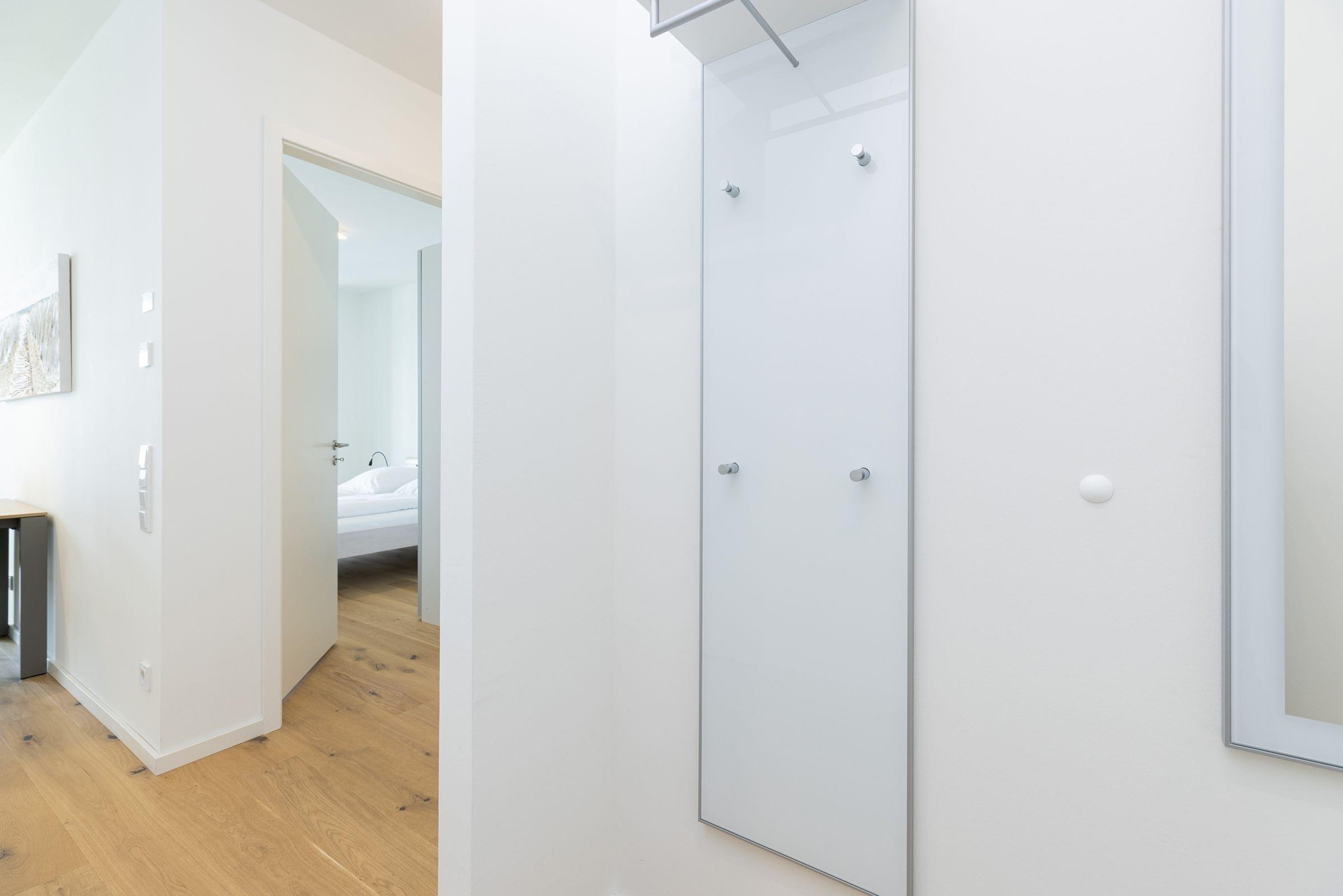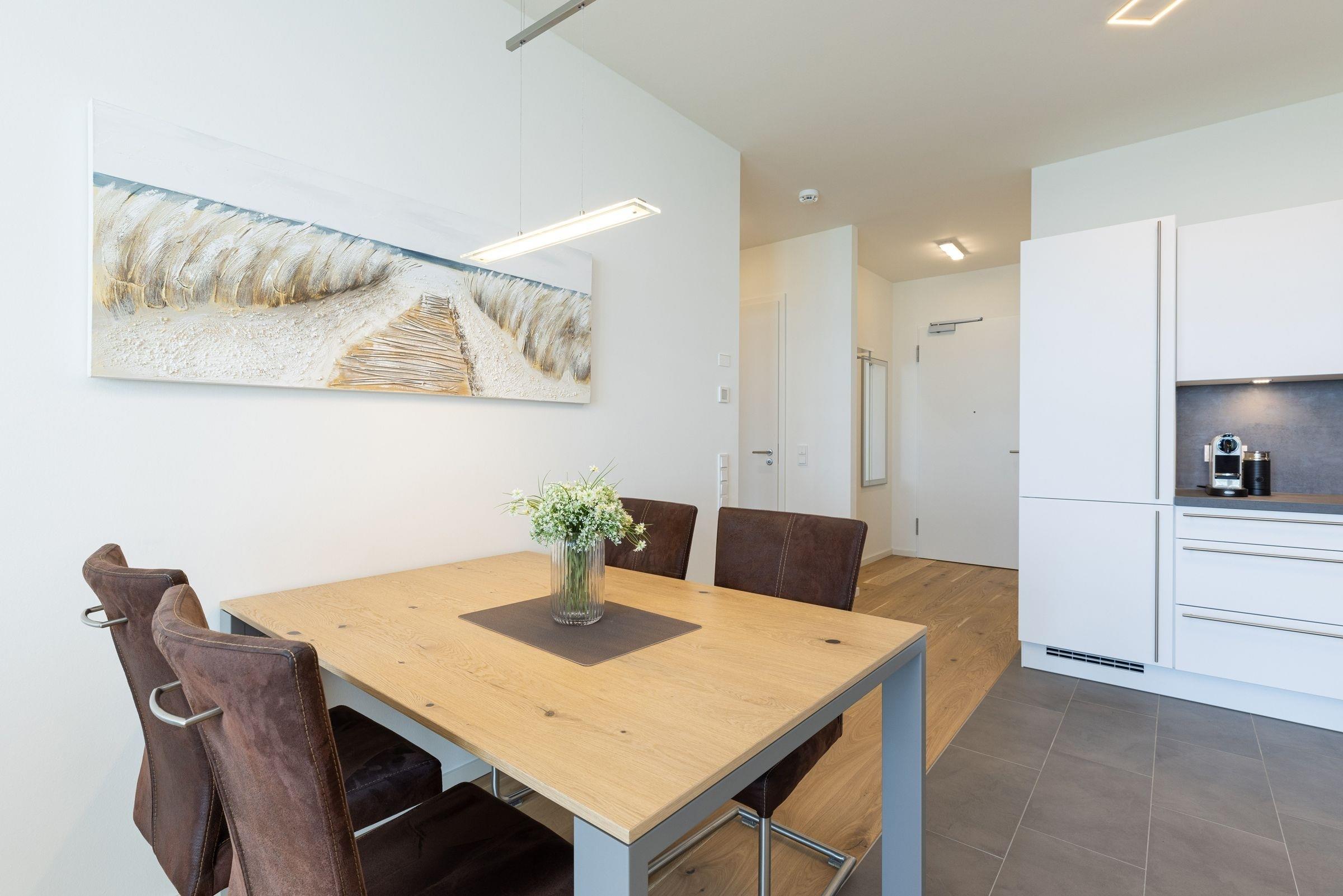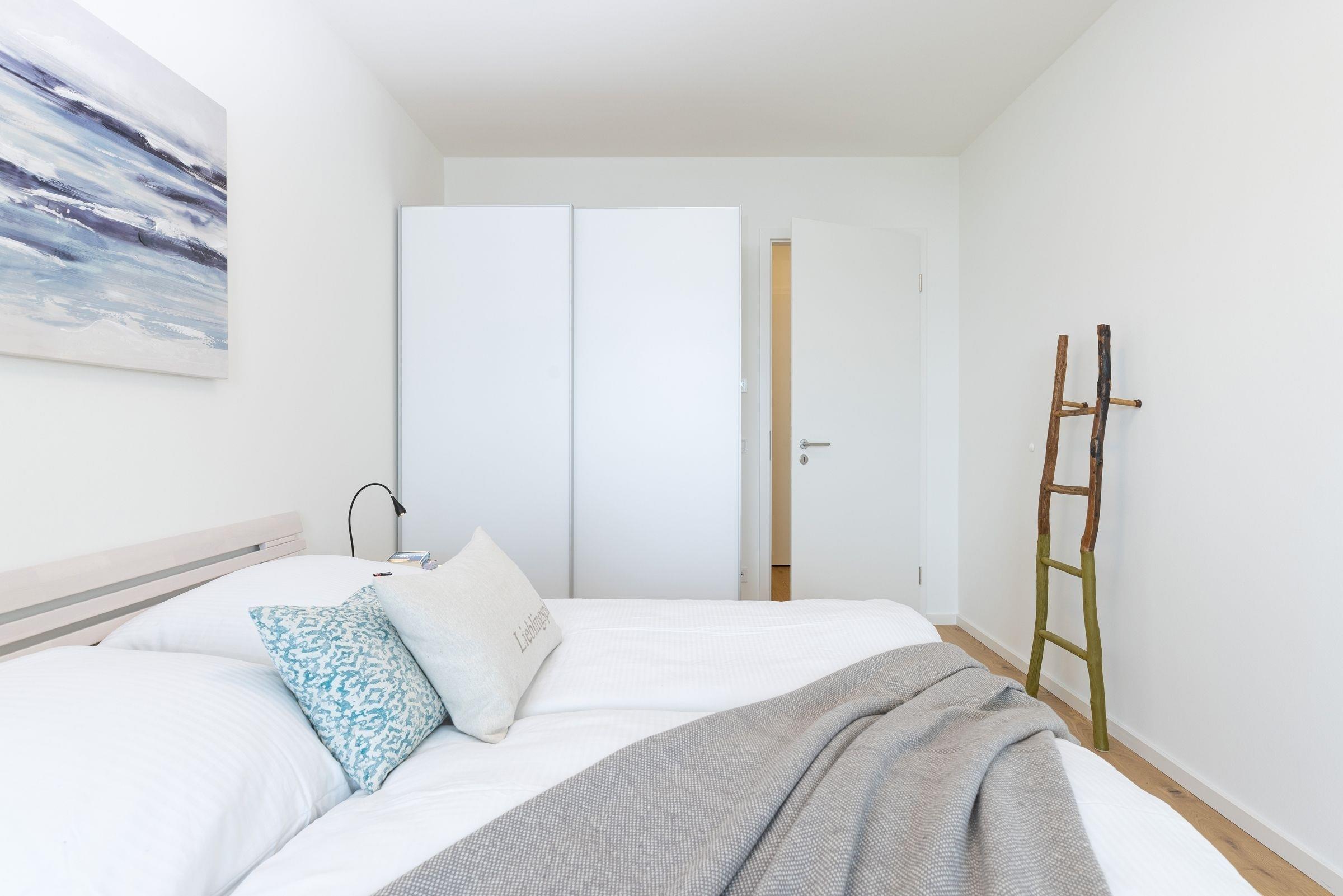Der kombinierte Wohn- und Essbereich ist stets lichtdurchflutet und grenzt offen an die voll ausgestattete Küchenzeile. Unmittelbar vor der großen Fensterfront mit Blick auf die Ostsee steht Ihnen ein komfortables Sofa (Schlafmöglichkeit, 140x200 cm) mit Sichtschutzplissees zur Verfügung. Ein großer Flachbildfernseher sorgt für Unterhaltung. Das separate Schlafzimmer mit Doppelbett (2x 90x200 cm), Verdunkelungsgardinen und Kleiderschrank bietet Ihnen ebenfalls Zugang zum Balkon. Das innenliegende Badezimmer erwartet Sie mit WC, bodengleicher Dusche und beheizbarem Handtuchhalter. Viele erholsame Stunden können Sie auf dem überdachten, möblierten Balkon verbringen und dabei den Ausblick auf die Ostsee genießen. Den Gästen im Eichenhain steht außerdem ein gemeinschaftlich genutzter Garten inklusive Sandspielplatz zur Verfügung.