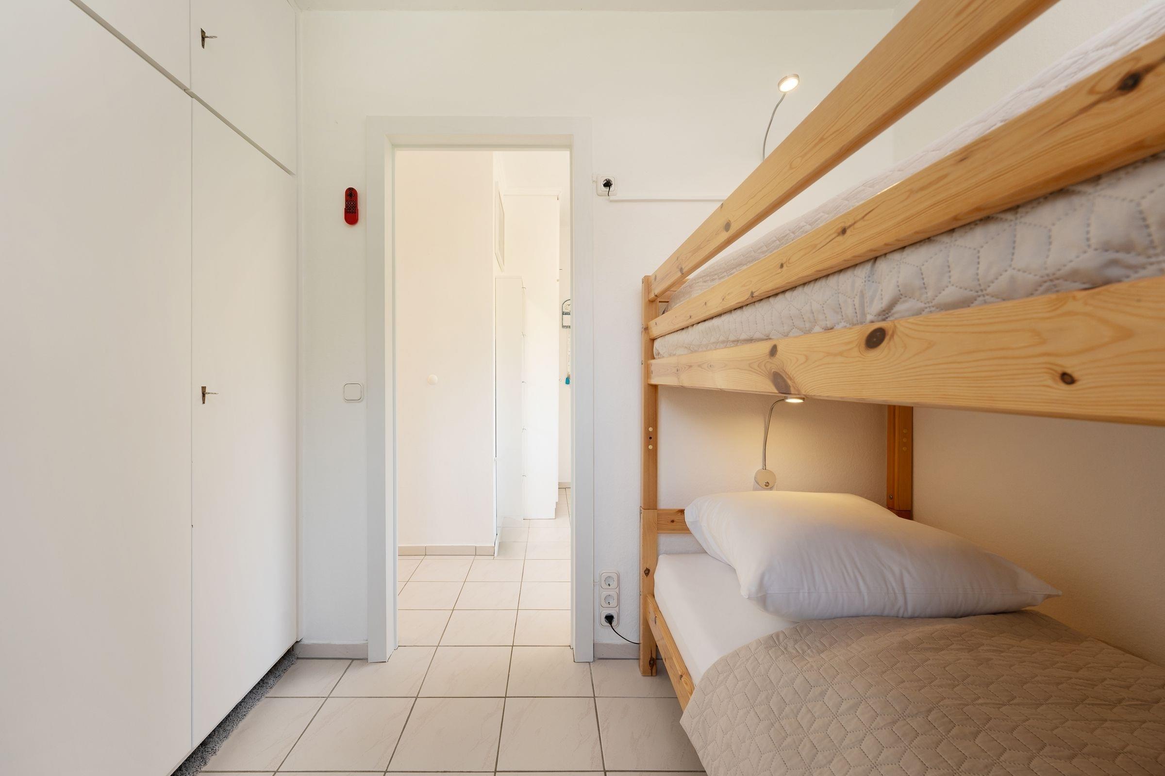 Treten Sie vom Flur direkt in den hellen Wohnbereich, dem es mit einem gemütlichen Sofa, einem Esstisch und einem TV an nichts fehlt. Die offene Küchenzeile ist voll ausgestattet und bietet viele Annehmlichkeiten wie z.B. einen Herd, einen Kühlschrank und eine Spülmaschine. Ihre zubereiteten Speisen können Sie auf dem angrenzenden Balkon genießen, während Sie die letzten Sonnenstrahlen des Tages einfangen. Eins der separaten Schlafzimmer ist mit einem Doppelbett (2x 80x200 cm), Kleiderschrank und TV möbliert. Im zweiten separaten Schlafzimmer bietet ein Etagenbett zwei gemütliche Schlafplätze für Kinder (je 90x200 cm. Das moderne, innenliegende Badezimmer ist mit einer Dusche, einem WC und einem beleuchteten Spiegel über dem Waschtisch ausgestattet, sodass Sie sich morgens für einen entspannten Urlaubstag zurecht machen können.