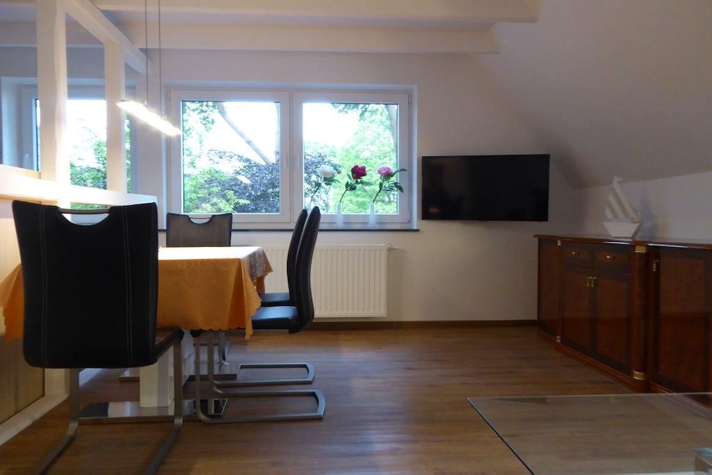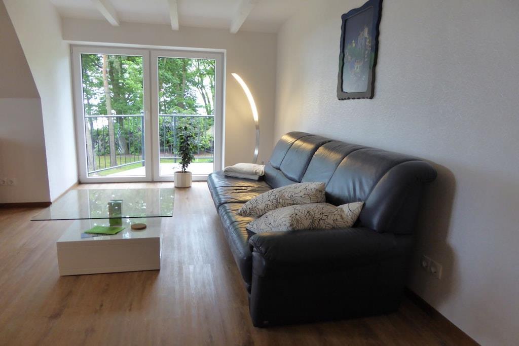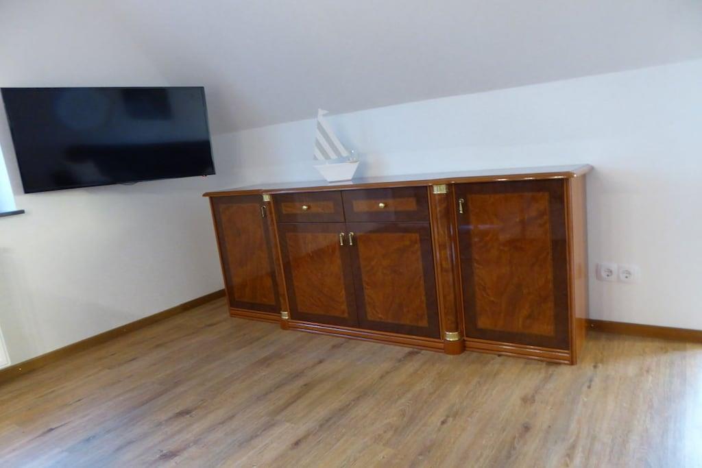 The view from the balcony is indescribably beautiful. You can even enjoy the sunrise over the sea from the dining table. We have completely renovated this house, located directly on the seafront and steeped in history. The tastefully furnished apartment offers everything you need to feel comfortable. A restful sleep is guaranteed thanks to the box-spring bed. The property includes an idyllic plot of land spanning over 5000 m² near the boat dock at Fliegenpilz. The large garden is completely private, making it the perfect place to play, sunbathe, barbecue, or simply relax. Garden furniture and loungers are provided.