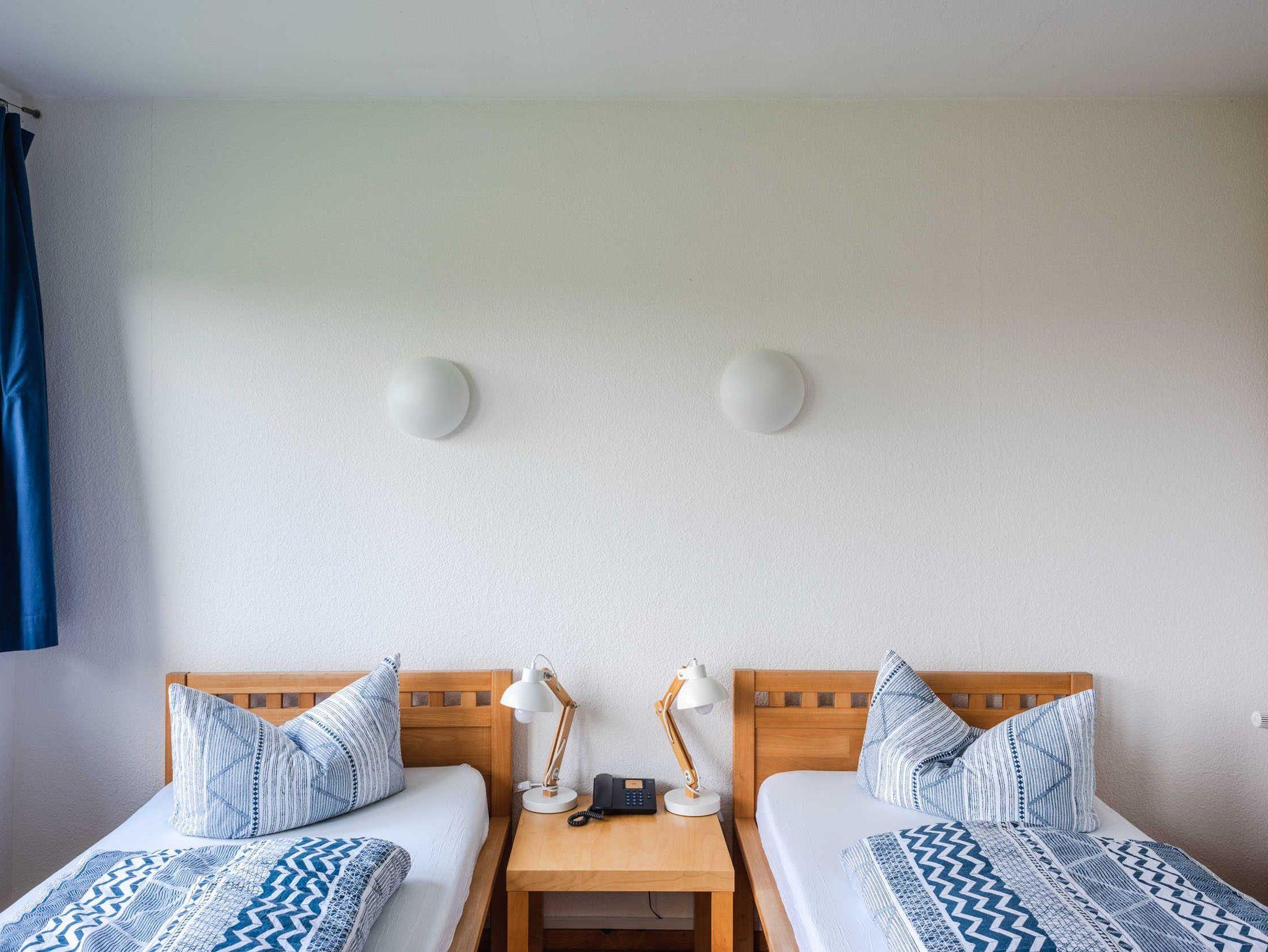 Unser gemütliches Zweibettzimmer ist mit zwei Einzelbetten und einem innenliegenden Bad mit Dusche und WC ausgestattet. Es befindet sich im Obergeschoss eines Öko-Ferienhauses. Die vielen Fenster bieten einen fantastischen Ausblick auf die umgebende Natur. Das Doppelzimmer kann auch als Einzelzimmer gebucht werden.