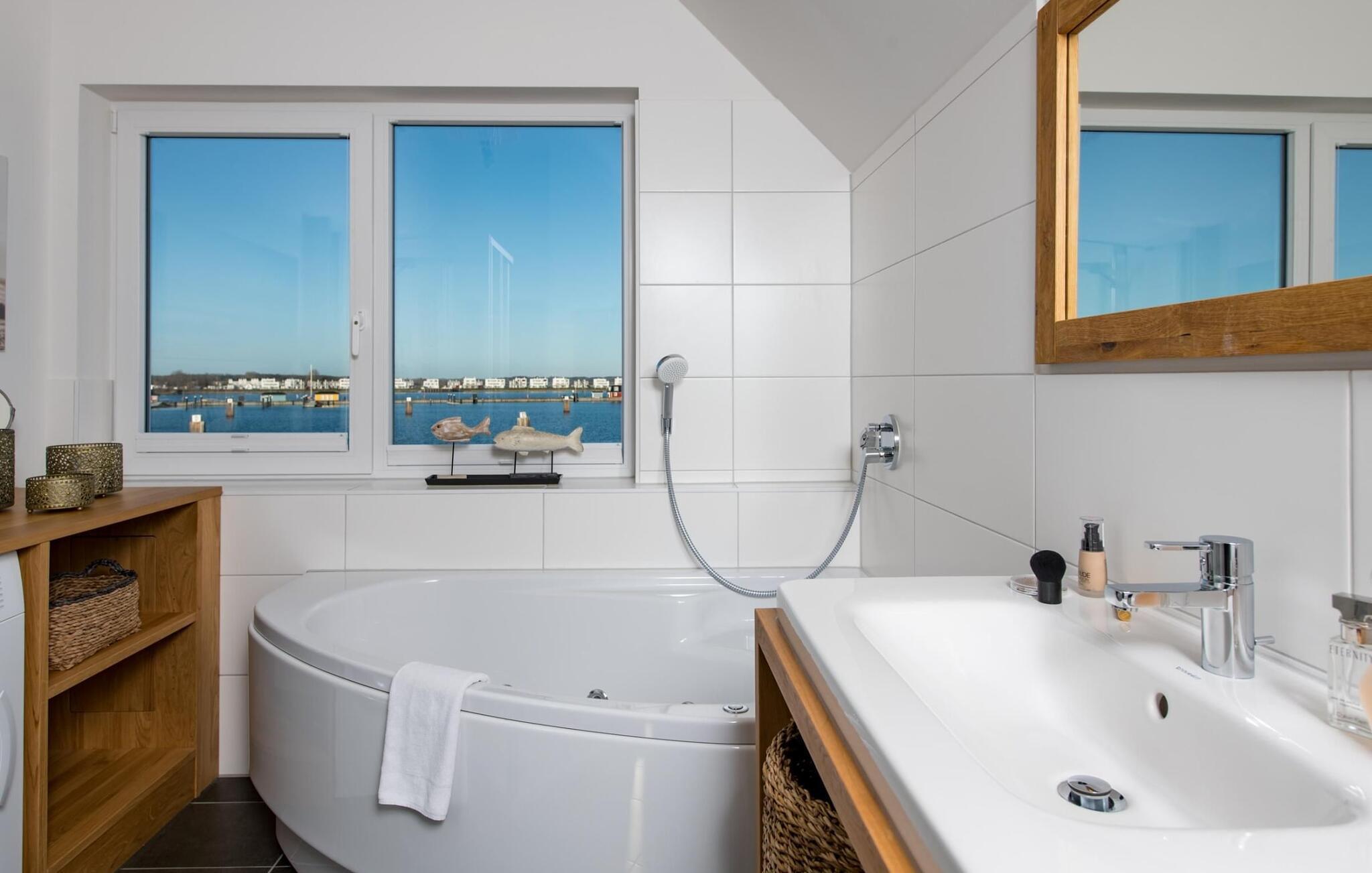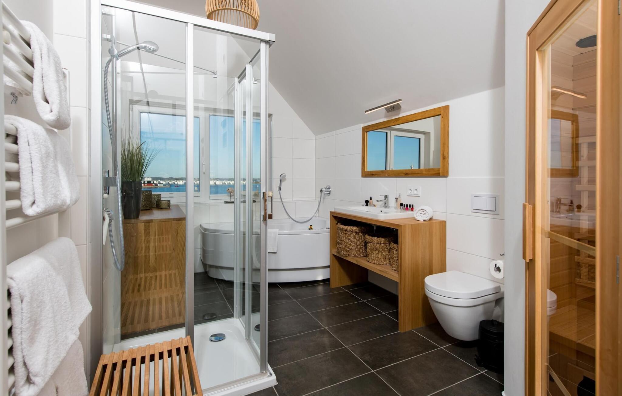 Der private Wellnessbereich lädt zum entspannen ein: Eine Infrarot Wärmekabine mit Hifi-Sound-System und LED-Farblichttherapie sowie eine große Relax-Whirlpool-Badewanne mit Wasserblick stehen nach dem Strandspaziergang bereit.