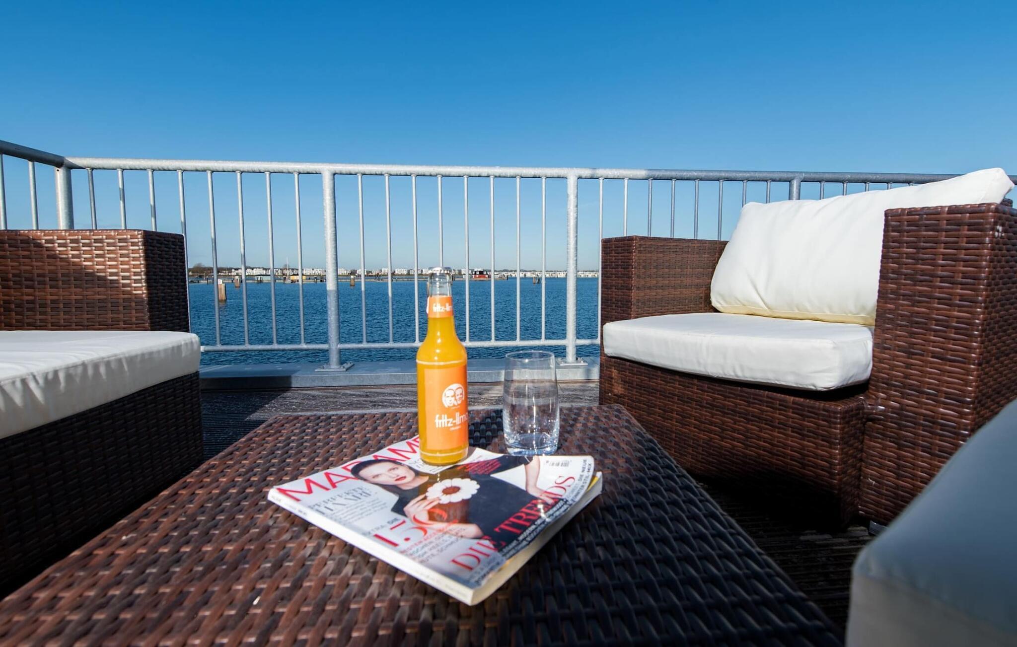 Unser Lieblingsplatz: Feeling New England. Auf der Wasserterrasse den vorbeifahrenden Segelschiffen bei der Hafeneinfahrt zuschauen und bei einer sanften Meeresbrise tiefenentspannen.
