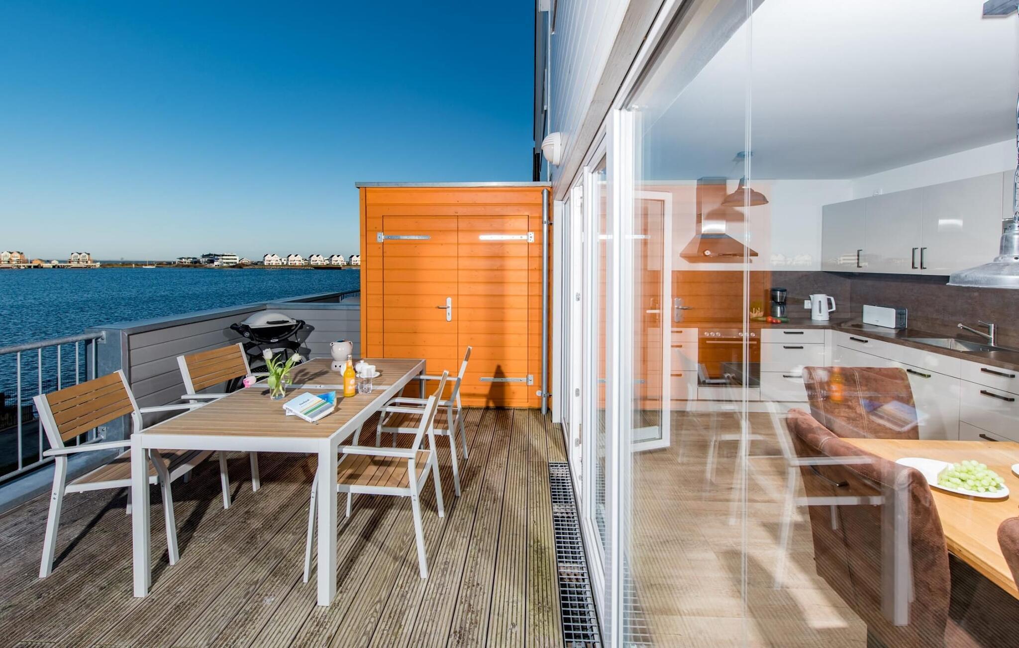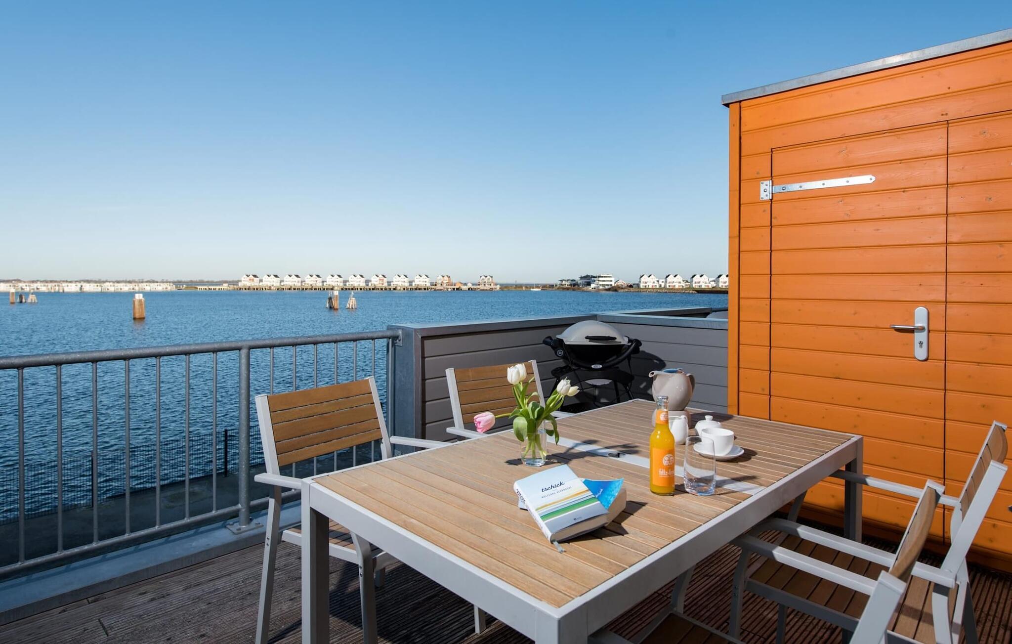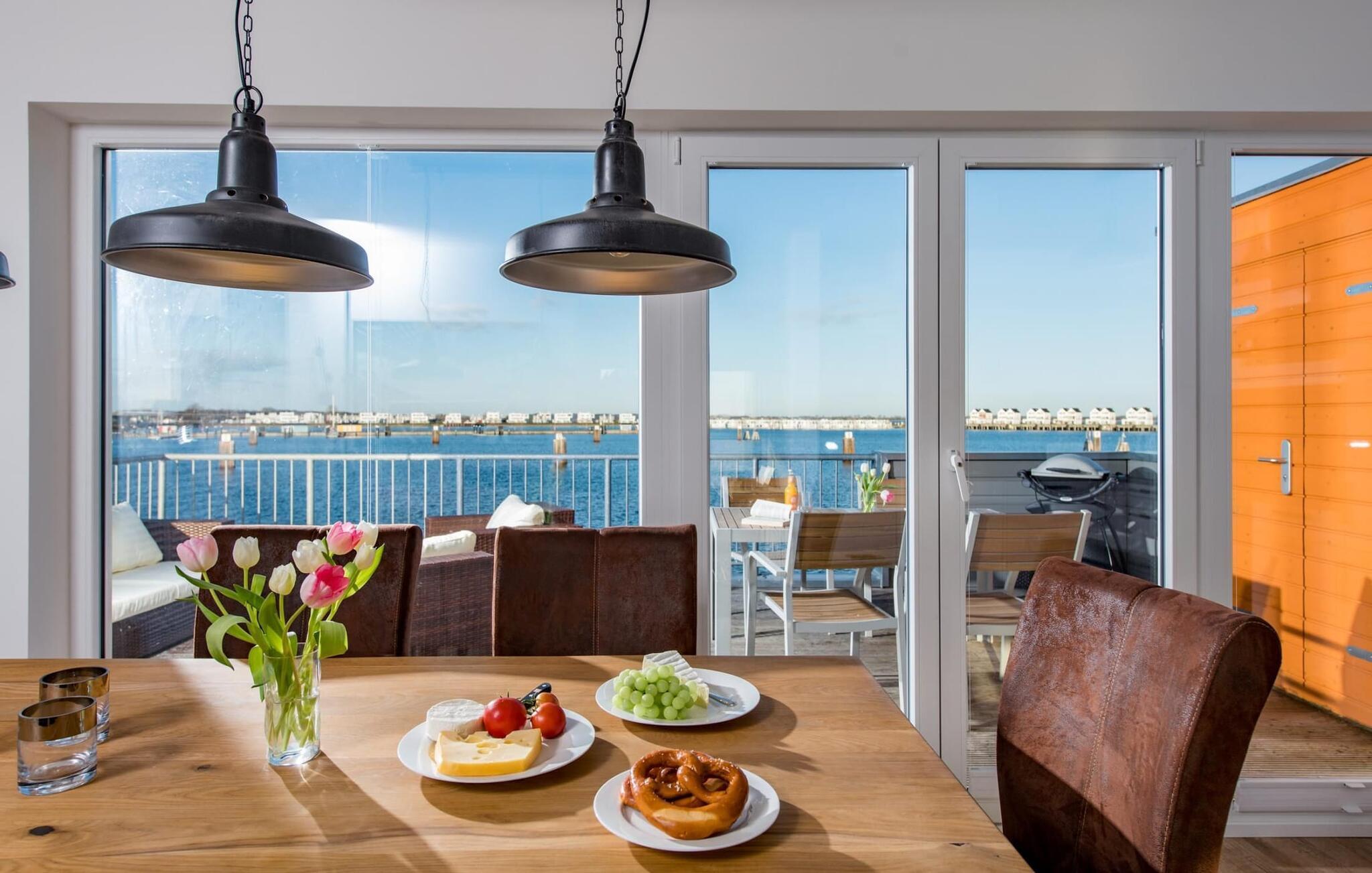 Lichtdurchflutet gestaltet sich der Wohn- /Essbereich des Ferienobjekts mit bodentiefen Panorama-Fensterfronten zu den anliegenden Terrassen auf beiden Seiten. Traumhafte Aussichten eröffnen sich auf der an den Essbereich angrenzenden Terrasse mit Blick über den Segel- und Sportboothafen des OstseeResort Olpenitz. Hafenkino und romantische Sonnenuntergänge sind hierbei garantiert und sorgen für Unterhaltung während einer geselligen Grillrunde.