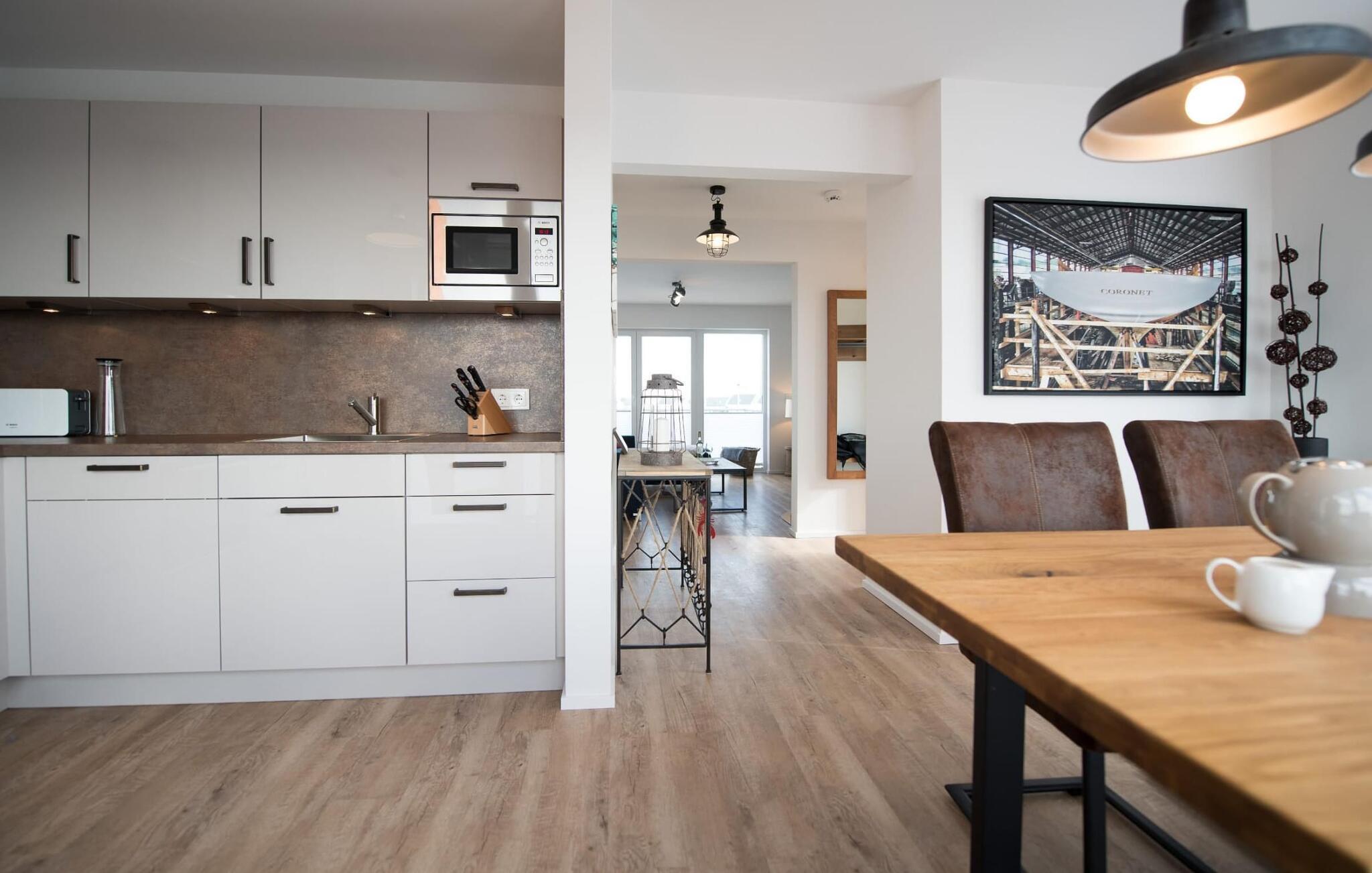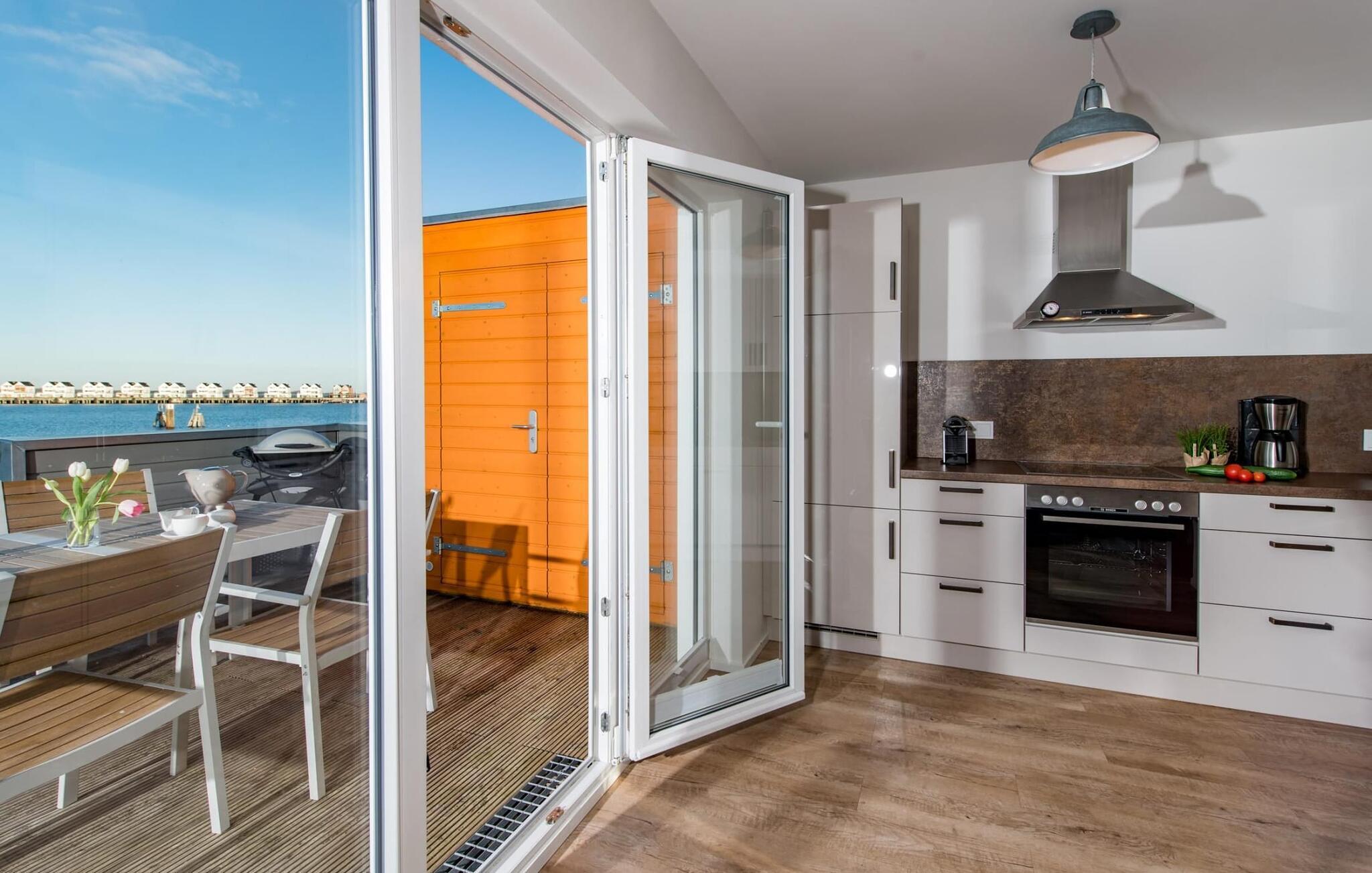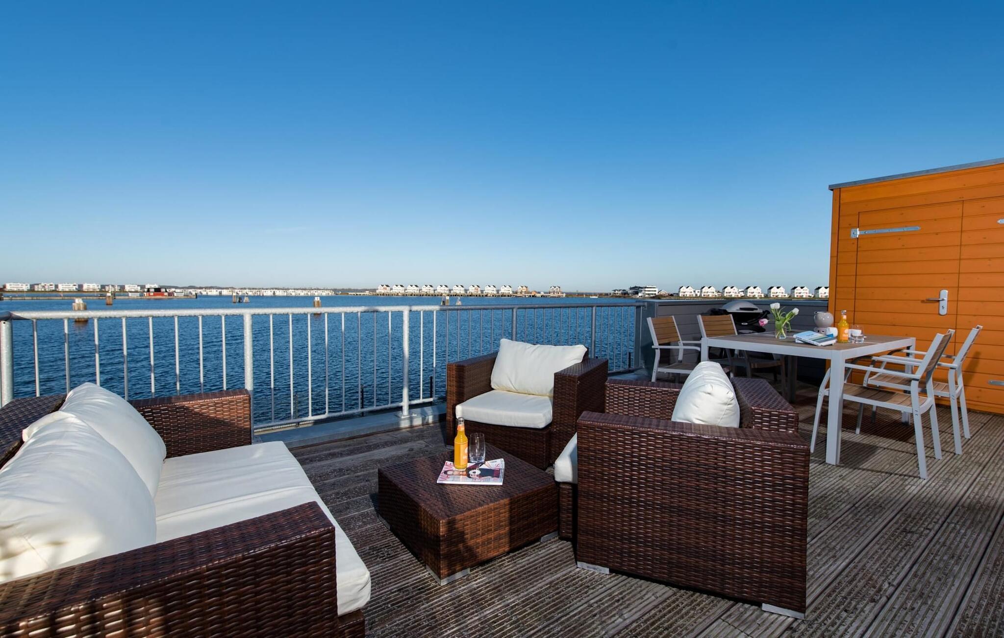 Lichtdurchflutet gestaltet sich der Wohn- /Essbereich des Ferienobjekts mit bodentiefen Panorama-Fensterfronten zu den anliegenden Terrassen auf beiden Seiten. Traumhafte Aussichten eröffnen sich auf der an den Essbereich angrenzenden Terrasse mit Blick über den Segel- und Sportboothafen des OstseeResort Olpenitz. Hafenkino und romantische Sonnenuntergänge sind hierbei garantiert und sorgen für Unterhaltung während einer geselligen Grillrunde.