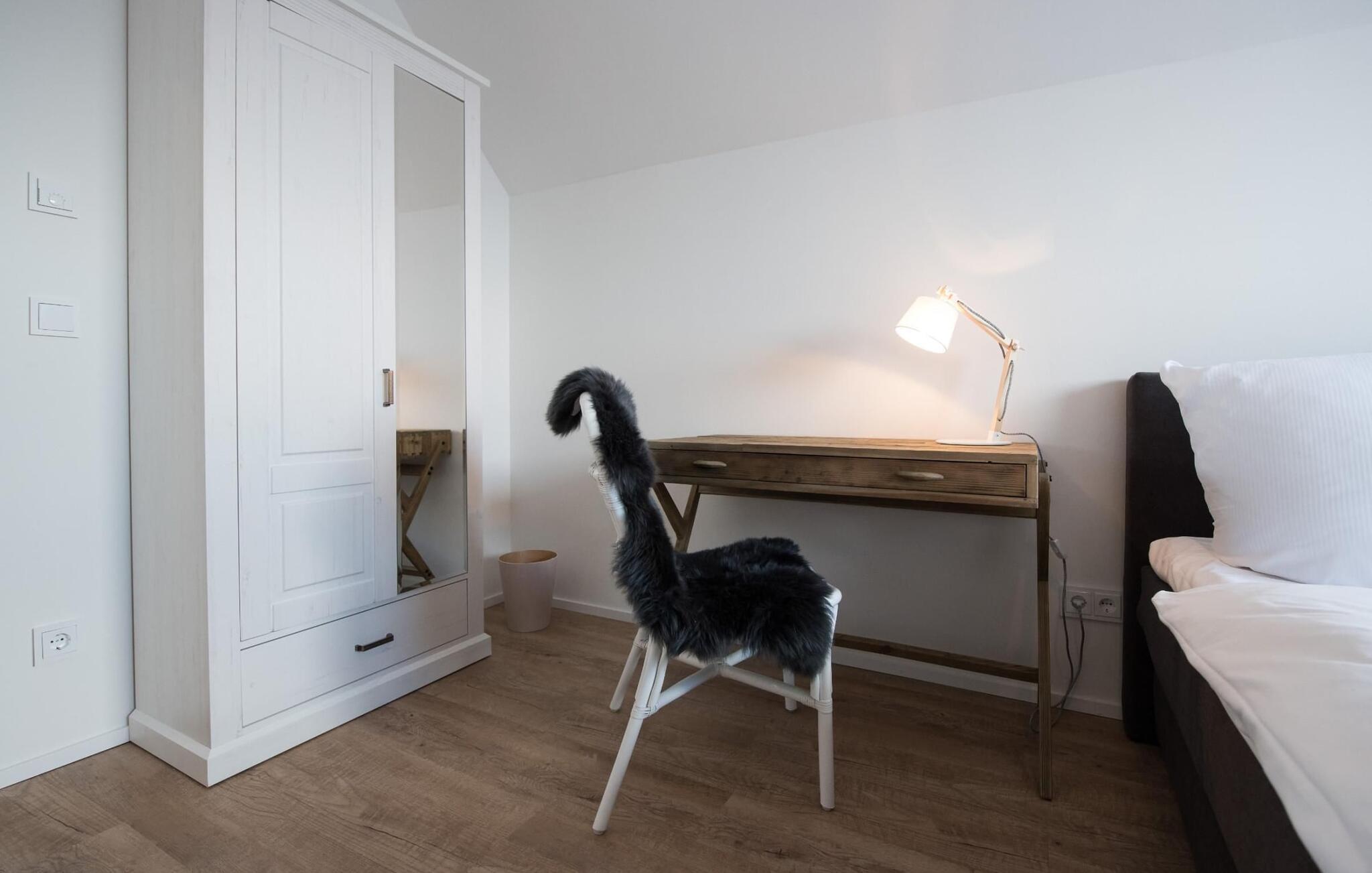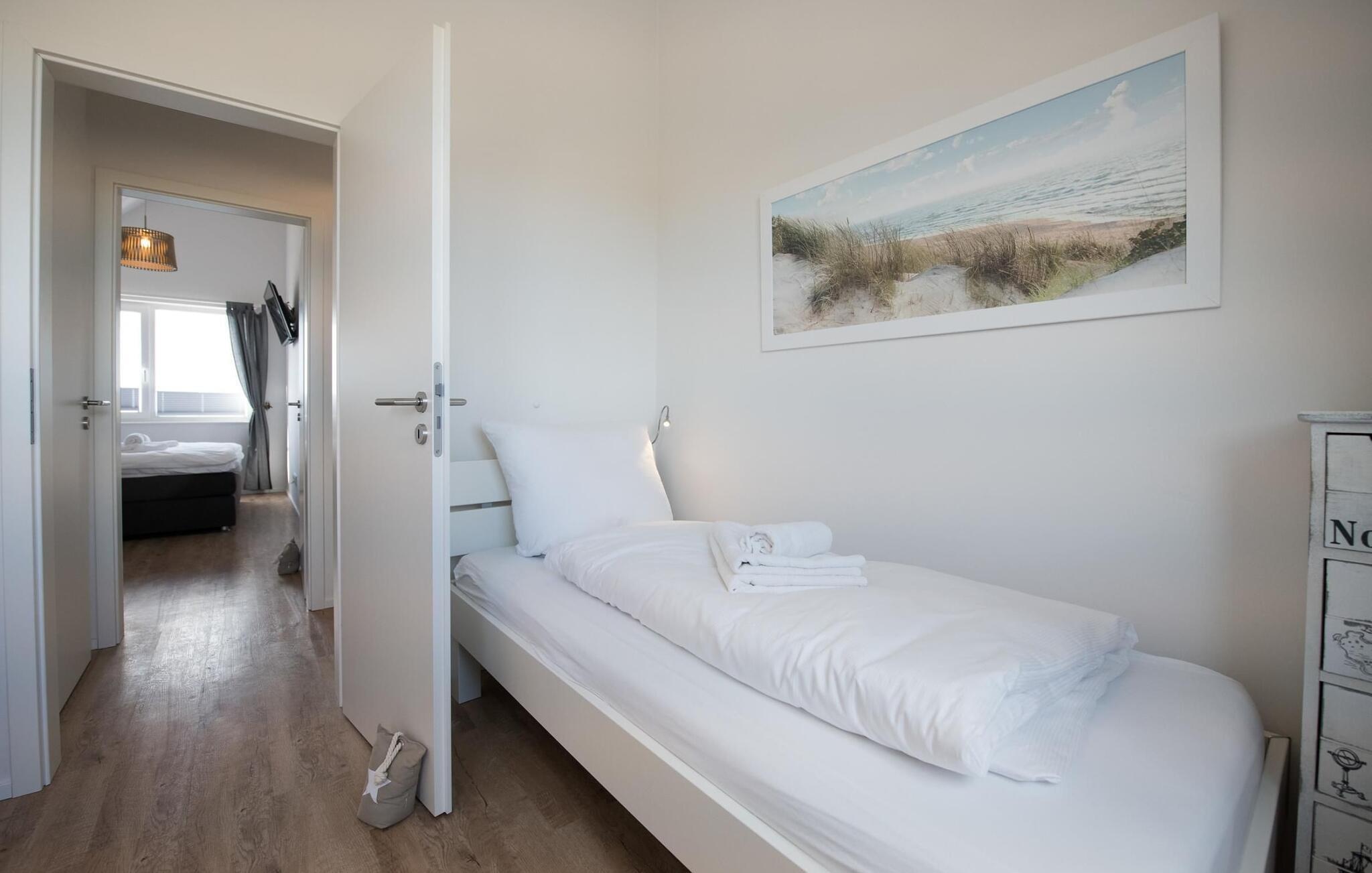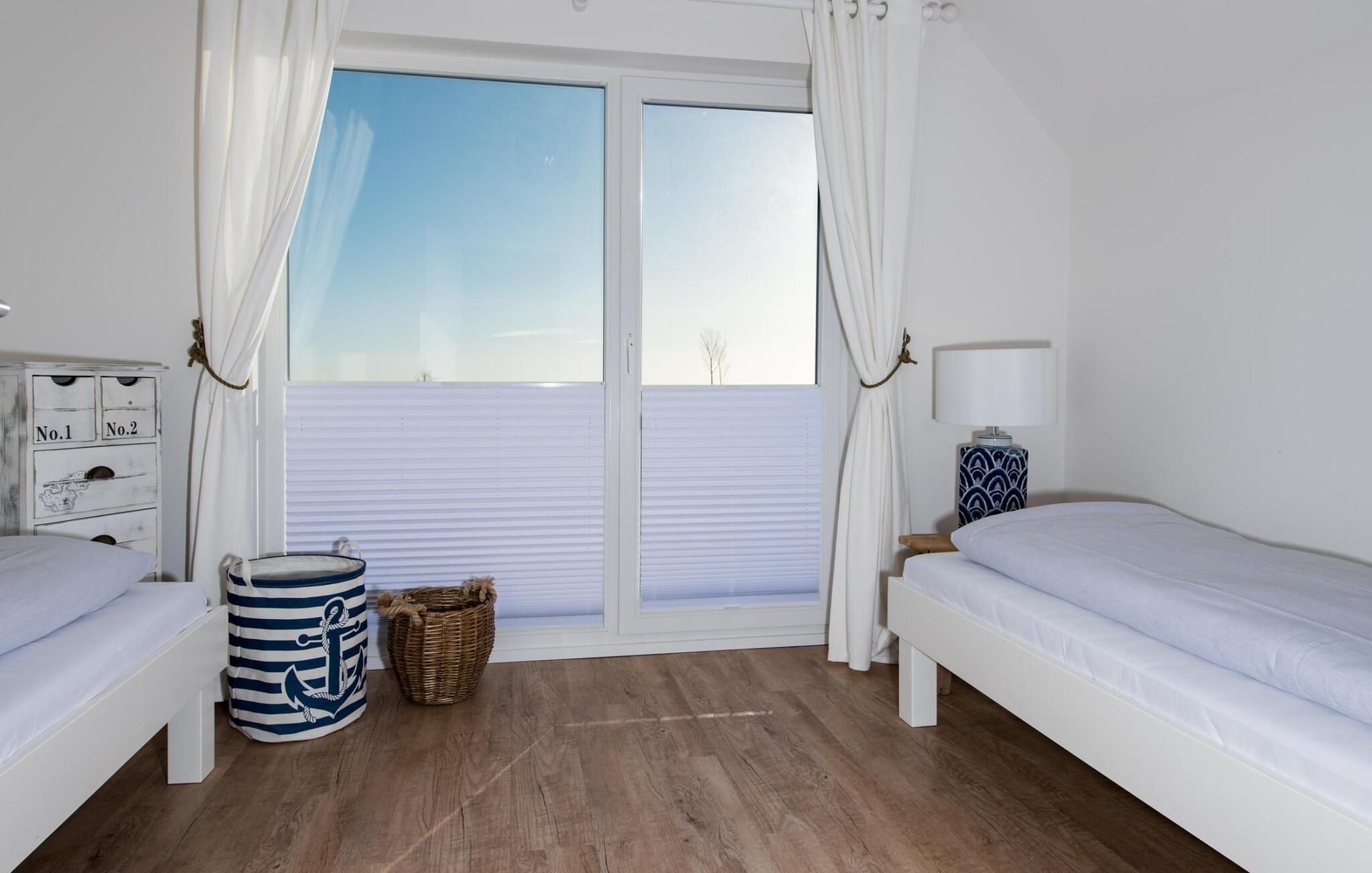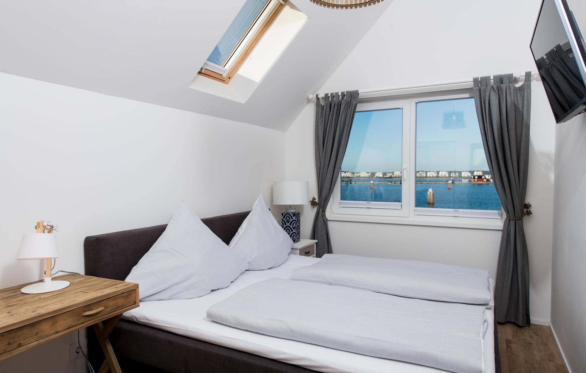 Auf der zweiten Ebene befindet sich der Ruhebereich des Ferienobjekts. Das Hauptschlafzimmer verfügt über einen traumhaften Hafenblick. Einschlafen unter Sternenein Dachfenster erlaubt nicht nur den Blick in den Sternenhimmel, sondern auch in traumhafte Wolkenformationen, die so charakteristisch sind für den Norden. Zwei weitere Schlafplätze stehen auf der komfortablen Schlafcouch im Wohnbereich zur Verfügung.