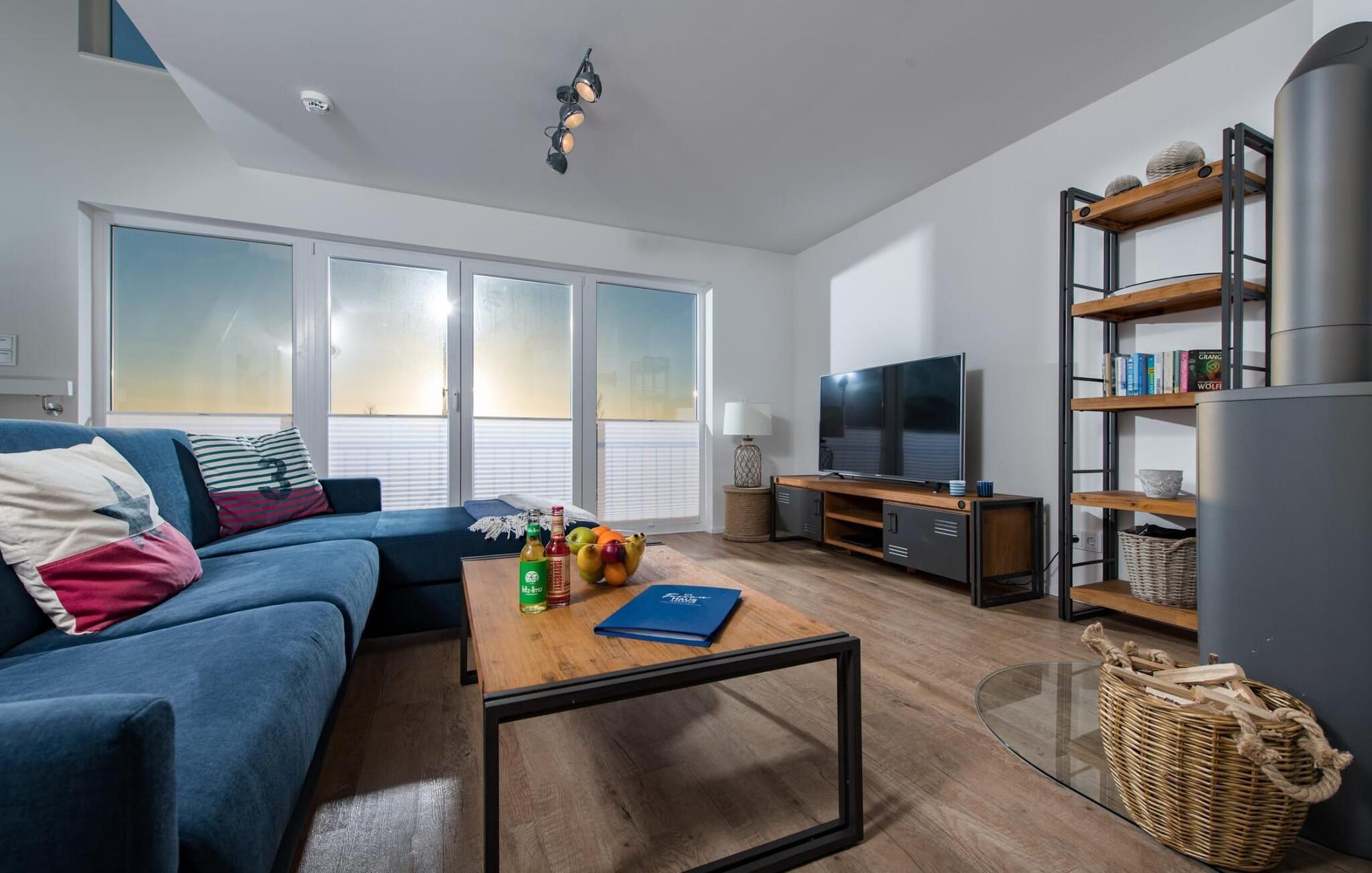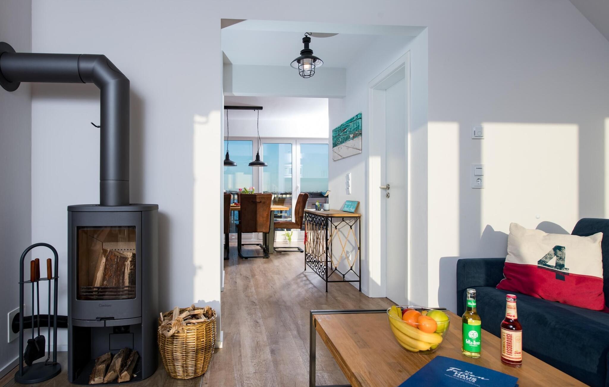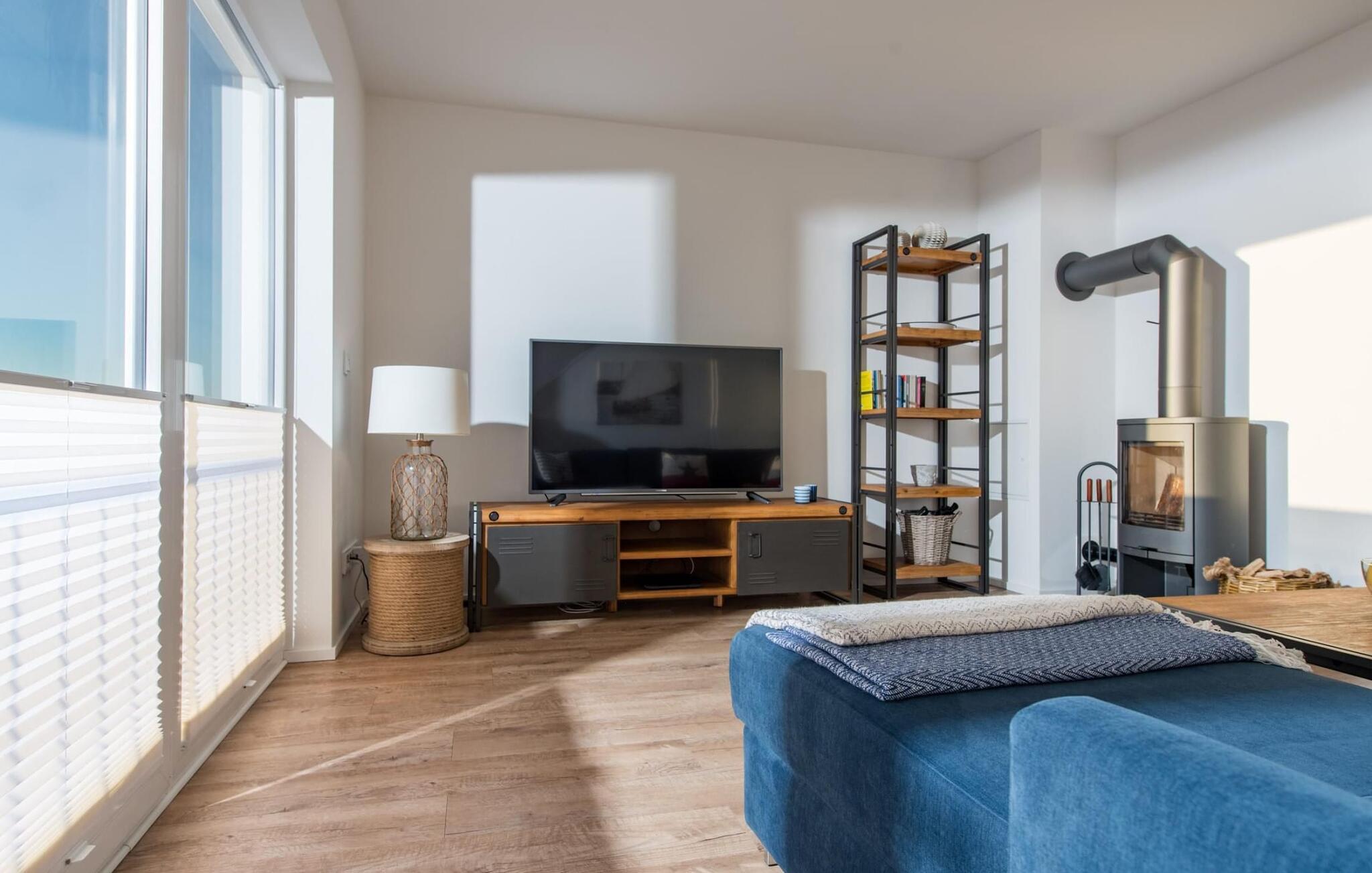 Kuschelig wird es im Wohnzimmer, denn hier lädt eine gemütliche Sitzlandschaft an Schietwettertagen zu einem Kaminabend ein. Für IndoorEntertainment sorgt außerdem der Smart TV mit Telekom Home Entertainment Programm.