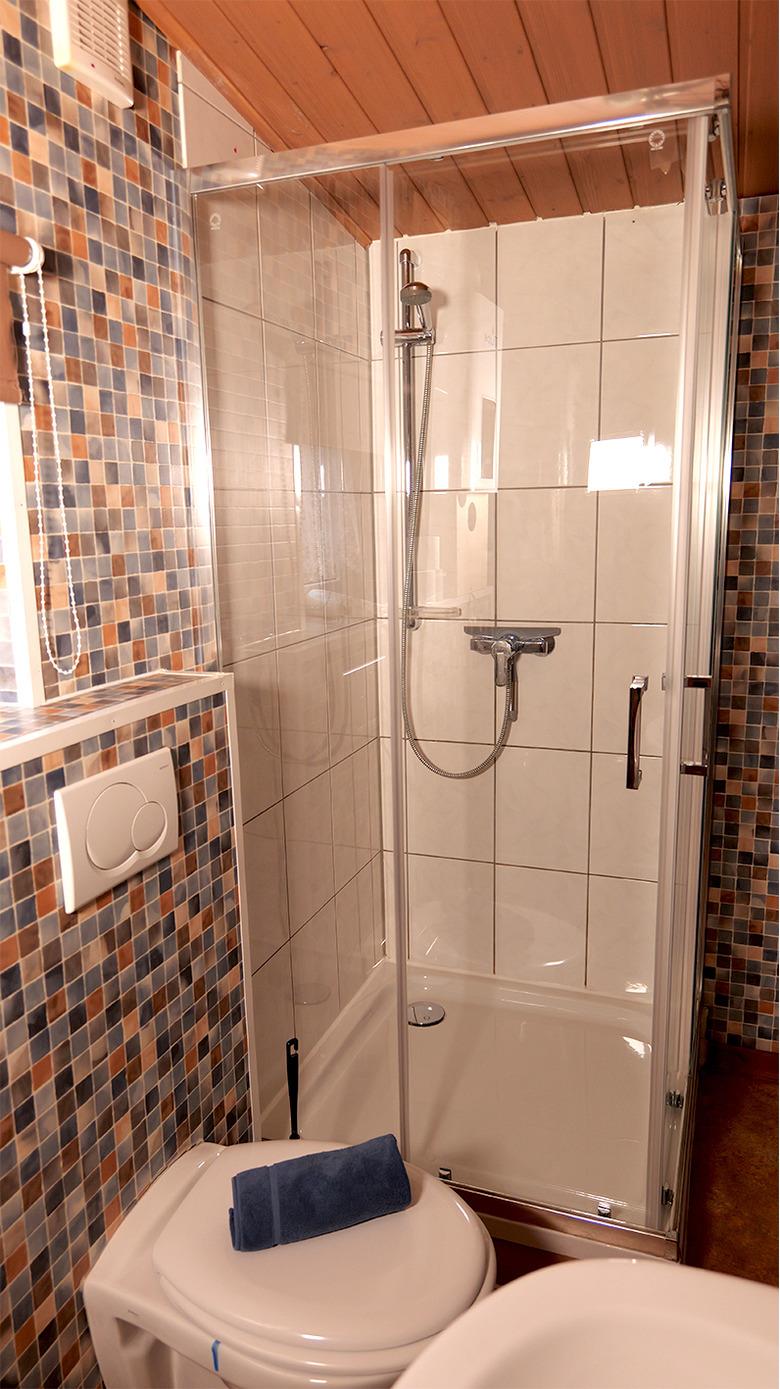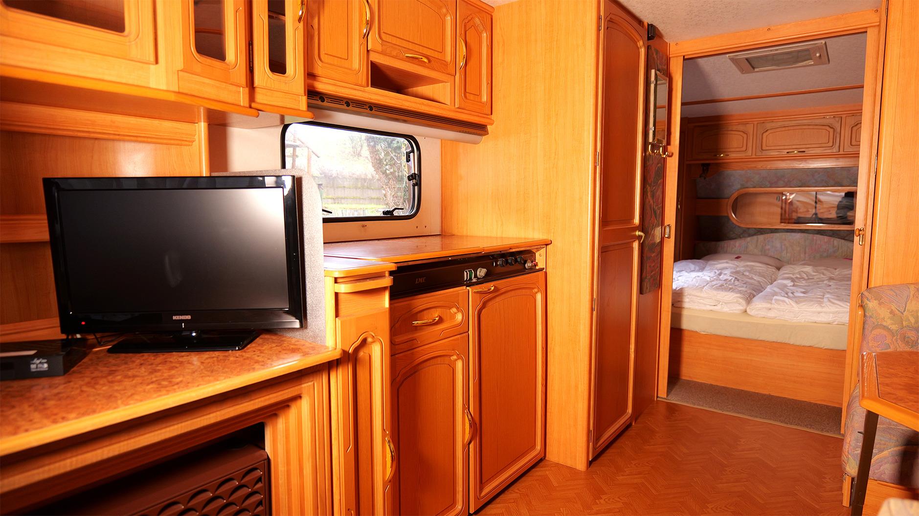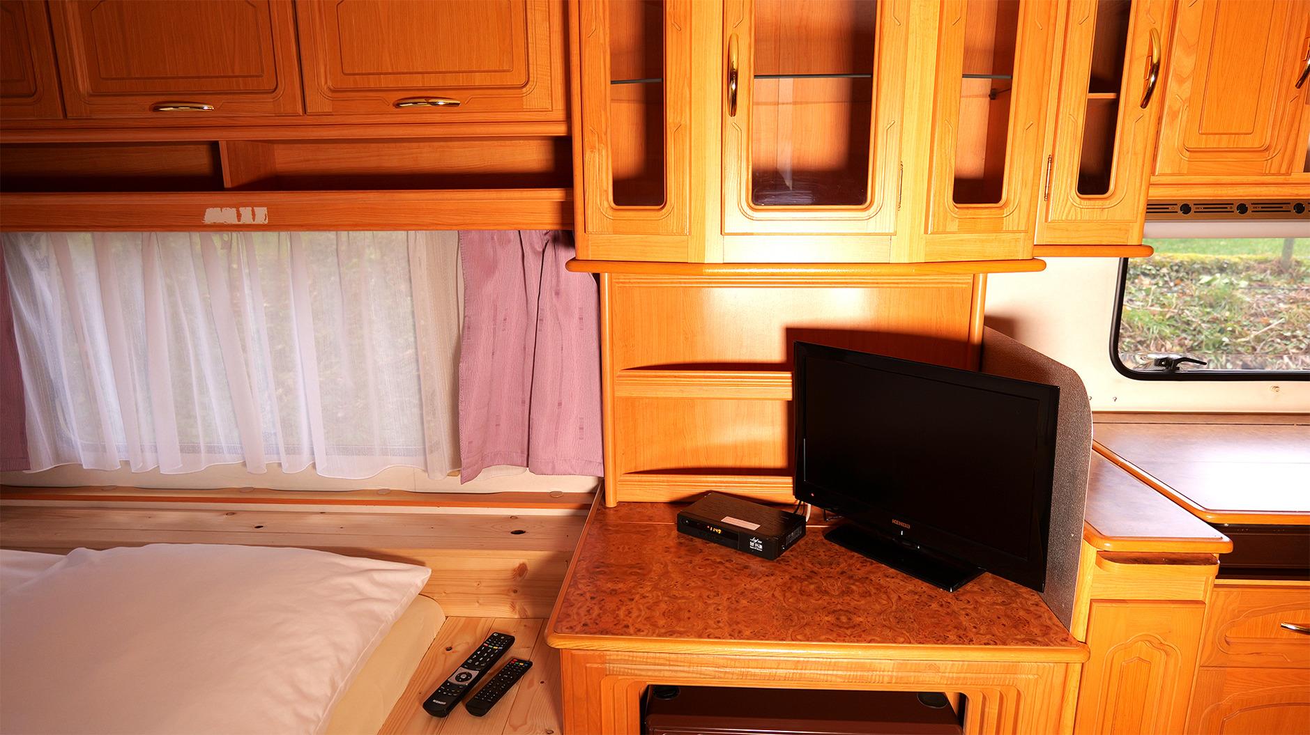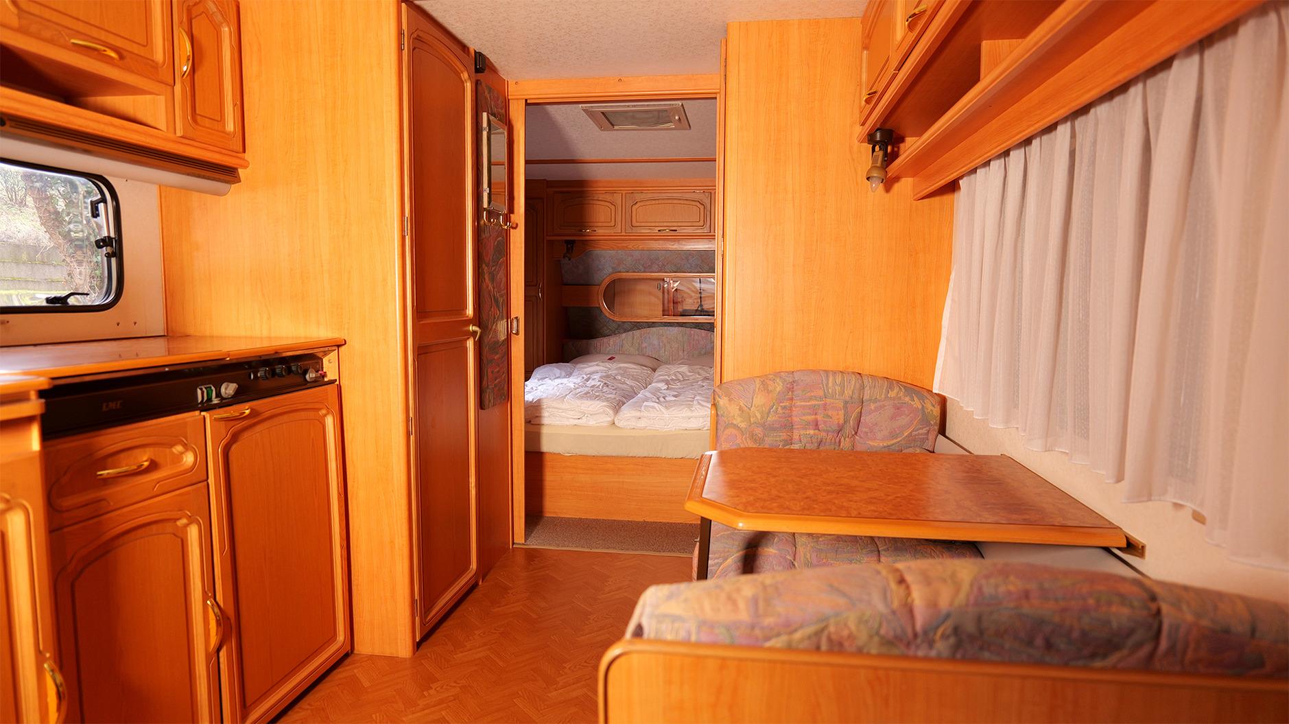 Hier schläfst du komfortabel im Wohnwagen. Dort erwarten dich zwei voneinander getrennte Doppelbetten. Im festen Vorbau findest du eine komplett eingerichtete Küche mit Essecke, ausgestattet mit Koch- und Essgeschirr. Ein TV gehört ebenfalls zur Einrichtung. Ein kleines Badezimmer mit WC, Dusche und Handwaschbecken sorgt für eine angenehme Wohlfühlatmosphäre. Eine Truma-Heizung sorgt dafür, dass es auch in der kalten Jahreszeit schön warm ist. Auf der überdachten Terrasse hast du Sitzgelegenheiten und die Möglichkeit zu grillen. Dein Fahrzeug parkst du direkt am Objekt. Gerne kannst du deine eigene Bettwäsche und Handtücher mitbringen oder sie bei uns dazubuchen.