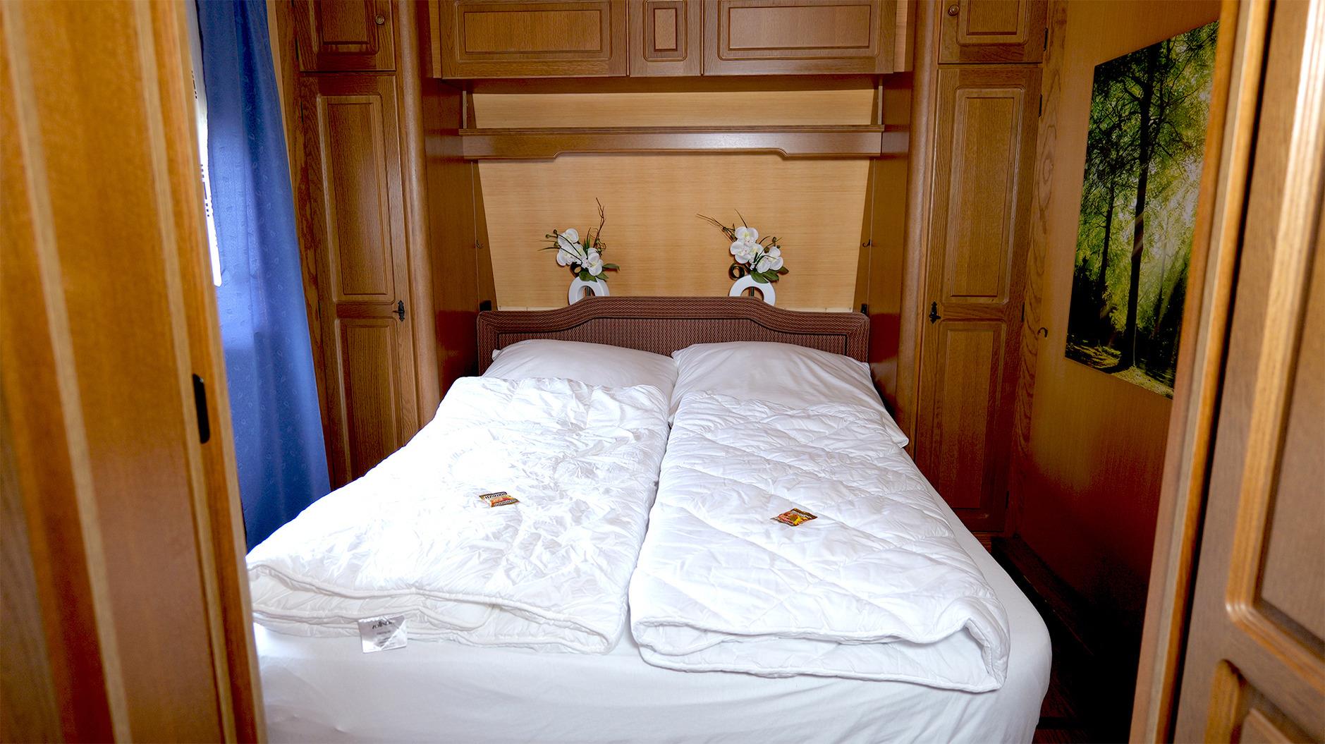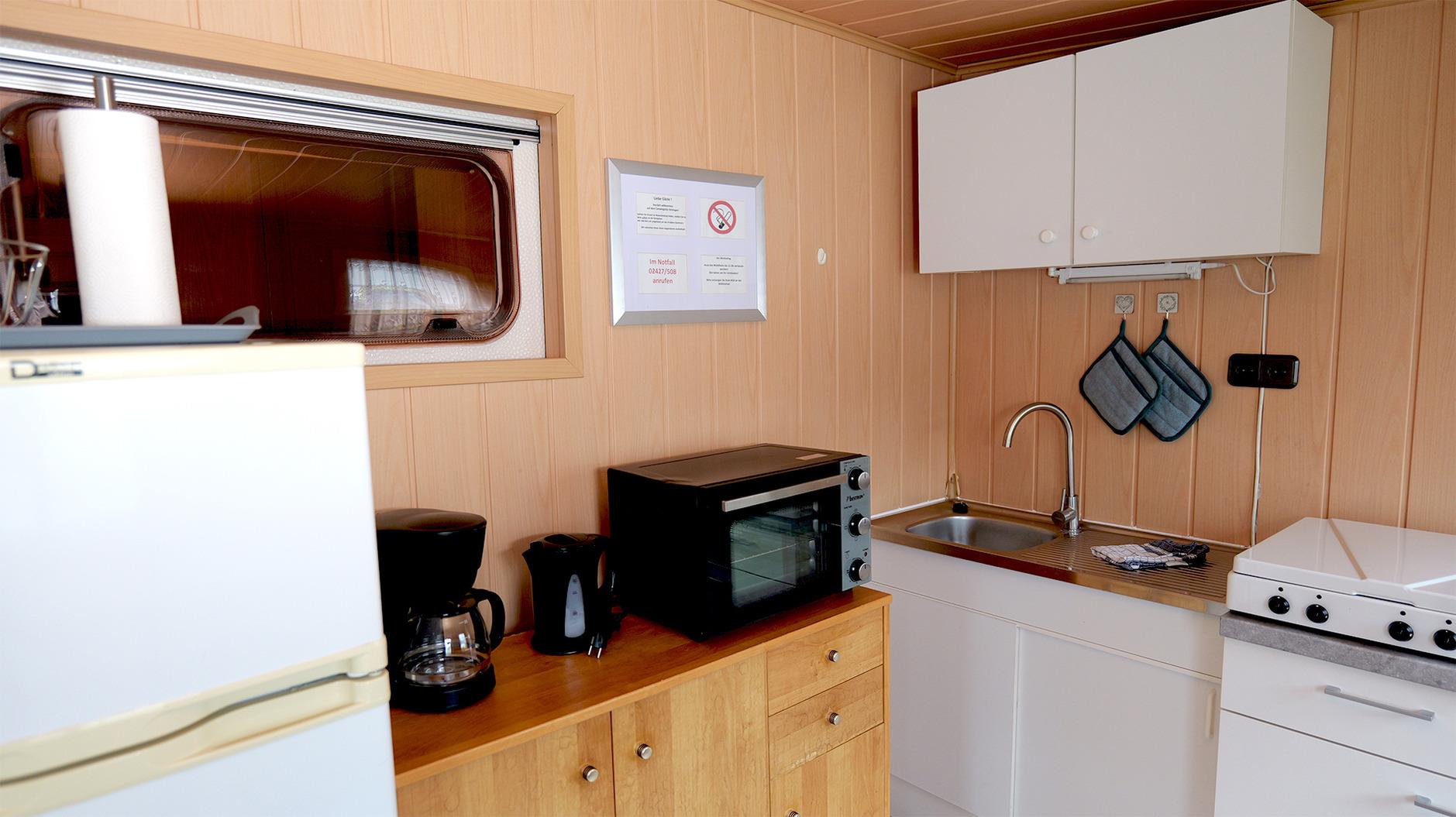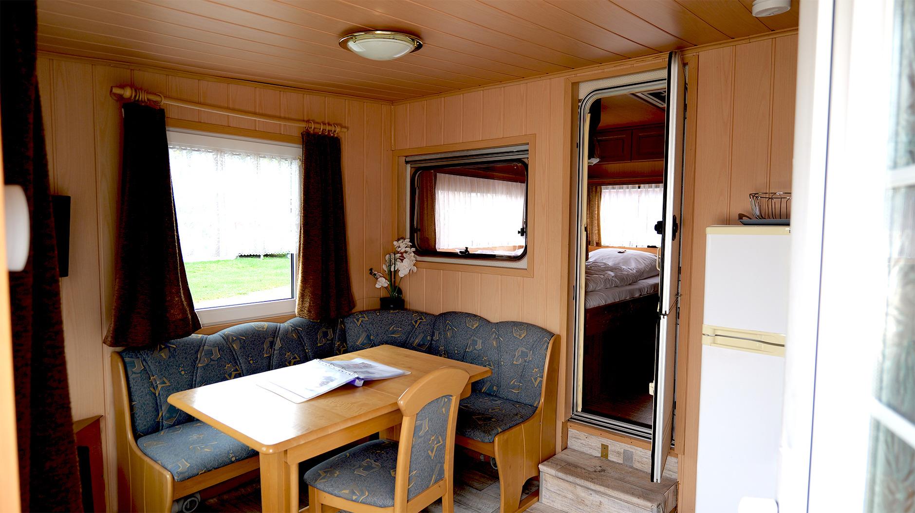 Hier schläfst du komfortabel im Wohnwagen. Es gibt zwei voneinander getrennte Doppelbetten. Im festen Vorbau wartet eine komplett eingerichtete Küche mit Essecke auf dich, ausgestattet mit Koch- und Essgeschirr. Ein TV gehört ebenfalls zur Einrichtung. Ein kleines Badezimmer mit WC und Handwaschbecken sorgt für eine angenehme Wohlfühlatmosphäre (Duschen kannst du gegen ein kleines Entgelt in unseren Campingeinrichtungen). Eine Heizung sorgt dafür, dass es auch in der kalten Jahreszeit schön warm ist. Unter einem Pavillon findest du gemütliche Sitzgelegenheiten, wo du auch grillen kannst. Dein Fahrzeug parkst du direkt am Objekt. Gerne kannst du deine eigene Bettwäsche und Handtücher mitbringen oder sie bei uns dazubuchen.